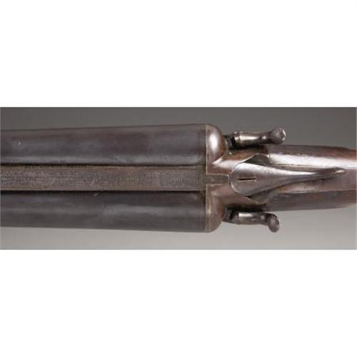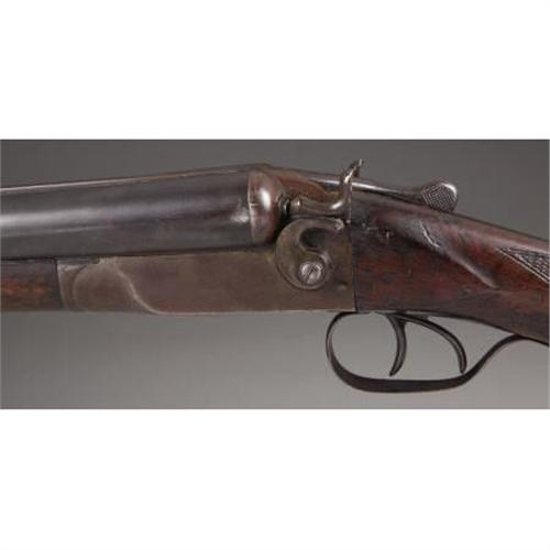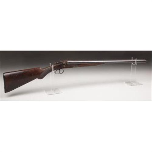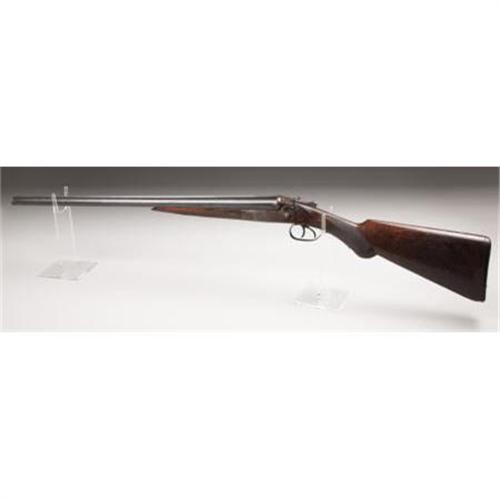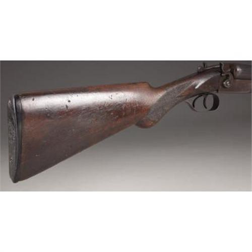 <B>WELLS FARGO EXPRESS CO. MARKED DOUBLE-BARREL ITHACA SHOTGUN Serial #227237 CIRCA 1880s</B></I> - 24” 12 gauge barrels. Bag style pistol grip with checkering. Ithaca hard rubber butt plate with logo. Trigger guard stamped “W.F. & Co. Ex. #753.” This is a very attractive freight company shotgun, a real plus to a Western Collection.<BR><BR><B>Condition:</B></I> Strong blue on barrels. Action and trigger guard a pleasing brown patina. Numerous marks and nicks on stock. Small chip on right side of stock near frame and toe at butt. We have not been able to verify the Wells Fargo markings on the triggerguard.<BR><BR><b>Shipping:</b> Bats, Clubs, Sticks, Swords, Rif (<a target="_blank" href="http://www.heritageauctions.com/common/shipping.php">view shipping information</a>)