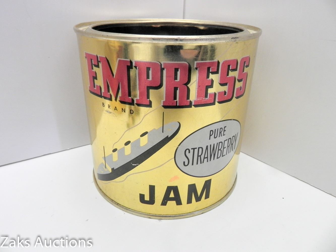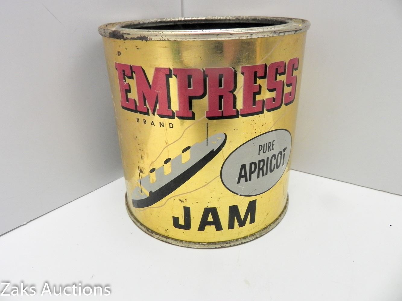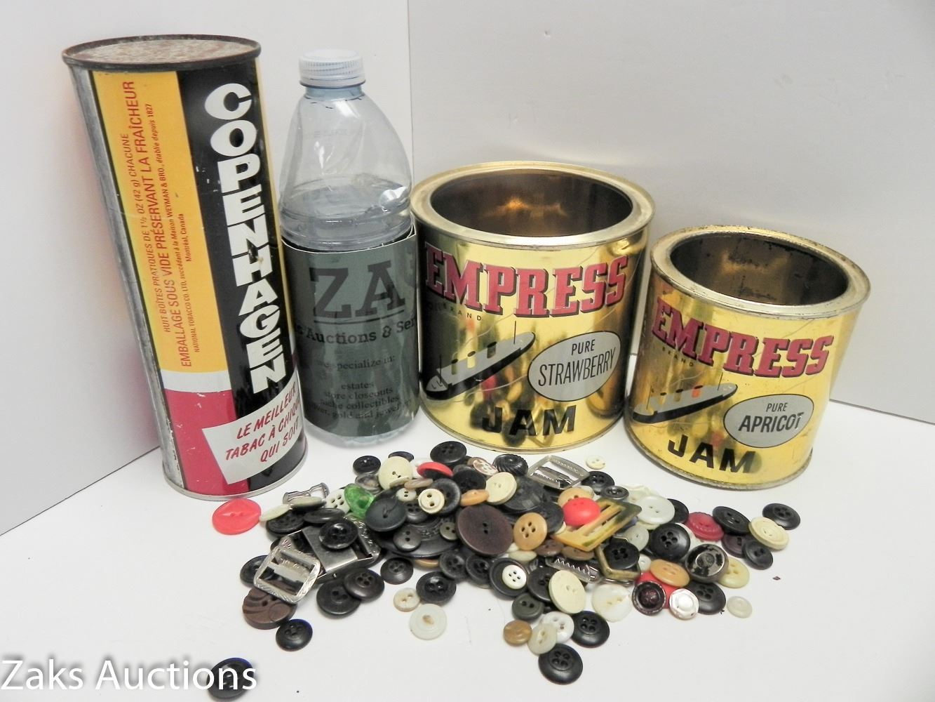 EXPRESS PURE STRAWBERRY JAM WITH VINTAGE BUTTONS, EXPRESS PURE APRICOT AND COPENHAGEN CHEWING TOBACCO TINS - NO LIDS