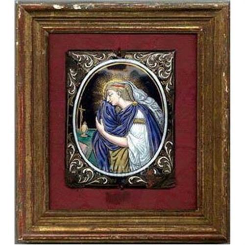 Extremely scarce work of Art - this religious enameled plaque is mounted on fabric covered board and framed. Some enameling is missing in the corners and edges of this breathtaking piece. This plaque has been authenticated in the mid 80's by Leslie Hindman Auction House in Chicago - and attributed to France, Limoges School of late 17th - early 18th Century. Pictured is frontal view, back and detail of the plaque. Dimension : 7 3/8"H x 6 3/4" W. Some photos are automatically reduced, so if you need to see larger, more detailed pictures or more photos we may have, please email us () Please note that only bids at or over $1900 will be succesfull and meet our reserve....