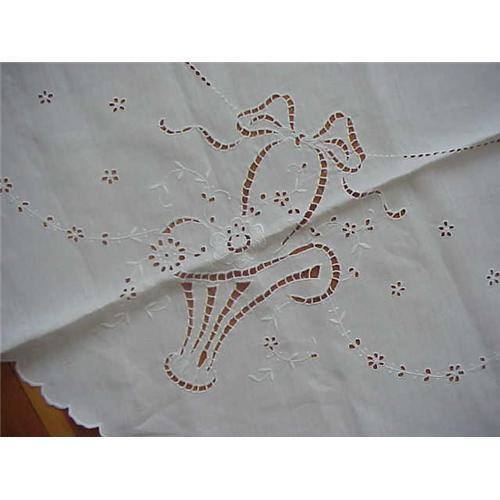 Beautiful fine linen fancy tablecloth from the 1920s-30s, directly from a great estate. This is a fabulous Madeira cloth with exquisite handwork. This charming tablecloth measures 51 inches by 50 inches, perfect for a round dining table or smaller table. The condition is wonderful with only a few small stains(untreated) they are minor and not detracting otherwise its just fine. Its a sparkling white linen with tons of openwork and hand embroidery work. A beautiful addition to your collection of antique lace and linens.