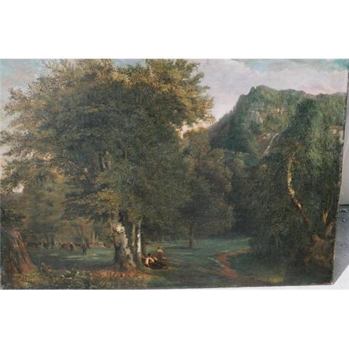 One of the most gorgeous, lush, green, Barbizon original oils I have ever seen, signed and dated lower center "C.Schneider, 1851"...Men in a field tending their cattle with ladies taking respite under a large tree. mountain ridge to the right with stream cascading down the hill, blue and white sky above and a thousand individually painted green leaves on the numerous trees which are the real stars of this impeccably crafted ninteenth century masterpiece!! Amazing work in restful blue greens and evergreen, a substantially sized piece which will be even more imposing with the addition of a handsome 3 or 4 inch moulded gilt or carved wood frame!! Relined in first half of the twentieth century...Very good condition. A great buy and hold opportunity...Thanks for looking, Chas.