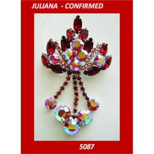 For sale I am offering a gorgeous confirmed D&E ~Juliana~ Aurora Borealis and Red Rhinestone Dangling Brooch. WOW, this is one of the prettiest Juliana Brooches I think! Each Aurora Borealis stones sparkle and every rhinestone sparkles. It does not matter the lighting, it shines. The red rhinestone is a deep red color. All the stones are prong set in silvertone. The back has an excellent silvertone finish with no wear whatsoever. The pin is tight and has a working clasp that locks securely. It has 4 dangles coming off the top of the brooch. When worn, you?d get a ton of compliments. You could wear just about all year round. I enjoy looking at it when I walk by it!
