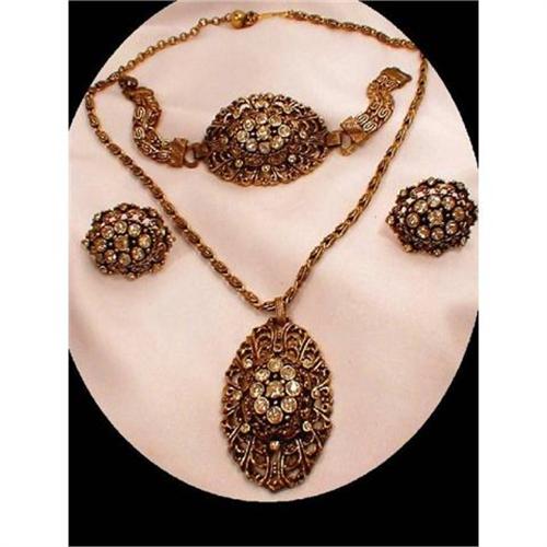 This set has the arched bracelet, choker and matching earrings. Even prettier in person this has a lot of attention to detail with circles of rhinestones and pierced gilt metal work The center piece of the bracelet is arched so it fits well on your wrist and it has intricate chain that wraps around your wrist at 7"long. The necklace will go up to 16" long with an additional 2" long drop that matches the bracelet. The raised metal work on this is absolutely gorgeous. The earrings are 1 ¼" long and clip . This vintage set is in excellent condition and really well made.