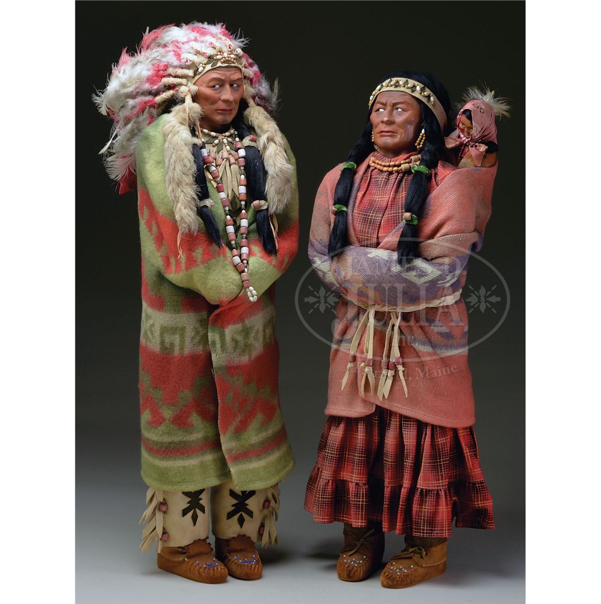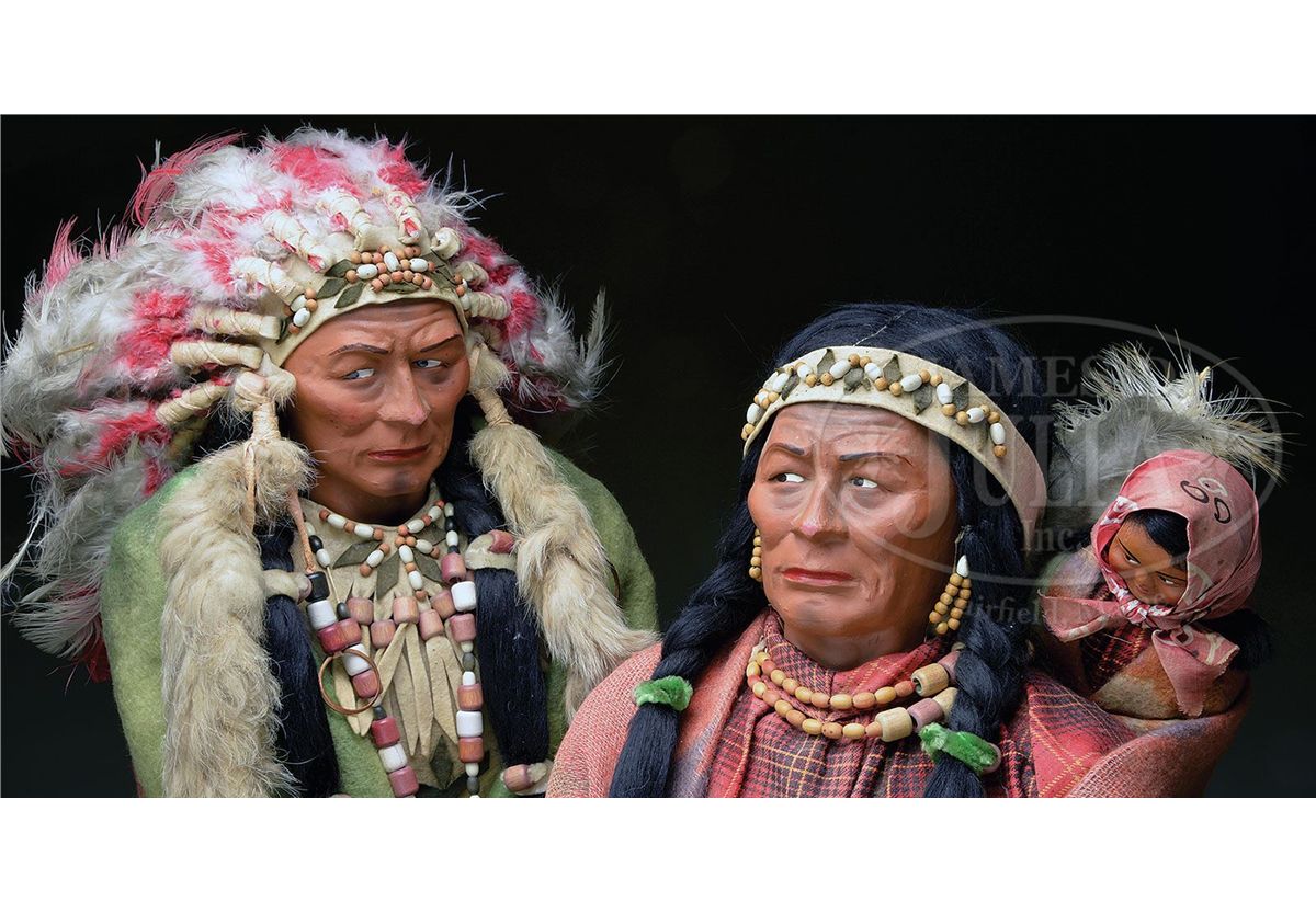 Exceptional pair of Indian Chief and Squaw from 1940s which were most likely for store display. The man has a headdress with a fox tail, a beaded necklace, green and red blanket. The Squaw with long braids has a red and blue blanket, a red patterned skirt, a beaded necklace with papoose on back. Both are wearing extremely fine leather moccasins. SIZE: 36". CONDITION: Near excellent. 1-13156