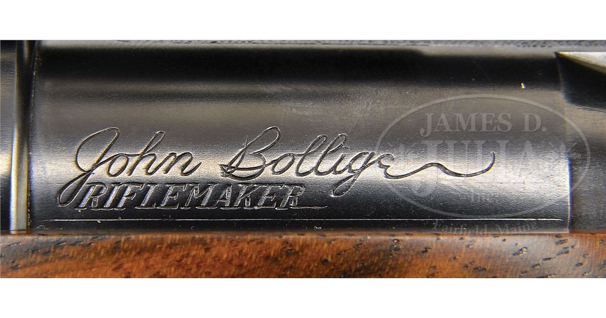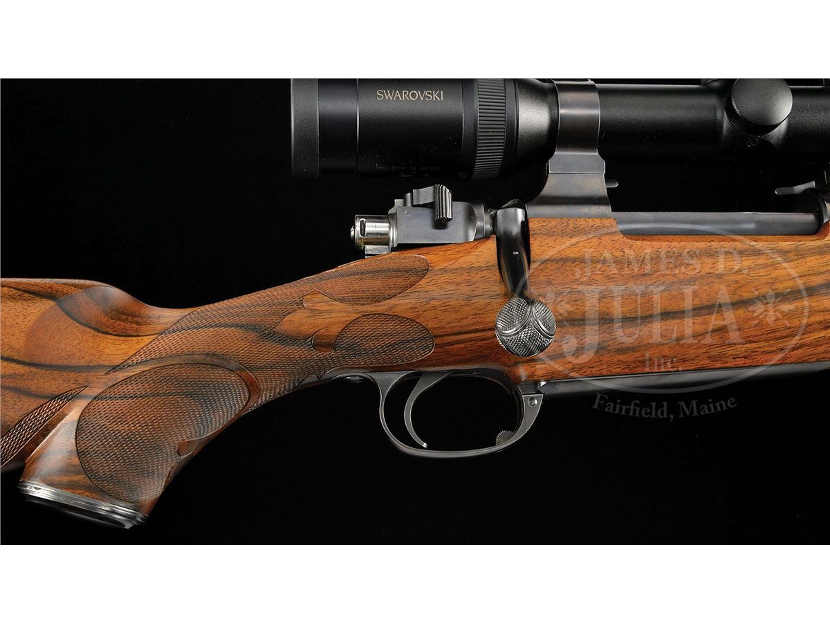 SN 8489. (Found on bottom of receiver ring behind recoil lug and in cocking piece runway) Cal..416 Rem. Mag. 22" Medium weight round sporter bbl features integral quarter rib, recoil lug, sling eye, and ramped front sight base. Nicely matted quarter rib mounts one standing, one folding leaf express rear sight with inset gold triangles marked for 50 and 250 yards. Front ramp is matted in matching manner, and is fitted with longitudinally dovetailed bronze bead front sight with porcelain flip-up night bead, and nicely knurled slip-on sight protector. A 2-1/2" long 7/8" diameter muzzle brake (every PH's nightmare) attaches to threaded portion of muzzle. Also included is an auxiliary cover to be used when brake is removed. Rear of bbl is engraved with caliber and makers name. FN Mauser action has custom integral square bridge and receiver ring expertly and cleanly added. These squares receive Warne type dovetailed scope rings. Plugs are provided to fill these dovetails when scope not in use. A commercial trigger has been installed. Bolt stop has knurled oval island thumbpiece. Bolt body has been nicely engine turned. Straight bolt handle with pear shaped knob is expertly checkered with four teardrop panels and square base. Custom bolt shroud with Model 70 type three position safety, has been fitted. Bottom metal is Blackburn type with drop box and hinged floorplate having release in trigger guard bow. Follower is engine turned and engraved with caliber. Well figured and beautifully streaked flesh-toned European walnut stock is cleanly sculpted in classic style, with swept right hand cheekpiece, raised bead around bolt stop, and oval island base for rear sling eye. Borderless fleur-di-lis checkering has ribbons and fleur-di-lis in pattern, and is exceptionally well done. Stock also features ebony forend tip, right hand palm swell, black "Decelerator" pad, and steel trap grip cap with swiveling top portion giving access to trap, which contains spare front sight. Swarovski 2.5 - 4 x 24 Habicht scope with three heavy post and crosshair reticle, is in Warne type QD rings. Drop at heel: approx 1-5/8", drop at comb: approx 1-5/8". Weight with scope and muzzle brake: 9 lbs. 14 oz. LOP: 13-7/8". PROVENANCE: Mountain Riflery Certificate of Authenticity. CONDITION: Excellent. Essentially as new, showing only a few minor rubs on very fine rust blued surfaces, and one or two of the faintest marks in wood finish, checkering slightly darkened at grip. Bore is excellent. Action is smooth and crisp. Scope finish has one or two faint marks. Optics are clear. A very fine rifle by this highly regarded maker. 4-47337 MGM2