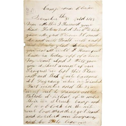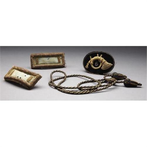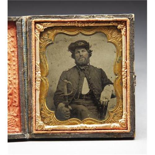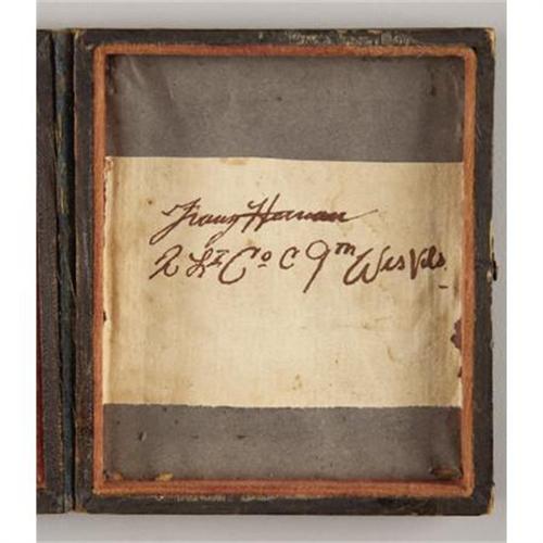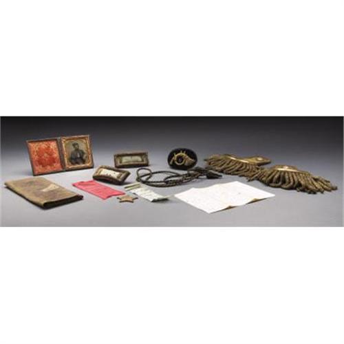 <B>EXTENSIVE GROUP OF CIVIL WAR PERIOD ITEMS THAT BELONGED TO LIEUTENANT FRANZ HERMAN 9TH WISCONSIN INFANTRY</B></I> Herman mustered into the 9th Wisconsin as a sergeant on October 10, 1861 at Green bay and was promoted to 2d Lt. of Company F on April 18, 1862. He resigned as 1st Lt. of Company C on June 29, 1864. the 9th Wisconsin became part of the Army of the Frontier and was engaged throughout the western theater including the battle at Prairie View, the Red River Campaign and on several instances in actions against hostile Indians allied with the Confederates. The regiment lost 77 enlisted men killed in action and 114 men to disease. The grouping includes the following items: 1/6 plate seated tintype portrait of Herman wearing frock coat with straps, gauntlets, Burnside hat with plume and, oddly holding what appears to be a M1840 artillery officer’s saber. A period ink script note is behind the image glued to the original case “Franz Herman 2 Lt. Co. C 9th Wis. Vols.”, really wonderful ID. Yellow silk backed bullion epaulettes with brass crescents retaining the original eagle I buttons with “Extra Quality” back marks. Black silk and bullion woven hat cord with acorn finials. His set of 2d lieutenant of infantry shoulder straps with light blue wool centers and gauze backing, 1 5/8” X 4”. Tin backed black velvet infantry officer’s bullion hat insignia, brass wire border, sequined highlights, and separately affixed false bullion numeral “9”. Brass wire loops for attachment on the back. This is the exact insignia Herman is wearing in the tintype portrait. His alligator textured folding leather wallet with polished cotton compartmented interior and, an apparently partial 4pp. folio letter from Herman to his mother dated 31 December 1863 from “Cleeville” detailing his adventures on a recently completed 1ten day scouting mission. Quaint phonetic spelling and great content. Also included are two post war silk 9th Wisconsin reunion ribbons, one dated 1883, the other 1891 and the brass drop from his GAR membership medal. An impressive grouping with nice ID to an officer who served in a rather obscure theater of operations that often witnessed vicious and very personal combat. <BR><BR><B>Condition:</B></I> The image is excellent, bright and crisp, original case also excellent. Epaulettes very nice retaining traces of the original gilt on the crescents and most of the original gilt on the eagle I buttons. Bullion very tight. Silk undersides near perfect with no tears or tattering, just some minor wear. Both wire loops for attaching to the coat missing. Shoulder straps very good with some moth damage to the wool center sections and some minor unraveling of the bullion borders at two corners. Hat insignia excellent with just some damage to a small section of the brass wire border. The balance perfect retaining both original brass wire loops for attaching to the hat. Wallet very sound just some exterior scuffing. The 1883 reunion ribbon has some tattering while the 1891 ribbon is near perfect as is the medal drop.<BR><BR><b>Shipping:</b> Miscellaneous Collectibles, Smal (<a target="_blank" href="http://www.heritageauctions.com/common/shipping.php">view shipping information</a>)