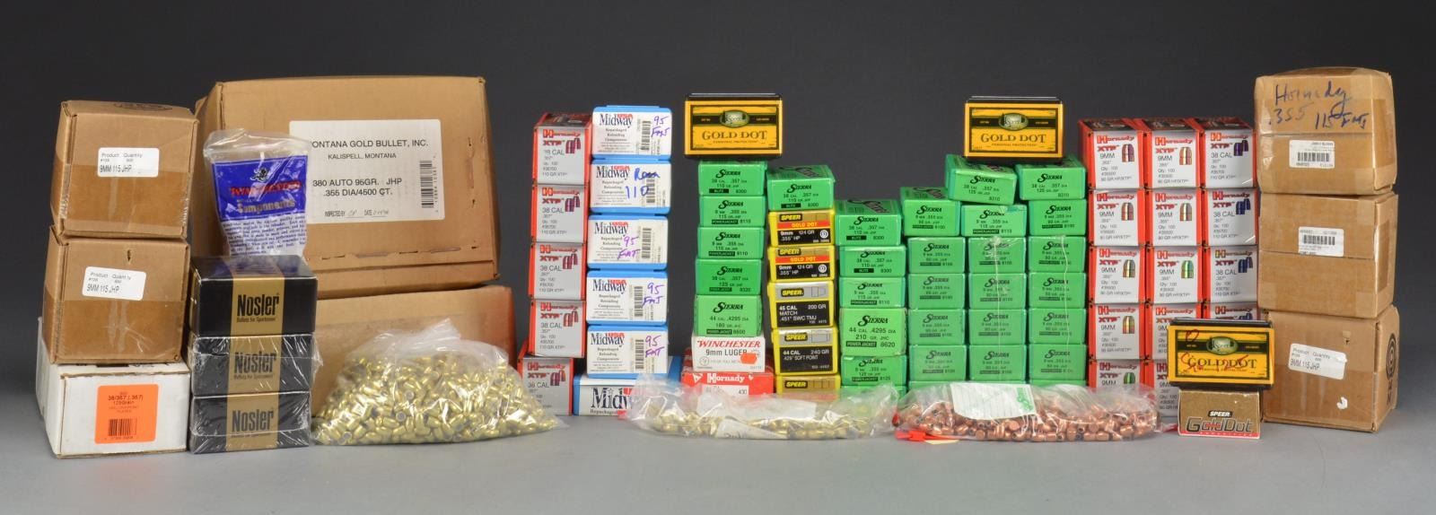 FOR HAND LOADING. Bullets largely in factory boxes & bulk packaging, some bullets are in unmarked bags. Sizes include 9 mm, 380 ACP, 38/357. 9 mm: 6 boxes 500 rd. Zero 9 mm 115gr. JHP. / 1 box Hornady 1,000 rd. 9 mm 115 gr. FMJ. / 3 boxes 100 rd. Sierra 9mm 115 gr JHP. / 7 boxes 100 rd. Sierra 9 mm 125 gr. JHP. / 2 cases 1,000 rd. Hornady 9mm 115 gr. FMJ. / 1 case 500 rd. Winchester 9mm 115 gr. FMJ. / 1 box 500 rd. Remington 357 cal. 110 gr. / 10 bags 100 rd. Winchester 9 mm 115 gr. STHP. / 2 boxes 100 rd. Speer Gold Dot 9 mm 124 gr. / 1 case 2,000 rd. Remington 9 mm 115 gr. JHP Improved Larger Heel Radius / 1 case 2,000 rd. Remington 9 mm 115 gr. VHP. / 1 case 2,000 rd. Montana Gold Bullet 9 mm 115 gr. FMJ. 38 CAL.: 3 boxes 100 rd. Sierra 38/357 cal. 110 gr. JHP./ 1 case 1,000 rd. Hornady 355 cal. 115 gr. FMJ. / 10 boxes 100 rd. Hornady 38/357 cal. 110 gr. XTP. / 1 box 100 rd. Midway 38/357 cal. 110 gr. / 2 boxes 100 rd. Sierra 38/357 cal. 125 gr. JSP. / 2 boxes 100 rd. Speer Gold Dot 357 Sig. 125 gr. GDHP. / 1 box 500 rd. Remington 357 cal. 110 gr. SJHP. 380 ACP: 1 case 4,500 rd. Montana Gold 380 Auto 95 gr. JHP. / 1 case 500 rd. HSM Custom Bullets 39 Special 125 gr. / 3 boxes 100 rd. Midway 380 ACP 95 gr. 9 unmarked bags, some FMJ & Hollow Point, total content estimated at 3,600 rds. Lot also includes approx. 15 part boxes of assorted bullets. CONDITION: most boxes in very good to like new condition. Bulk packaging has flexing & taped repairs. PROVENANCE: From the Frederic W. Thrane Collection. (02-14149-2/RW). $700-900.