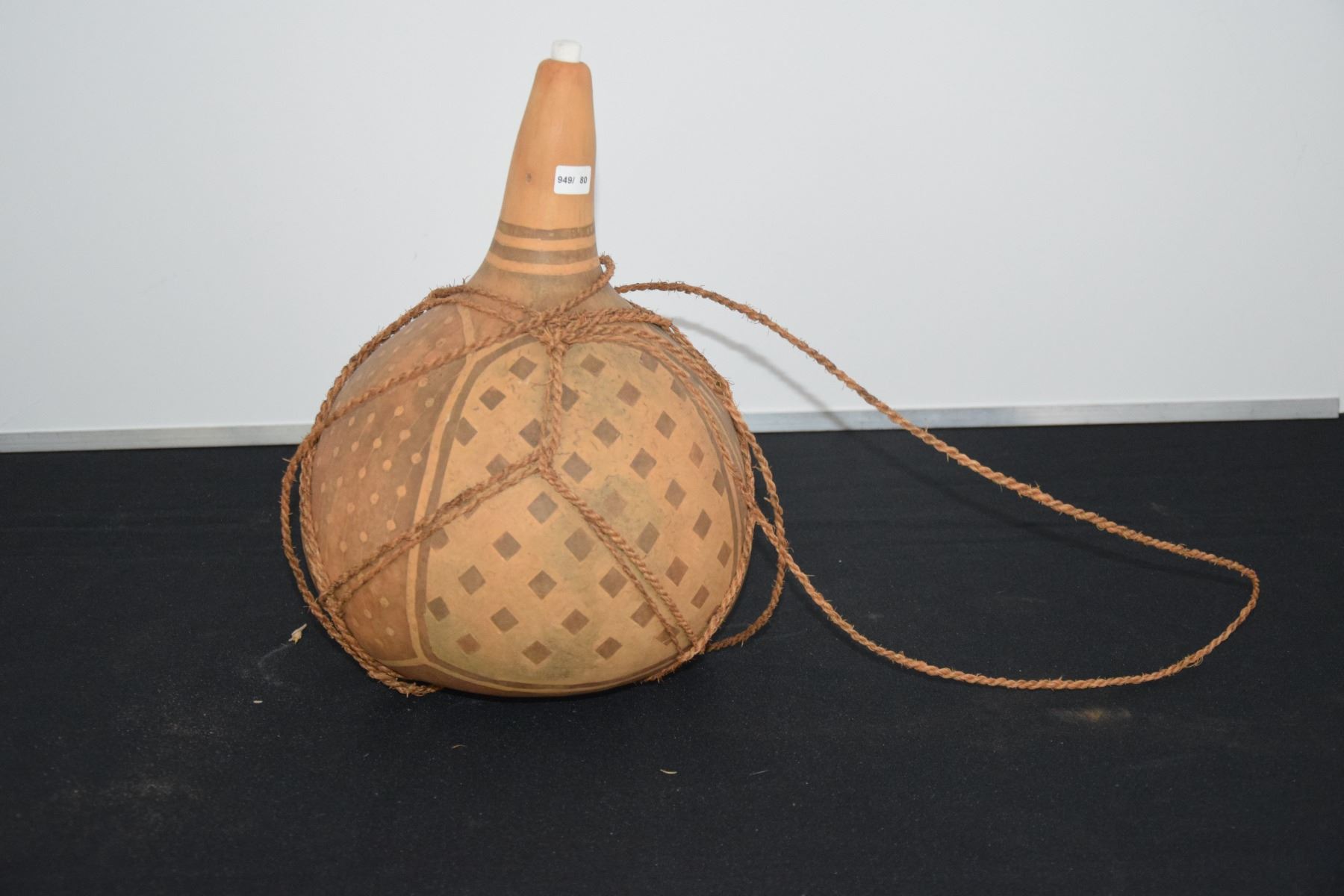 EXTINCT HAWAII NI'IHAU "PAINTED" GOURD WITH COCONUT FIBER HANGER & WHITE CORAL STOPPER (12" H)