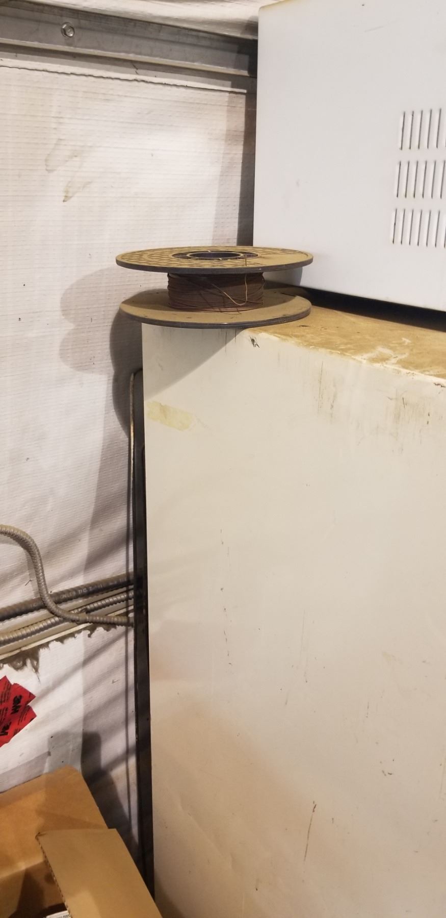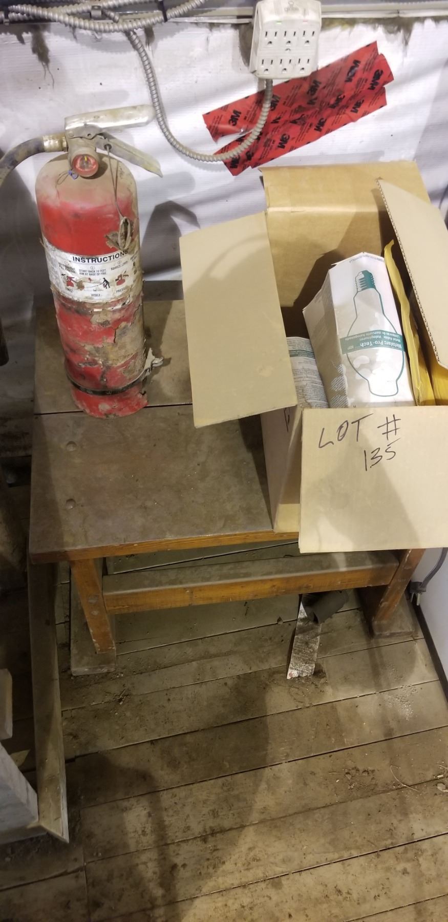 EXTINGUISHER, WOODEN TABLE, BOX OF METAL HALIDE LIGHT BULBS, WORLPOOL SYSTEM 200 FRINDGE, SPOOL OF WIRE