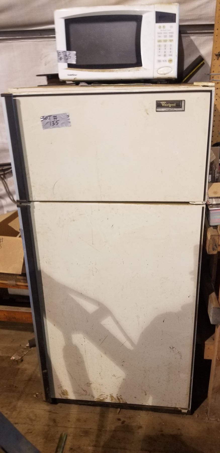 EXTINGUISHER, WOODEN TABLE, BOX OF METAL HALIDE LIGHT BULBS, WORLPOOL SYSTEM 200 FRINDGE,