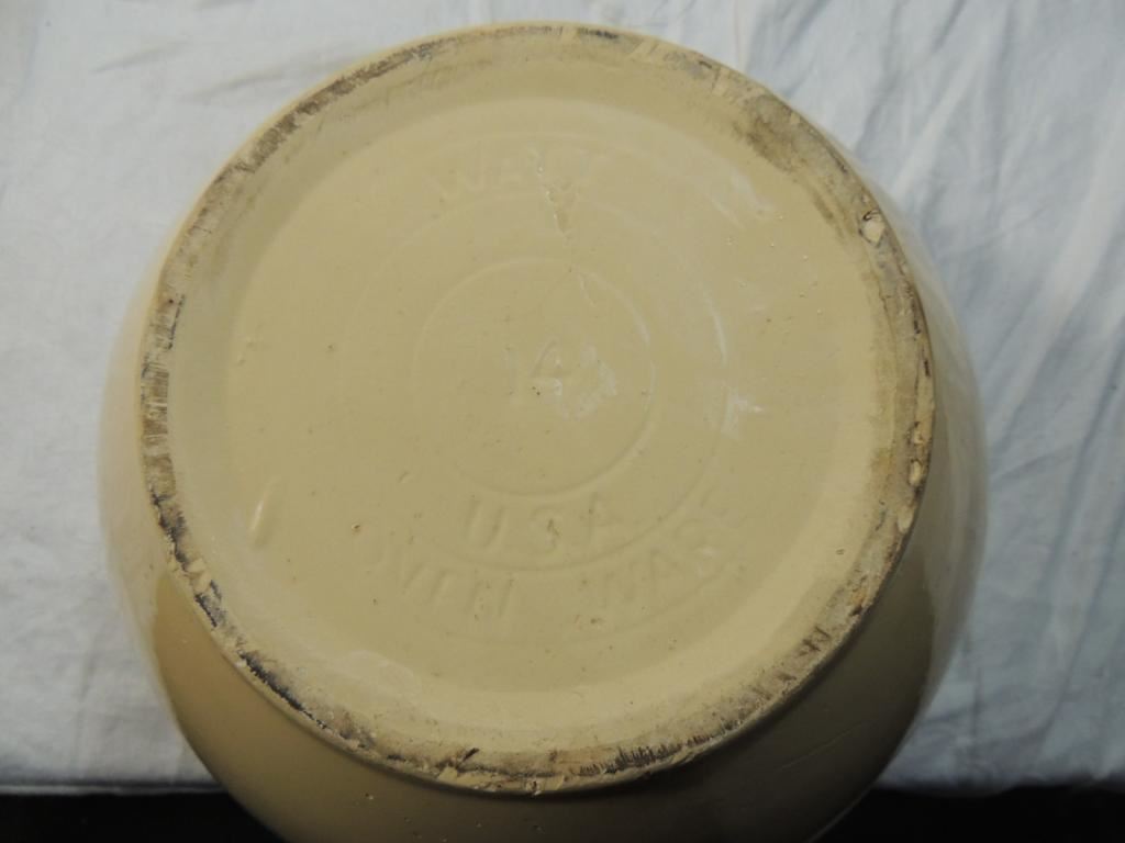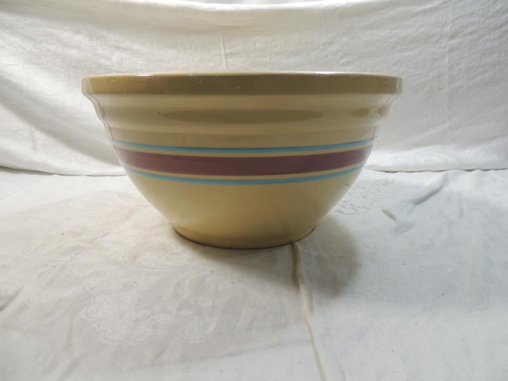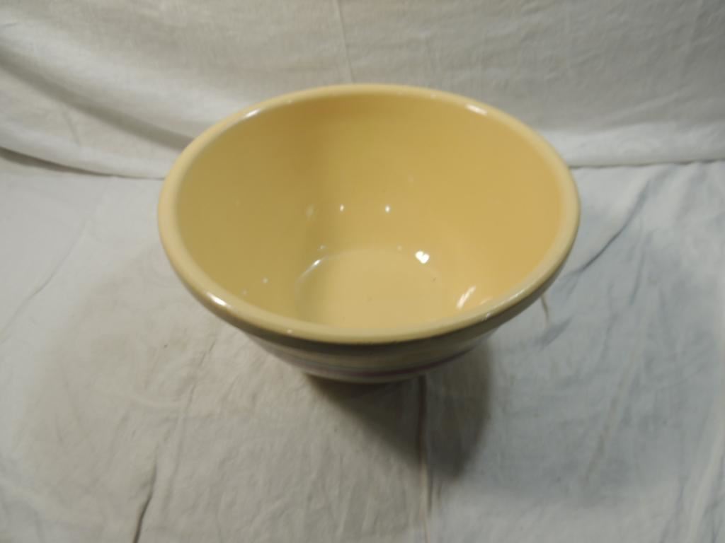 WATT LARGE MIXING BOWL, POTTERY BOWL IVORY MIXING BOWL, PINK AND BLUE STRIPE, USA POTTERY VINTAGE POTTERY AS SHOWN SEE PHOTO FOR MORE DETAILS.