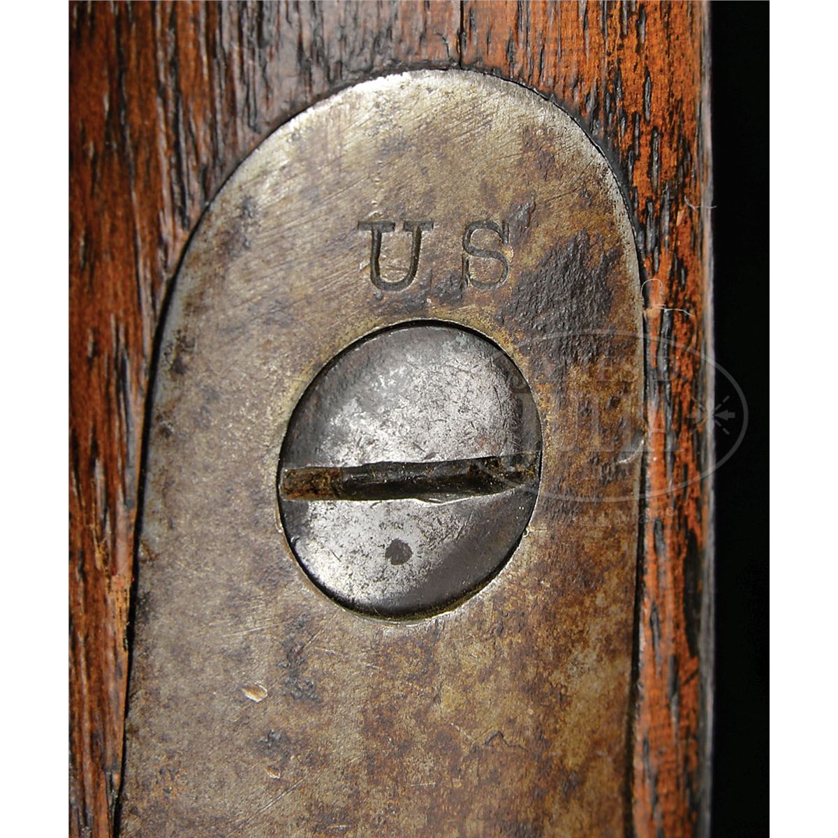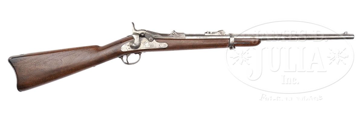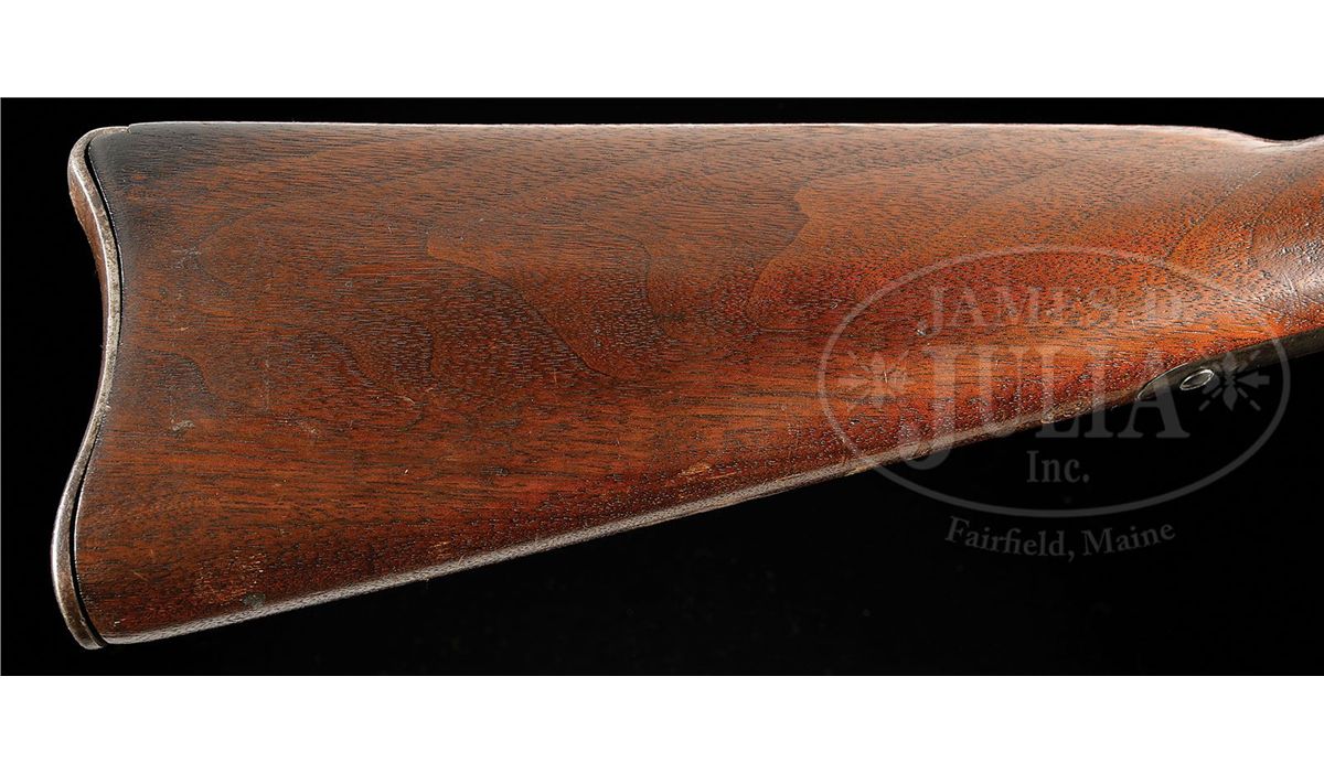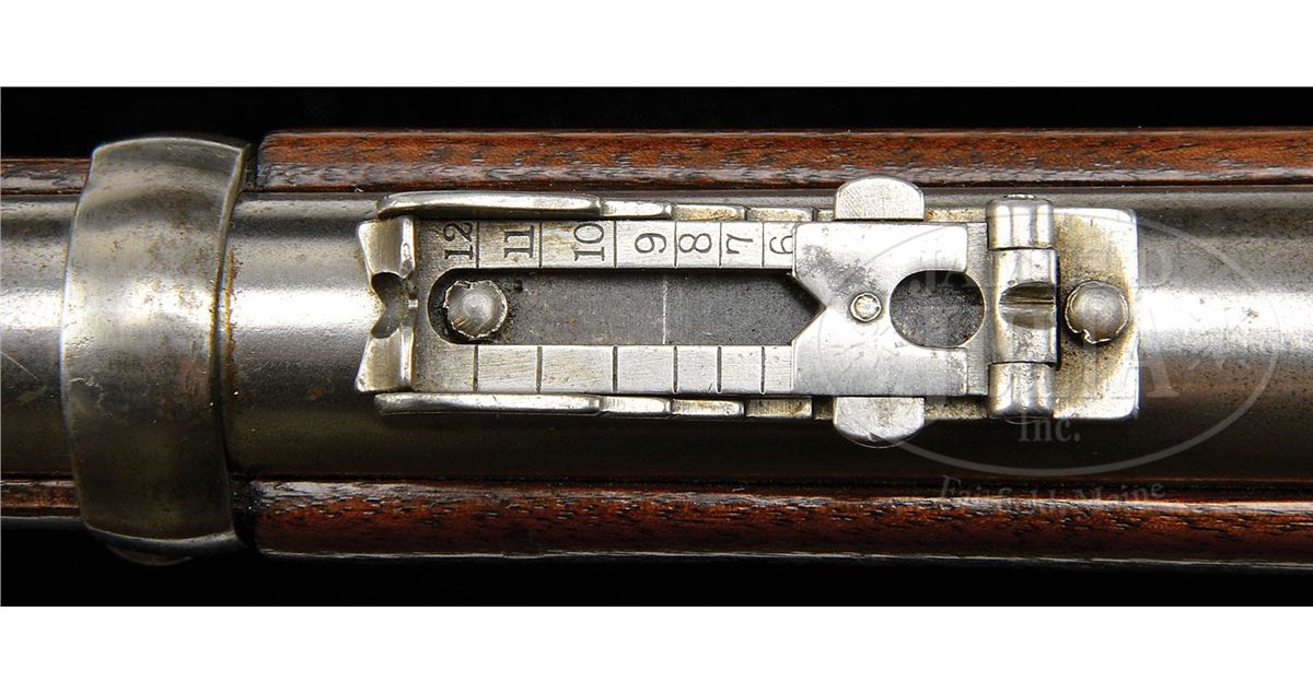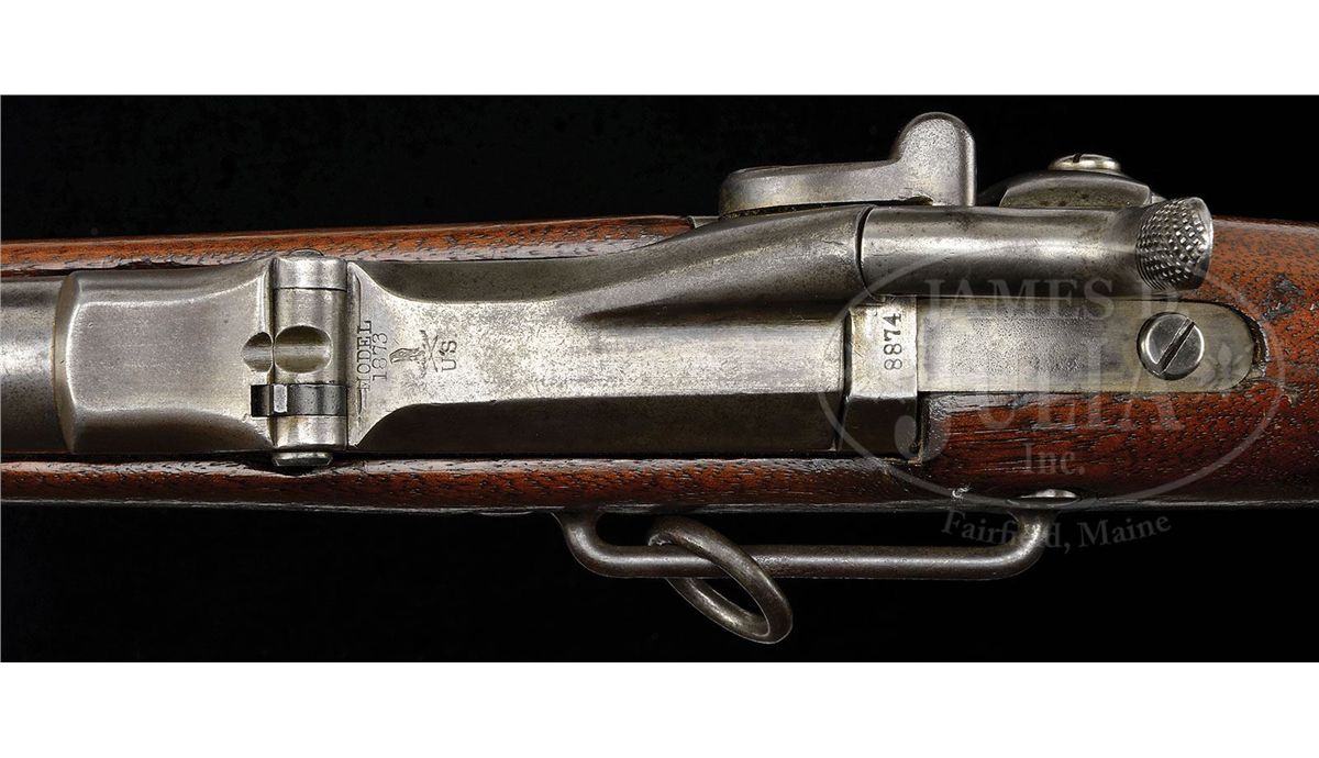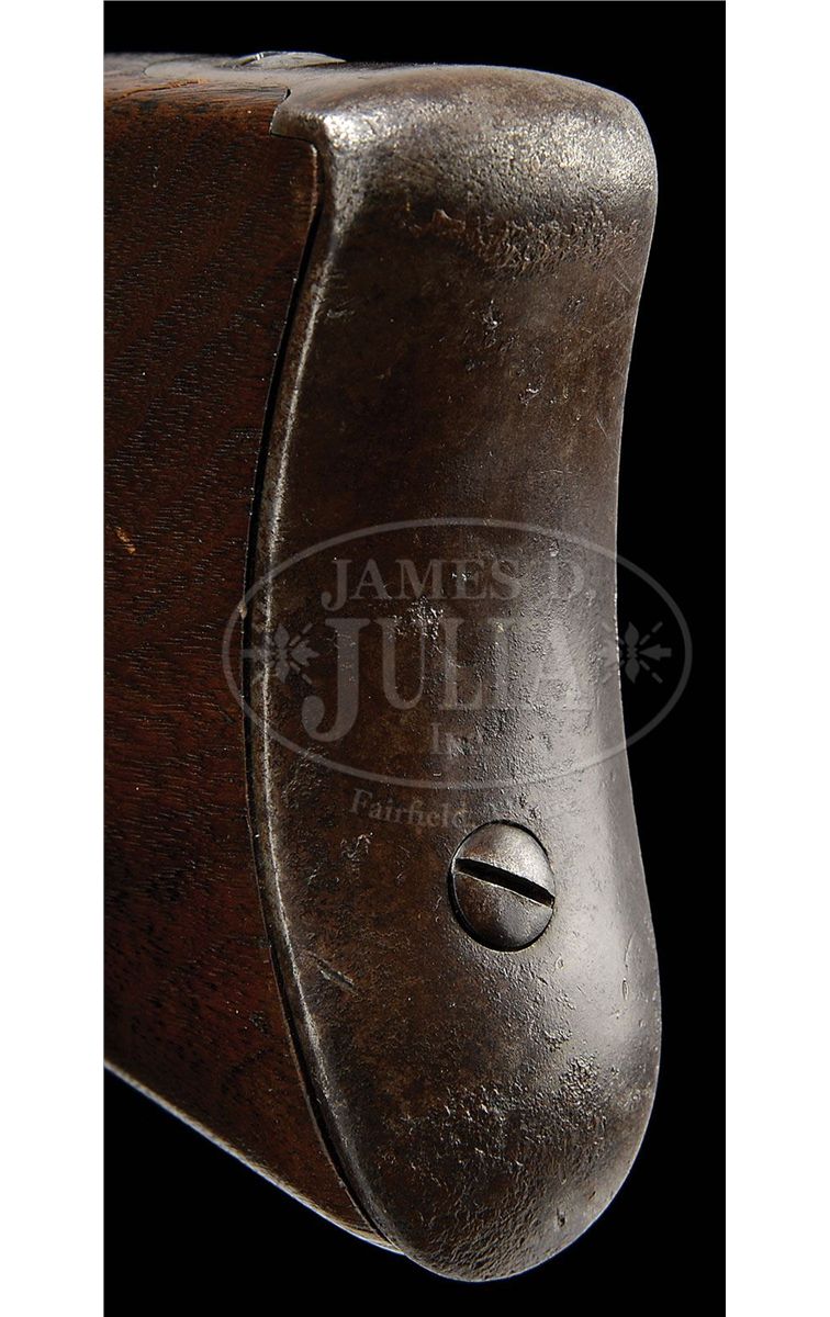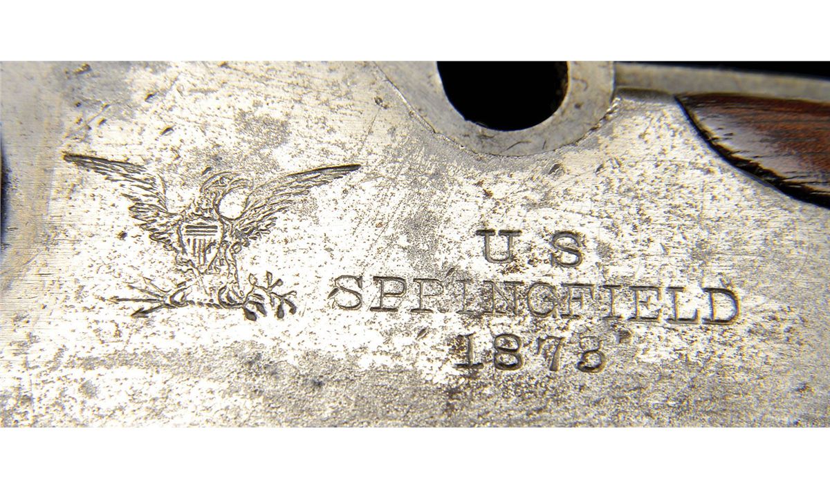 SN 8874. Cal. 45-70. Standard carbine with 22" rnd bbl, square base front sight and 1200 yd ladder rear sight. Breech block is marked "MODEL / 1873" with an eagle head over crossed arrows & "US". Lock plate has the orig 1873 markings of "U.S. / SPRINGFIELD / 1873" & the spreadwinged eagle. Mounted in an 1877 style replacement buttstock with long comb and carbine buttplate without trap. The area of the stock underneath the buttplate is without recess for tools as found on later versions. Left side of the stock has the standard sling bar and ring and the forestock is secured with a single band that has a stacking swivel. Trigger guard is standard 2-pc without sling swivel. Bottom of the stock, below the lower tang, has the firing proof "P" in a circle. The SN of this carbine indicates that it was manufactured in the Apr-Jun period of 1874 & is in the prime serial range of known Custer battle carbines. This is where the speculation regarding Custer battlefield use of this carbine ends. In 1981 US Government archeologists found 18 cartridge casings on the Little Bighorn Battlefield on the west flank of Sharpshooter Hill, between the hill and a low knoll and in the vicinity of the knoll which is located about half the distance between the Reno/Benteen defensive perimeter and Sharpshooter Hill, all of which were forensically matched to the firing pin & extractor impressions of this carbine. Most of these 18 cartridge casings were picked up in 2 separate locations, one group on the flank of Sharpshooter Hill and another near the north boundary fence. In 2004, additional excavations were conducted during road work on the battlefield and an additional 18 cartridge cases forensically matched to this carbine were found in the Reno/Benteen defensive line. All in a very small area about 2 ft by 2 ft under about 4" of dirt. It is speculated that the trooper who carried this carbine and fired these 36 cartridges was probably from "K" or "M" Company which were covering the retreat of Capt. Thomas Weir who had gone with Lt. E.S. Godfrey's Company K to investigate the sound of gunfire from the direction Custer had taken. Capt. Weir and Company K rode to the highest point in that direction, now referred to as Weir Hill, where they came under attack by a group of Sioux Indians, probably under the command of Low Dog. Capt. Weir and Lt. French's troop beat a hasty retreat with the Indians in hot pursuit, at which point, Capt. Weir dismounted his men to fight on foot which stopped the Indian pursuit and allowed them to retreat to the defensive position of the Reno/Benteen entrenchments. That is where the second cache of 18 cartridge cases were found. Although the trooper carrying this carbine has never been identified, he most certainly would have been an experienced veteran to have acted so steady while under attack during the retreat and then later on in his defensive position. It seems likely that this trooper probably survived the fight and returned to Fort Abraham Lincoln with the survivors of the 7th Calvary where the stock of this carbine, which likely had become damaged, was exchanged for the new and improved, more durable, Model 1877 version with the long comb and thicker wrist. All 36 of these excavated cartridge cases were positively identified as having been fired by this carbine using scientific comparison methods with known samples fired in this carbine under controlled conditions. This is believed to be the most positively identified Custer Battlefield firearm with the highest number of identified cartridge cases. PROVENANCE: Glen Swanson Collection. CONDITION: Very good to fine. No orig finish remains with the metal being a cleaned gray patina with all legends visible. Stock has a crack through the rear sling bar screw and a chip back of the top tang, otherwise wood is sound with a clean hand-worn patina. Mechanics are fine. Worn, dark bore with sharp rifling. 4-49074 JR280