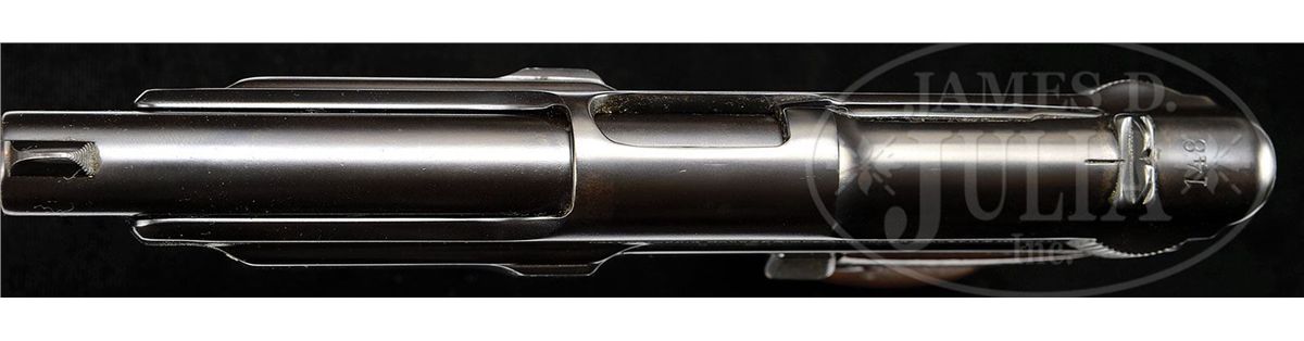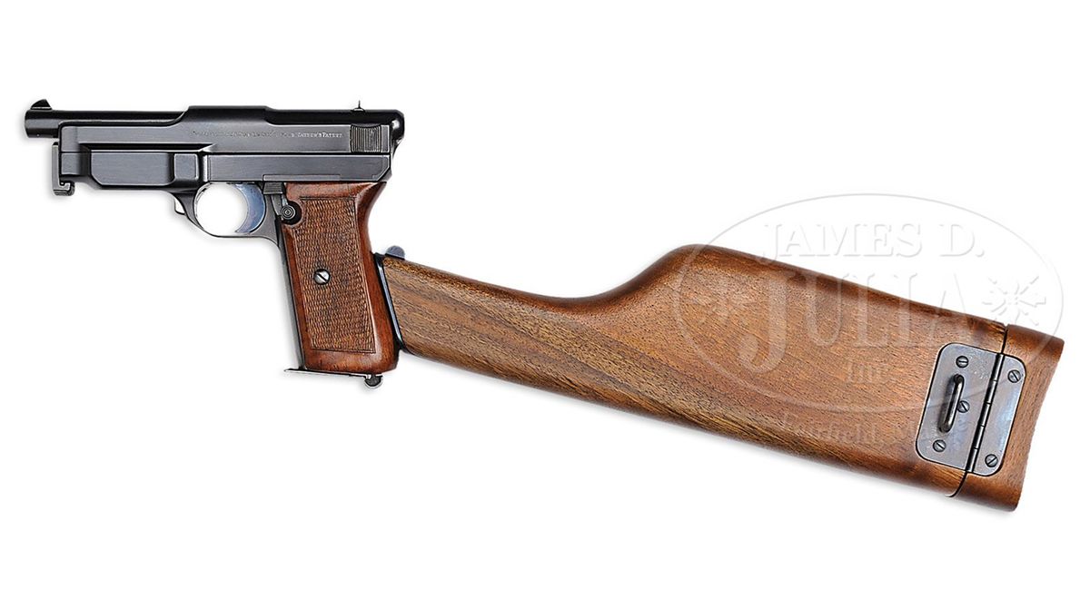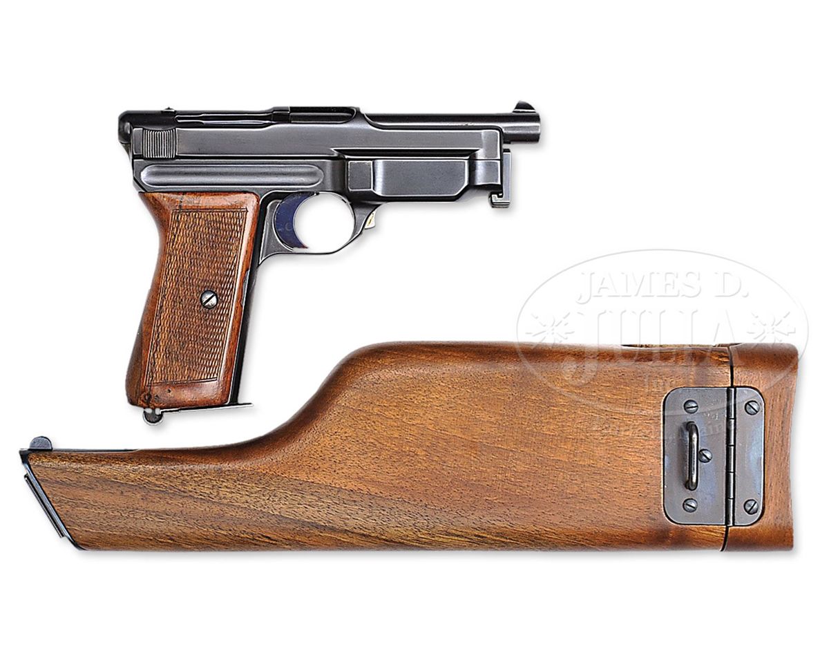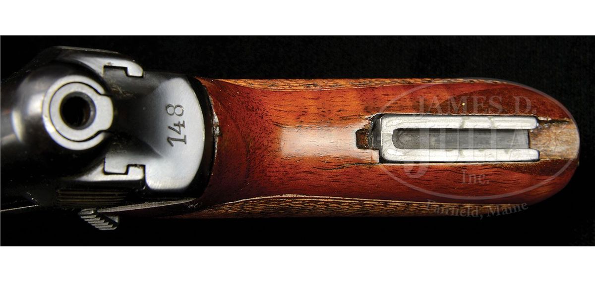 SN 148. Mauser made fewer than 200 M1912-14 pistols for evaluation and testing before WWI. The earliest guns, particularly those with serial number below 100, were manufactured as standard pistols. A small number of later guns including this example were fitted for a unique shoulder stock. This pistol has a 4-3/8" bbl with a fixed front sight having a serrated face and a drift adjustable rear sight. The left side of the slide is marked with a single line address "WAFFENFABRIK MAUSER A.-G. OBERNDORF A.N. MAUSER'S PATENT." Behind the rear sight is the serial number 148 in large digits. The rest of the pistol is similar to an enlarged M1914 with its fire blued trigger and button release safety lever. Depressing the serrated button in front of the trigger guard frees the slide for retraction. Reinserting the magazine releases the slide to return to its closed position. The single piece grip has finely checkered panels on each side while the back is relieved for a slotted lug to accommodate the shoulder stock. The magazine, again similar to an enlarged M1914, has a bright body and a square toed fire blued base. Upon disassembly, the serial number is repeated on the left side of the forward bbl lug, on each of the three components comprising the locking flap mechanism, and on the firing pin. It is also repeated on the left side of the trigger and on the spine of the magazine. In short, the gun is completely matching including the magazine. The unnumbered shoulder stock is one of 20 made by Mauser in the late 1960s on behalf of Henk Visser through the cooperation of Joseph Schroeder who lent one of his original stocks to Mauser for copying. These later stocks were blonde but otherwise indistinguishable from those of earlier production. Retracting the lug button allows the stock to easily connect and lock onto the backstrap with only minimal wobble. The body of the hollowed stock is sound with a coarsely checkered lid as is correct for this accessory. PROVENANCE: Joseph J. Schroeder, Jr. Collection. CONDITION: This M1912-14 has been professionally and carefully restored. Although a few metal imperfections may be noted with scrutiny, surface planes are flat, edges sharp, and the lettering is crisp. The fire blue of the trigger and recoil spring guide have been restored to the same level of care. A crack extending the length of the grip, on the right side, near the back border of the checkered field has been neatly repaired. So professionally that the remaining varnish looks factory applied. Grip screws have toned domes with near perfect slots. The magazine is excellent with only minimal body wear. Virtually all the original fire blue, with minimal pinprick losses, are on the base.ÊÊThe more recently manufactured stock is virtually new with nearly 100% of the fire blue on the lug and hinge. The body is unflawed as is the checkering on the lid. There can be no doubt that a Mauser M1912-14 with its correct shoulder stock is one of the most collectible Mausers ever manufactured! 4-48583 LMA67