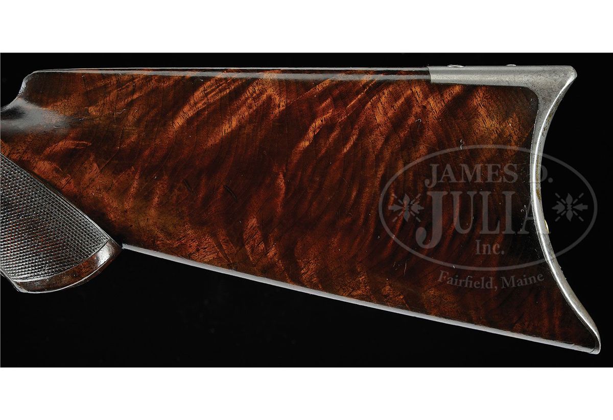 Please Note (3/1/13): Condition should read: Very Fine Condition. The last two digits of the SN (14) appear inside each sideplate. Additionally, the assembly #948 appears on the right side of the lever inside the action. SN 10014. Cal 45-60. Wonderful early rifle with 24-3/8" oct bbl, full magazine, half nickel front sight, 3 leaf platinum line express rear sight and very early Lyman combination tang sight with spiral knurled barrel. Receiver is second type with screw-attached dust cover rail and impressed thumb print dust cover. It is mounted with very highly figured, 2-3X, flame, and shell grain American walnut that has early style checkered forearm and pistol grip stock with convex, fleur-de-lis insert grip cap and crescent butt plate with trap and has single set trigger. Left side of lower tang, under the wood is marked with the assembly number "948" and "XX". Matching assembly number is also found in top tang channel of butt stock and inside toe of butt plate. Bbl is engraved with foliate arabesque patterns over the chamber area and the engraved panel in period script "One of One Thousand". Matching engraving is also on 7 of the 8 flats around the muzzle with a silver inlaid band over the chamber area and at the muzzle. Accompanied by an extremely rare, orig, Winchester leather carrying case made of heavy saddle leather, about 45-1/2" long and form fitted to this rifle, with carrying handle and double end flaps with a black enameled buckle on its billet that also has a staple for locking the billet. Bottom of the case is mounted with brass D-rings for a shoulder strap. Bottom of a sliding part of the handle is marked "WINCHESTER / REPEATING ARMS CO. / NEW-YORK". According to consignor this case was with the rifle when it was originally found. Inside the end flap is marked with the rifle's matching SN. According to the book The Story of the WINCHESTER 1 of 1000 and 1 of 100 rifles, Lewis, there were only 55 models 1876 produced as 1 of 1000 rifles during the period 1876-1880, of which only 22 were in cal 45-60. By way of comparing the relative rarity of the model 1876 1 of 1000 rifles there were 132 model 1873 1 of 1000 rifles produced during 1875-1893. According to a chart on page 89 of the referenced publication, this rifle was received in the warehouse June 7, 1880 and shipped the next day to order number 20253, which included 12 other model 1876 1 of 1000 rifles. This rifle is listed as having a 24" bbl with case hardened finish, checkered pistol grip stock, set trigger and cal 45-60. According to the referenced publication order number 20253 for these 13 rifles was shipped to Winchesters representative John Skinker of San Francisco. It is apparent that sales of these rather expensive rifles were not going well and Winchester was cleaning out the warehouse, probably at a deeply discounted price. Two rifles of that shipment were returned, one for a bbl change and the other for a cal change. This rifle and its leather case are pictured in full color on pages 106 and 107 of the reference publication. The leather carrying case is also pictured on page 157 of the referenced publication and the rifle is again pictured in full color on pages 168-169. The chart on page 89 lists 51 of the 55 models 1 to 1000, only 2 of which are listed with 24" bbls, with the other being #10031. A copy of the deluxe slip cover edition of the referenced publication accompanies this rifle. It is also accompanied by NRA silver medal and certificate #458, dated April 13, 2007, awarded to this rifle as one of the ten best rifles displayed that year at the NRA meeting in St. Louis. PROVENANCE: Henry F. Wynne & Antecedents; Kenneth Johnson; Kan Chew Collection; Vincent McMahon Collection; Dr. Edmund Lewis Collection. CONDITION: Very Fine, all matching. Bbl retains 88-90% strong orig blue with a few light nicks and sharp edge wear. Magazine tube has a couple of small dings around the band near the muzzle and retains about 80-85% orig blue, turning a little plum on the outer radius. Forend cap retains traces of case colors, being mostly turned to silver. Receiver retains silvered case colors turning to gray with smoky case colors in the most sheltered areas. Lever and hammer retain faded case covers on the sides, turned silver on the outer faces of the lever. Butt plate is a gray patina. Stock has a hairline by the top tang and another in the front bottom of the forearm, otherwise wood is sound with a few light nicks and scratches, showing moderate wear on the checkering and retains about 90% orig varnish on the butt stock and about 50% varnish on the forearm with the balance a hand worn patina. Mechanics are fine. Strong bore, frosty in the grooves. Leather case is lightly flexed with some surface crackling over the butt stock area with light loss of finish on the handle and overall retains about 75% orig brown finish and has a partially open seam in the butt stock area. 4-48260 JR379