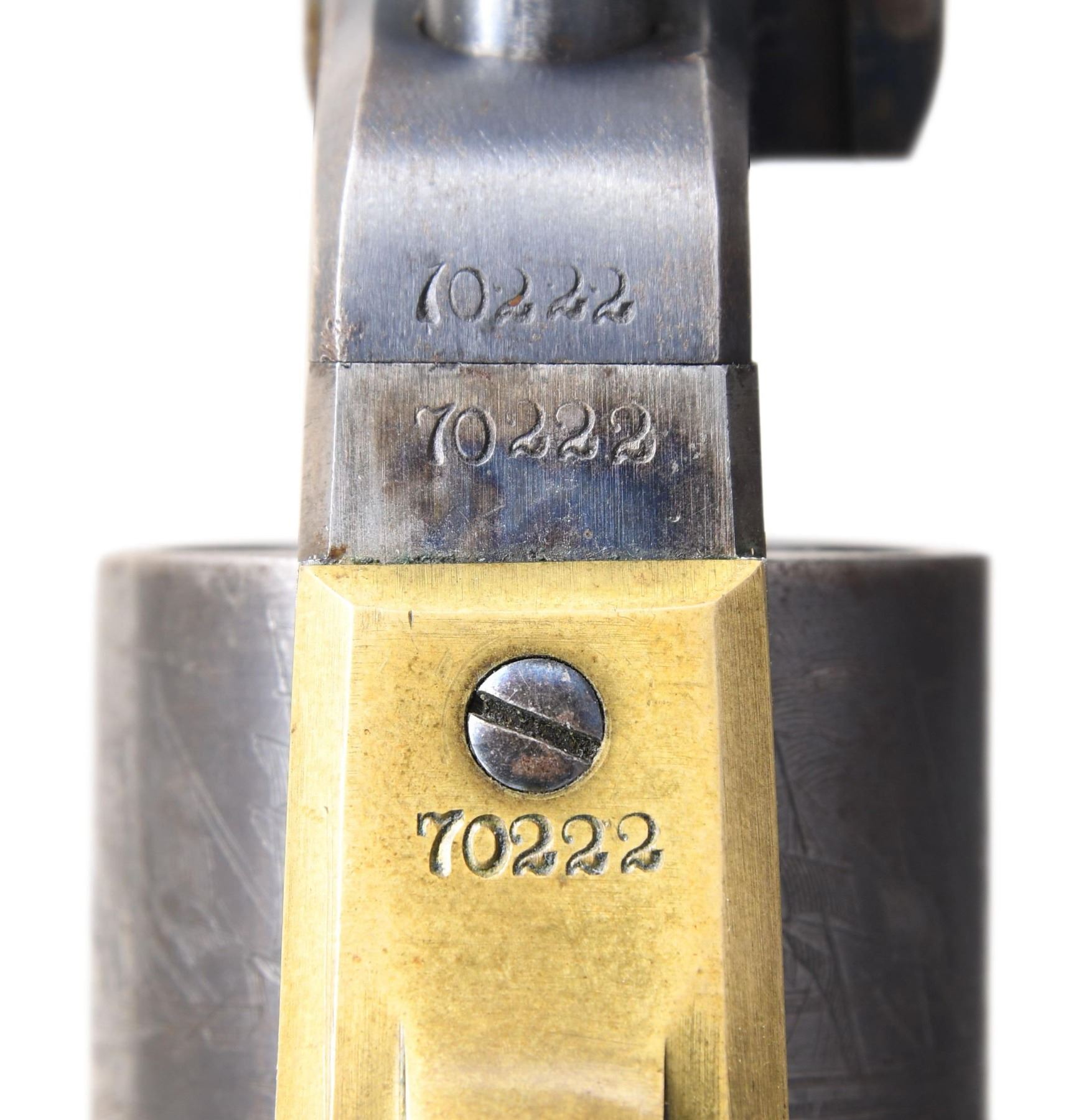 Cal. 36. S# 70222. This exceptional survivor 3rd model was made in 1857 where few survivors appear this new. A vast majority a pre-Civil War navies rarely have any finish much less be virtually new. Most distinctive feature of third models is the small trigger guard. Many revolvers in this serial range were purchased by US Army and obviously this revolver was meant to be one, as revolver has military inspection on most every part including oil finished grips. Revolver is also finished in bright military blue and case colors. The only thing lacking to make this a military purchased gun would be the final inspector's cartouche in the grips. This is truly among the finest military finished Colt navies extant appearing unfired, retaining virtually all its factory finish. Standard configuration and markings: small "COLTS / PATENT US" on frame, barrel address "-ADDRESS SAML COLT NEW-YORK CITY-", matching serial numbers throughout. This revolver was obviously made for army contract which was filled and this perfect military finished revolver sold in civilian market. You won't find a better one. CONDITION: excellent overall, 95%+ original blue and casehardened finish, some spotting on barrel, crisp matching markings throughout, crisp safety pins, grips excellent, few minor marks on edge. Mechanically excellent, crisp shiny possibly unfired bore, cylinder chambers retain most of their original blue finish. (01-26093/JS). ANTIQUE. $15,000-25,000.