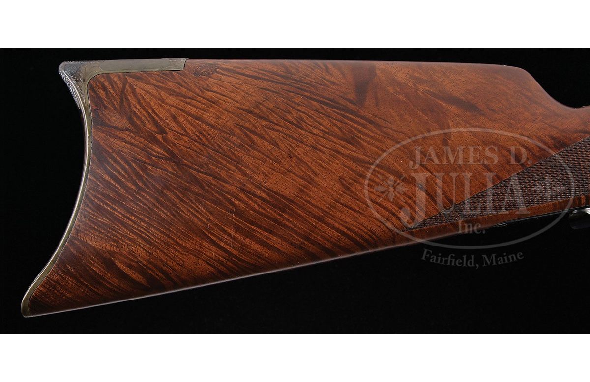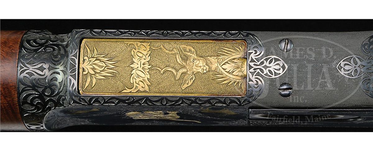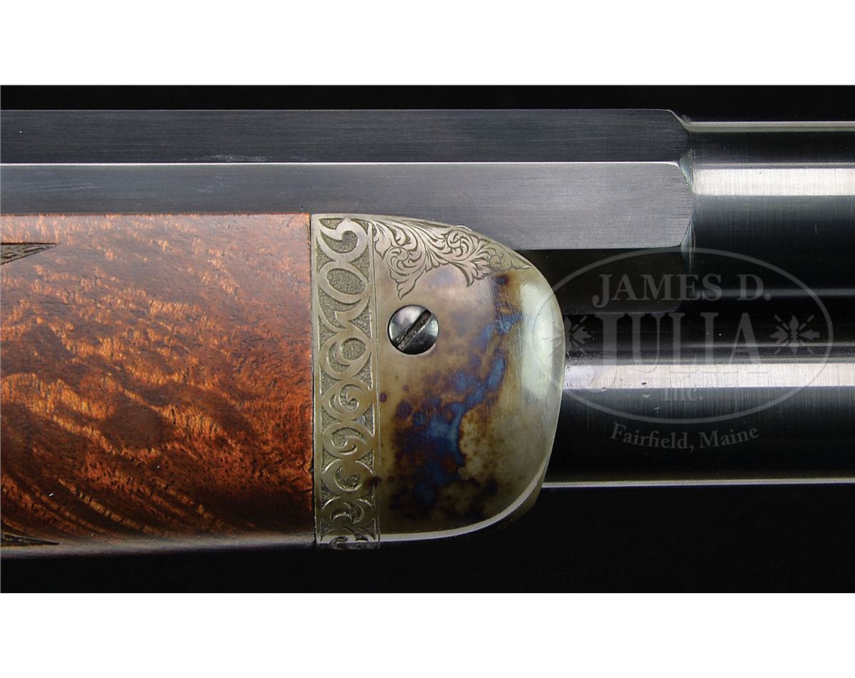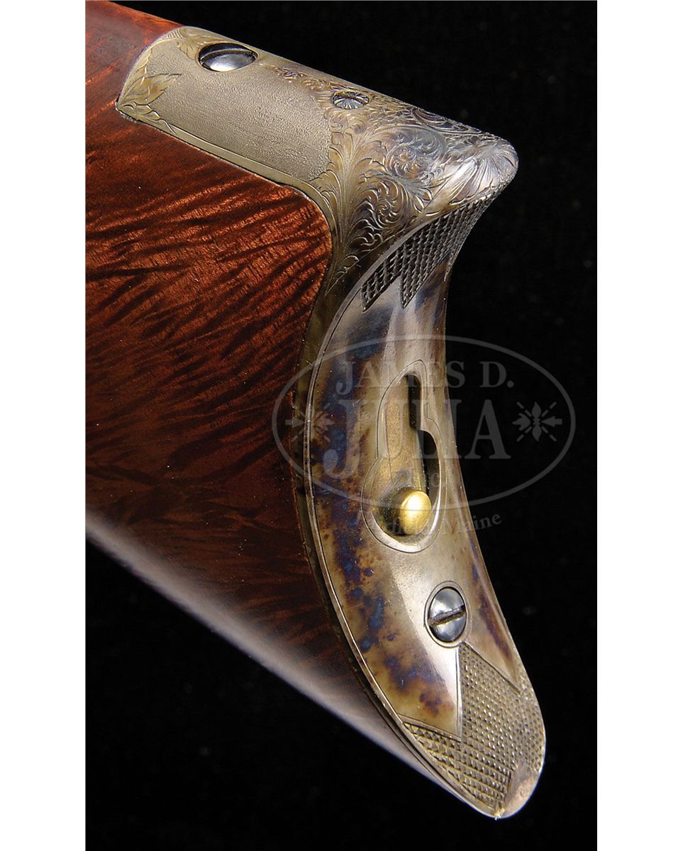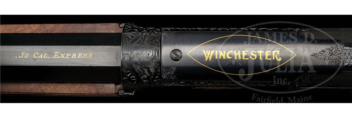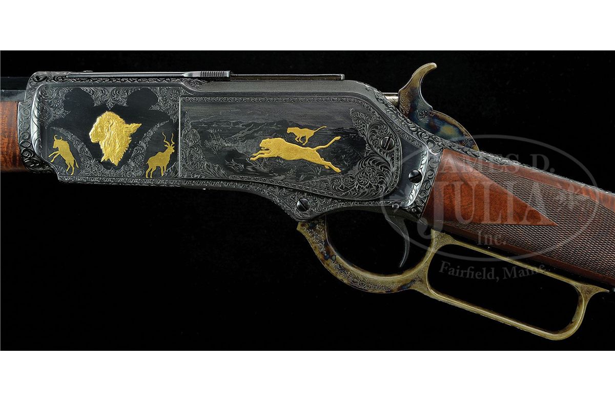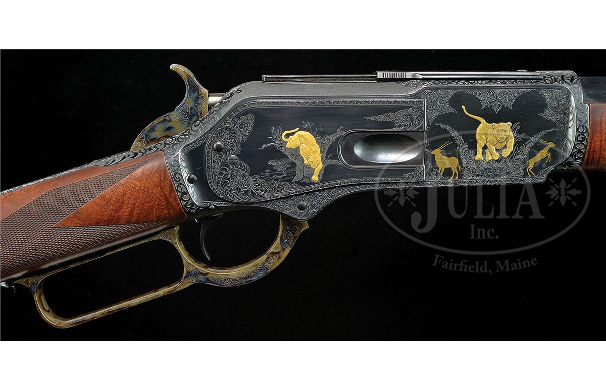 SN 10052. Cal. 50 Ex. (50-95). Spectacular Joseph engraved deluxe '76 with rare 24" oct to rnd bbl, full magazine, half nickel front sight and "1876" marked ladder rear sight. Mounted with exceptional flame grain custom American walnut, H-style checkered with straight grip & crescent buttplate with trap. Rifle is extraordinarily engraved by master engraver, Joseph, from Cody, Wyoming and should be considered his single finest example of the engraver's art. Receiver & side plates are wonderfully engraved with two running gold cheetahs on left side plate attacking a running spiral horned antelope in a very detailed plains scene with hills in the background. Left front flat shows an extraordinary raised, relief engraved gold male African lion shoulder bust, a flat gold wildebeest and a flat gold spiral horned antelope. All surrounded by extremely fine detailed, intertwined foliate arabesque patterns with smooth artistically offset panels on the front flat. Side plate & receiver are equally beautifully outlined by very fine border patterns. Right side plate is engraved with a very highly detailed raised gold leopard descending a tree with a plains scene in the background. Right front flat exhibits an incredible raised gold running lioness and two flat gold long horn antelopes, all with matching surrounding engraving & borders to the left side. Bottom center of the right front panel is signed "JOSEPH 88". Top front of receiver is engraved with an incredibly detailed bull Cape buffalo head. All other areas of the receiver have semi-relief intertwined patterns with fine shaded background. Bottom of carrier is spectacular with the relief engraved head of a spiral horned antelope, crossed elephant tusks and foliate patterns with the caliber marking on a panel of foliate patterns. Lever, hammer, forend cap & buttplate are all engraved to match. Top flat of bbl, over chamber area is inlaid in flat gold ".50 CAL. EXPRESS" and top of dust cover is inlaid in flat gold "WINCHESTER" inside a gold wire elliptical shape. The muzzle of the bbl is inlaid with three wide gold bands. Buttplate has hand checkered heel & toe with the tang engraved in extremely fine detailed foliate & floral patterns with a very fine shaded area. Dust cover rail is engraved in geometric patterns with the top rear of receiver very finely shaded. Altogether one of the most incredible custom engraved Winchesters ever brought to market. Accompanied by a small packet of sample drawings from Joseph to the consignor's father who commissioned the rifle along with photographs, a letter from Joseph regarding the wood and a letter from Herbert G. Houze to Joseph praising his work. Also accompanied by a Cody Firearms Museum letter which identifies this rifle in Express caliber with 1/2 oct bbl, plain trigger, light, checkered stock and case hardened received in warehouse June 30, 1880 and shipped next day. Apparently the set trigger was overlooked in the shipping records. CONDITION: Extremely fine. Overall retains virtually 100% of its crisp custom finish to both metal & wood with bright blue and clean, crisp oil finish on the wood. Mechanics are crisp, strong dark bore with fine to moderate pitting. 4-47879 JR132