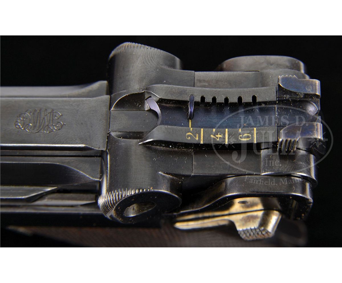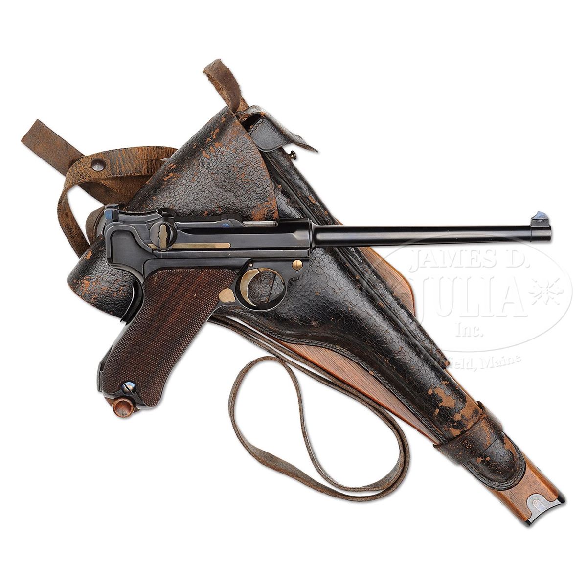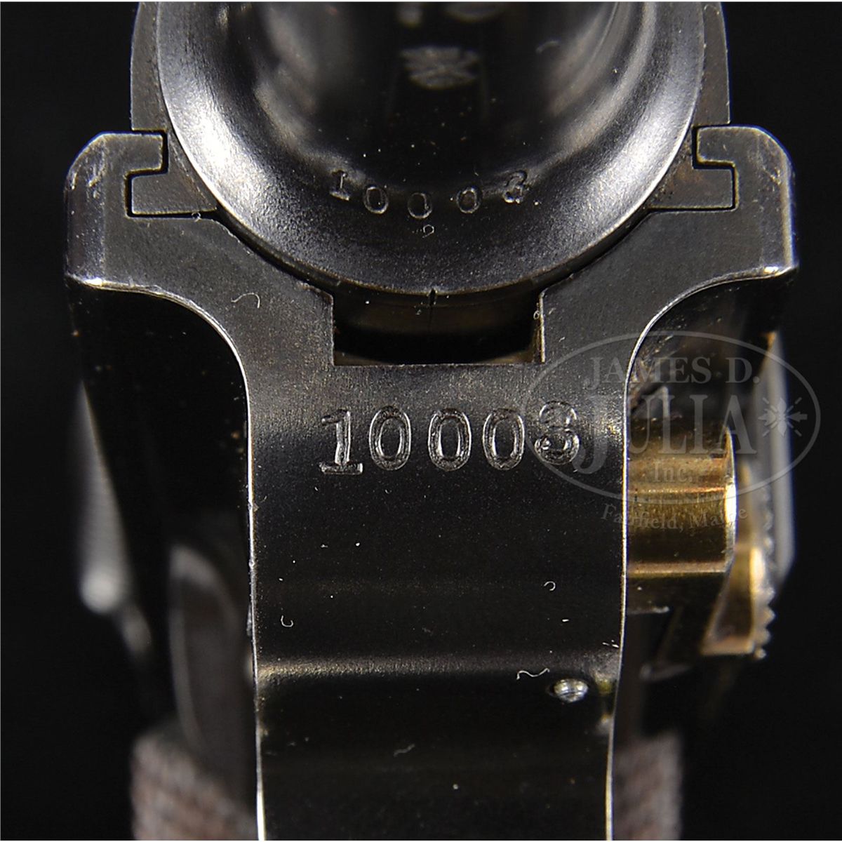 SN 10003. Unique configuration 7" .30 Cal bbl with full SN. "DWM" scroll on center toggle link. Dished toggles. Unique Chilean prototype 6 position rear sight mounted on rear link. Grip safety. British proofed. All numbered parts on gun are matching down to the checkered walnut grips. Prototype stock lug with locking cut only adapted for prototype push button stock. Wood bottom magazine with small unidentified (possibly Chilean?) stamp on bottom. With orig prototype push button stock that has the orig full matching SN stamped on lug. With a Chilean prototype holster and attaching straps very similar to those seen on later Navy p.04 pistols. This gun/stock rig is pictured or mentioned on pgs. 217, 218, 221, 235, 236, 237, 238, 240, 250, 252, 254, 255, 256, 279, 281, 593, 594, 872, 1171 and 1172 of Dr. Geoffrey Sturgess' The Borchardt & Luger Automatic Pistols. PROVENANCE: Collection of Dr. Geoffrey Sturgess. CONDITION: Near mint. Retaining 99% bright orig blue. 99% bright orig straw and heat blue. Bore is bright and sharp. Grips are sharp with beautiful color and wood grain and only very minor chips and dents to the checkering. Magazine is excellent with very little wear as is the stock which only has minor scuffs and dings and retains about 98% blue on the lug. Holster and straps are good with surface heavily flaking. This is probably the finest and most complete example of this super rare variation many aspects of which, especially the holster/stock, were prototypes for the Naval p.04. 4-52060 BWS98