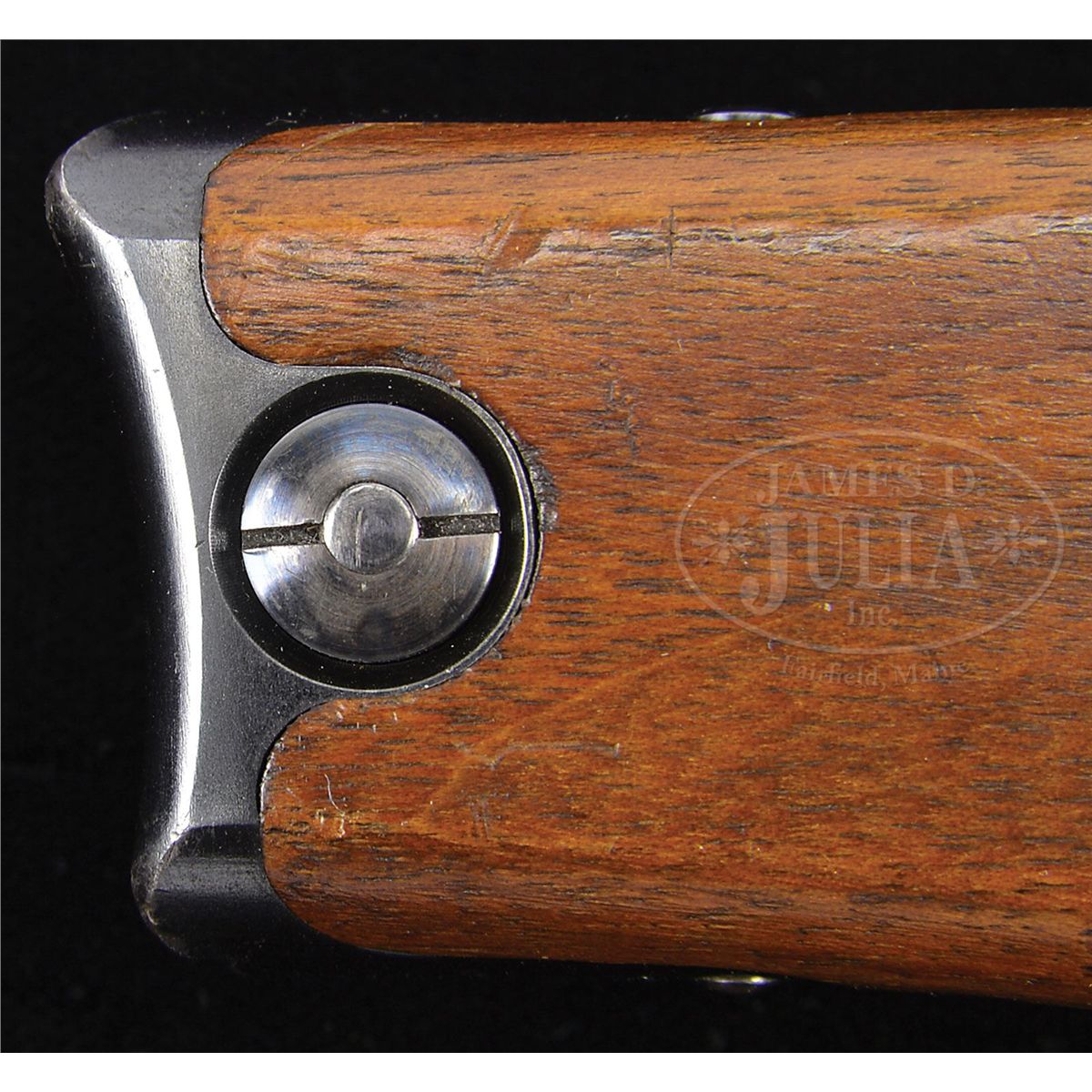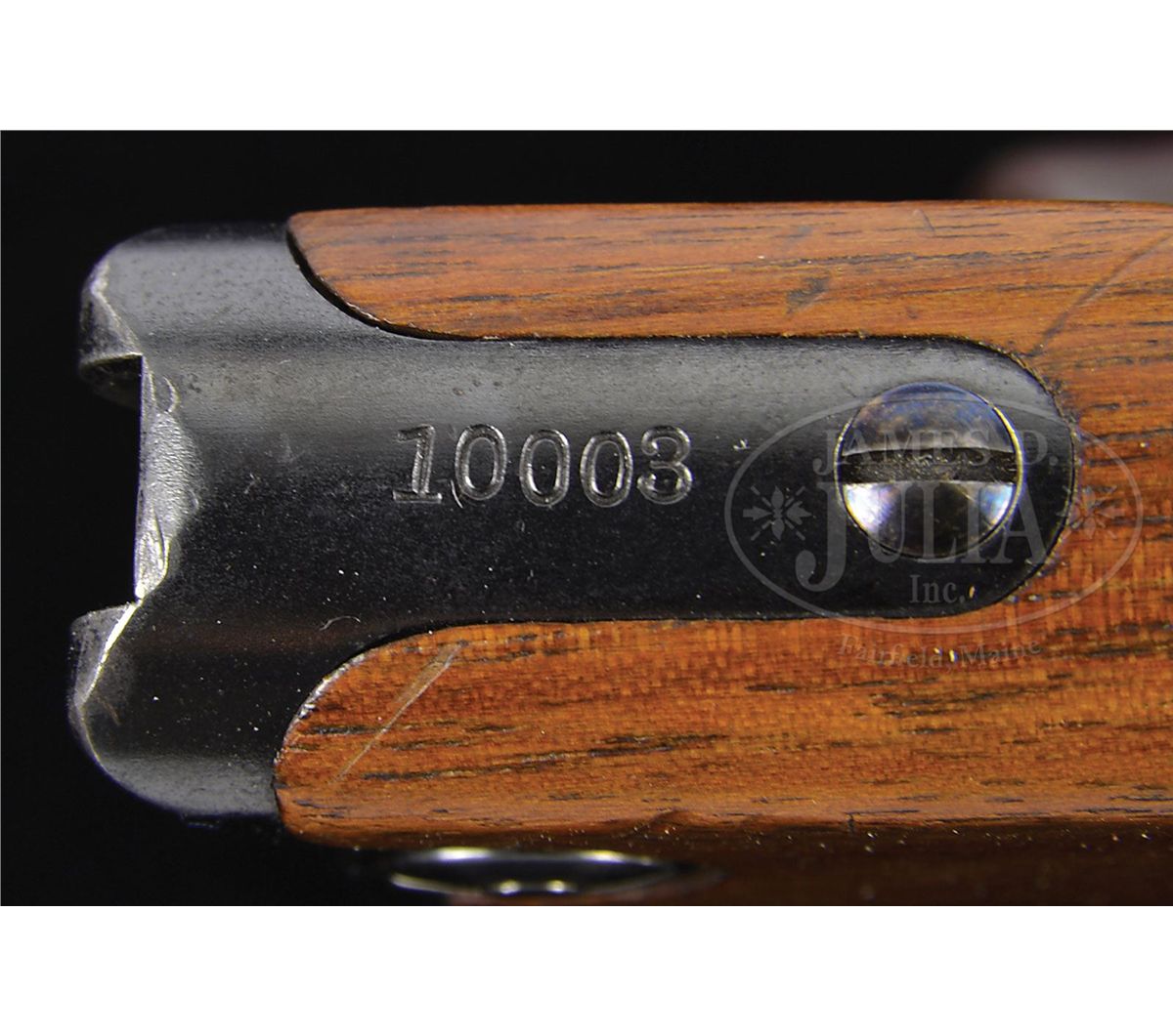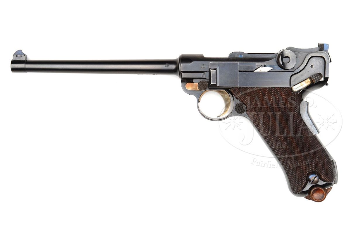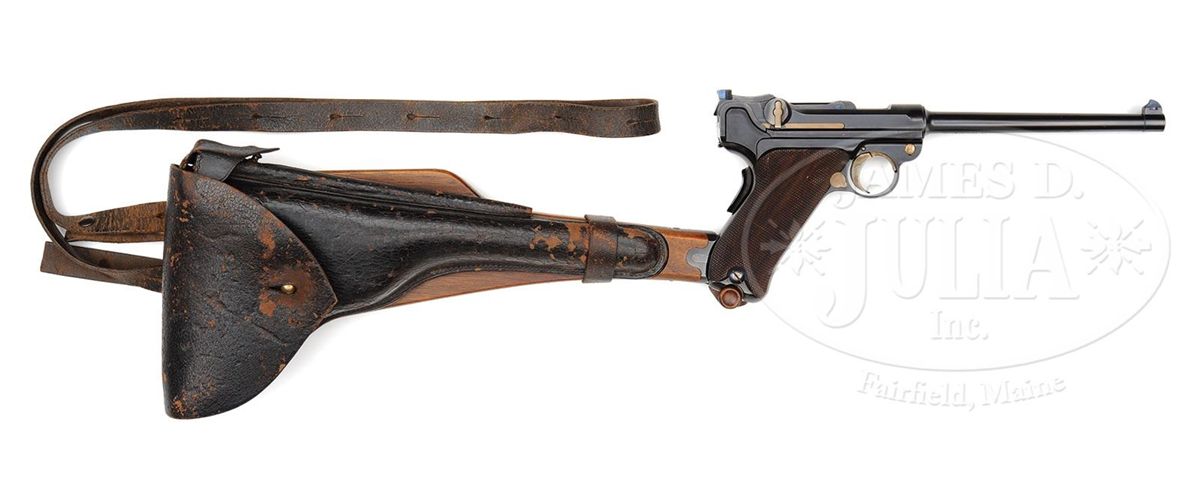 SN 10003. Unique configuration 7" .30 Cal bbl with full SN. "DWM" scroll on center toggle link. Dished toggles. Unique Chilean prototype 6 position rear sight mounted on rear link. Grip safety. British proofed. All numbered parts on gun are matching down to the checkered walnut grips. Prototype stock lug with locking cut only adapted for prototype push button stock. Wood bottom magazine with small unidentified (possibly Chilean?) stamp on bottom. With orig prototype push button stock that has the orig full matching SN stamped on lug. With a Chilean prototype holster and attaching straps very similar to those seen on later Navy p.04 pistols. This gun/stock rig is pictured or mentioned on pgs. 217, 218, 221, 235, 236, 237, 238, 240, 250, 252, 254, 255, 256, 279, 281, 593, 594, 872, 1171 and 1172 of Dr. Geoffrey Sturgess' The Borchardt & Luger Automatic Pistols. PROVENANCE: Collection of Dr. Geoffrey Sturgess. CONDITION: Near mint. Retaining 99% bright orig blue. 99% bright orig straw and heat blue. Bore is bright and sharp. Grips are sharp with beautiful color and wood grain and only very minor chips and dents to the checkering. Magazine is excellent with very little wear as is the stock which only has minor scuffs and dings and retains about 98% blue on the lug. Holster and straps are good with surface heavily flaking. This is probably the finest and most complete example of this super rare variation many aspects of which, especially the holster/stock, were prototypes for the Naval p.04. 4-52060 BWS98
