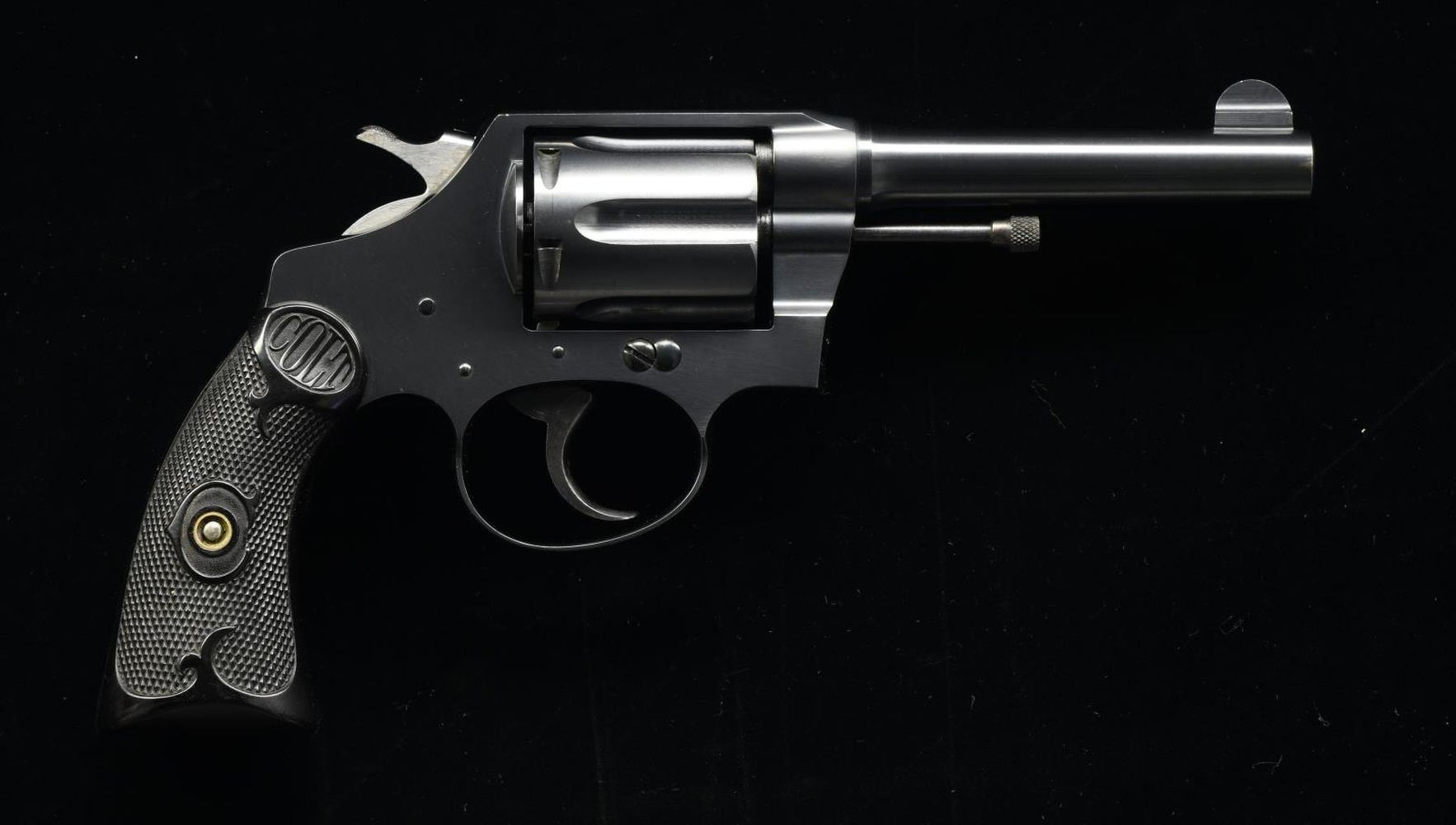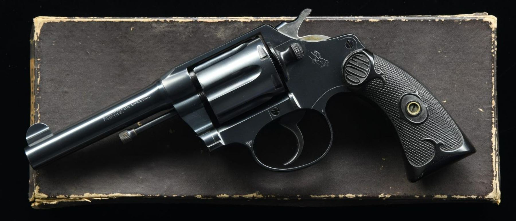 BOXED REVOLVER. Cal. 38 Spl. S# 243084. Bbl. 4" with integral semi circular sight; frame notched rear. First issue mfg. 1922 (1907-1927) with correct barrel patent dates (1884, 1900 and ending with July 4, 1905) plus "Police Positive" markings along with "38 SPECIAL". Longer frame and cylinder (1 9/16" not 1 1/4" of Positive model) further indicates Special model. Checkered rounded cylinder latch, smooth top strap, and matching numbered checkered hard rubber grips. UNATTACHED ACCESSORIES: good original matching numbered box with 1 broken lid corner plus general scuffs. Manual and original hang tag indicating variety of useable 38 ammo. CONDITION: amazing time capsule that is near excellent appearing new and unfired. Top collector quality. (23-4959/NW). CURIO. $650-900.