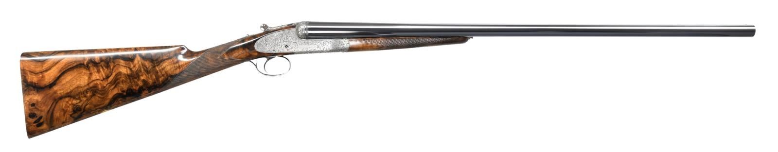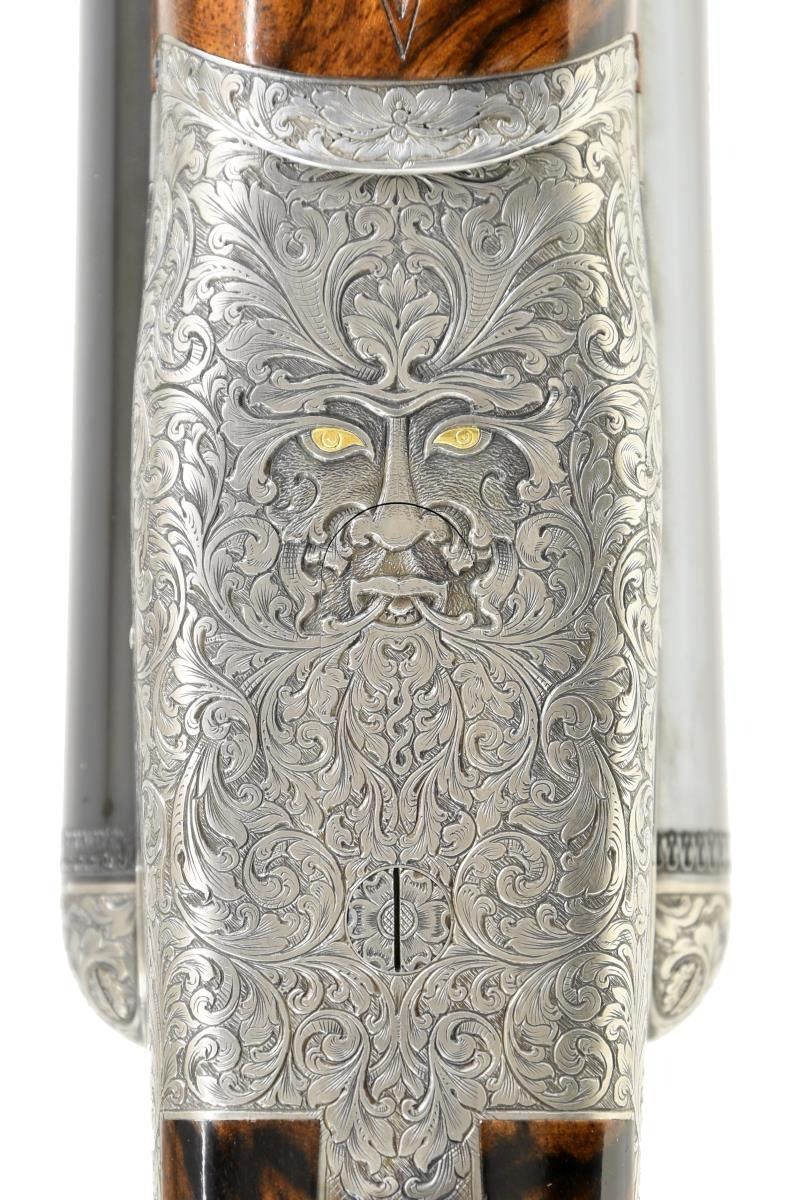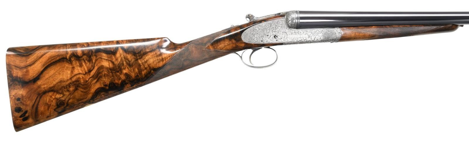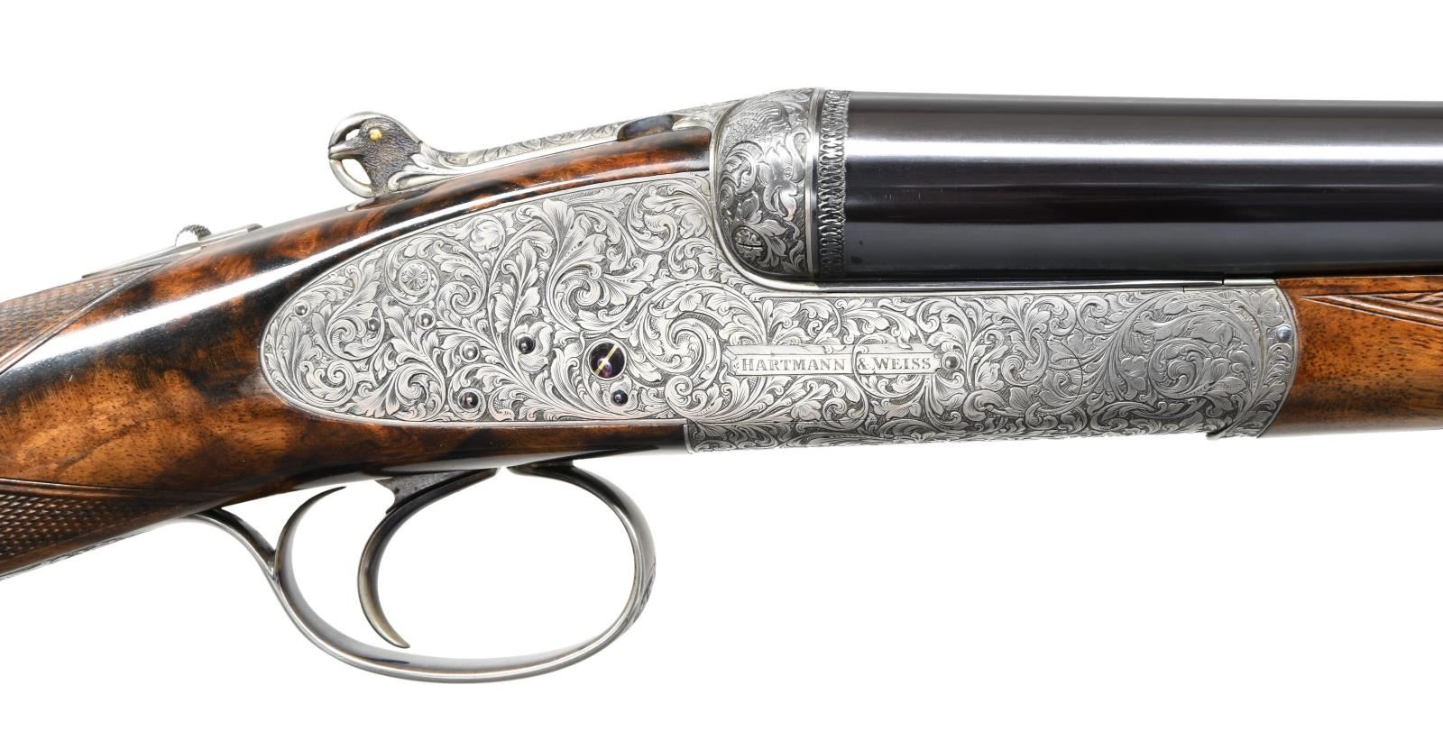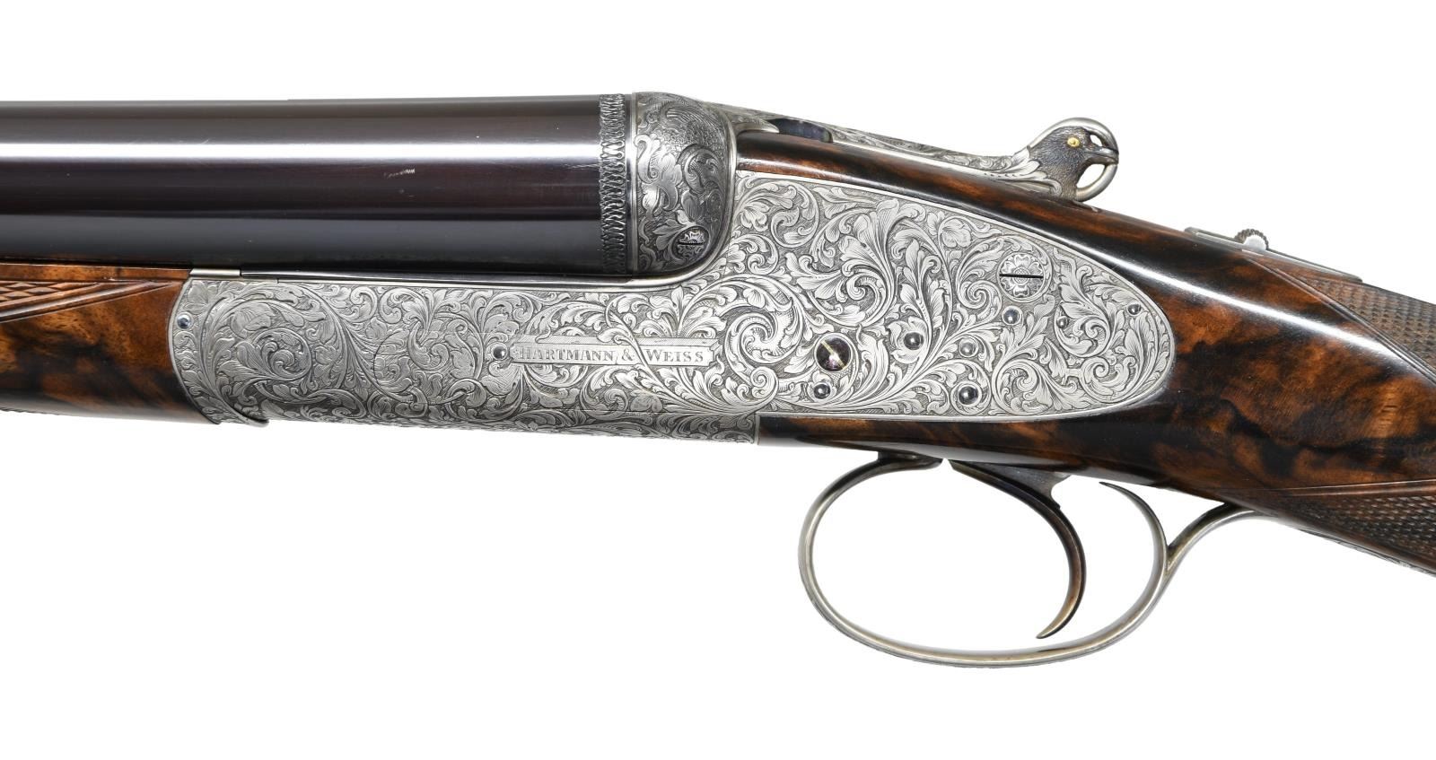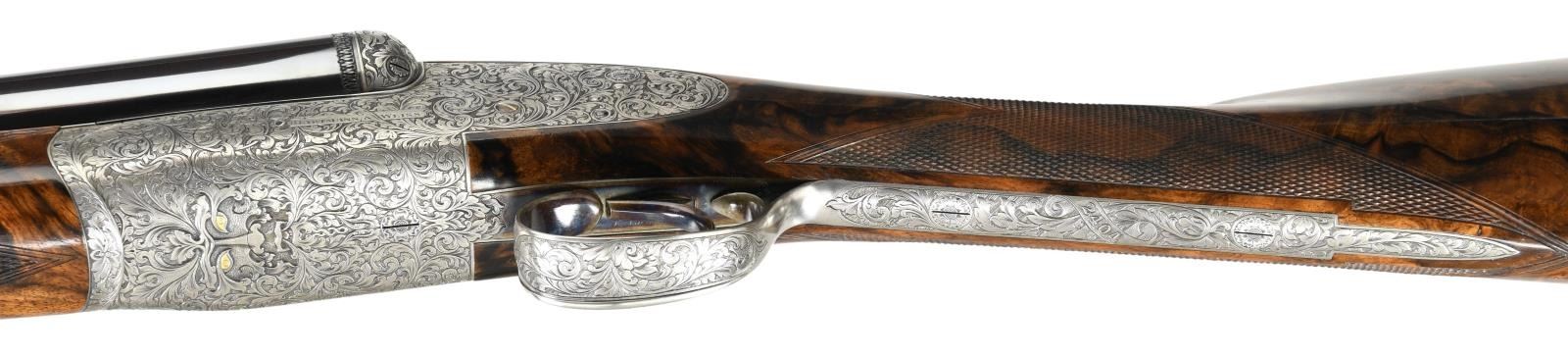 ROUND ACTION SELF-OPENING SIDELOCK EJECTOR SINGLE TRIGGER GAME GUN WITH CASE & ACCESSORIES ENGRAVED WITH CLASSICALLY INSPIRED LARGE SCROLL BY THE RENOWNED KEITH THOMAS. Cal: 12 Ga. 2-3/4”. S#: 2404. The esteemed firm of Hartmann & Weiss is known for its exacting craftsmanship and attention to classic styling, as well as beautiful finishes on their sporting guns and rifles. All are built in house to proven designs which are generally acknowledged to be the best. (Mostly Boss). Mechanically this gun is a re-creation of a 1930’s era round action Boss self–opening sidelock gun incorporating their superb ejector system and highly regarded single trigger. The 28” chopper lump barrels are engraved “Hartmann & Weiss Hamburg” on the narrow slightly swamped game rib. Barrel flats are stamped with June 2013 German nitro proofs for 2-3/4” chambers. Case hardened and coin finished Boss pattern self-opening sidelock round bodied action features automatic safety (“SAFE” engraved), bushed strikers, platinum line tumbler end cocking indicators and Boss style non-selective single trigger. Action and lockplates are filed in Boss’ most desirable “round” fashion without any high edges on wood or metal. Action is engraved by the highly regarded and often noted Keith Thomas who apprenticed at Holland & Holland in the 60’s and went on his own in 1977. Since then he engraves about five to seven bespoke guns per year for some illustrious clients such as Peter Nelson, A.A. Brown and Hartmann & Weiss. His forte is rose and scroll at which he rivals the superb work done by Jack Sumner a century ago. He cut his teeth at H&H engraving large scroll as is found on this gun. This dramatic scroll with acanthus highlights is well shaded and has good depth. It covers essentially 100% of both action and lockplates. Noted accents include griffin heads on fences and a stunning depiction of a Green Man on bottom of action. This central figure has scrolling acanthus radiating from a central grotesque face with inlaid gold eyes. More scroll as breath emanates from its mouth. Another unique accent is the thumb piece of the top lever which is pierced and relief engraved with the head of a raven which also has gold eyes. Hartmann & Weiss is engraved on each lockplate and engraver’s signature is on trigger plate. Single beaded right hand trigger guard is engraved with matching scroll and S# is in relief on a riband on tang. Straight grip buttstock made of an extraordinary piece of wonderfully marbled and burl figured, flesh toned European walnut measures 14-3/4” over checkered wood butt. Checkering is meticulously cut and of point pattern with mullered borders. A vacant gold oval is on toeline. Matching splinter Boss ejector forend has Anson release. MEASUREMENTS BBLS: Bore Diameter: L .727. R .727. Restrictions: L .025(IMOD). R .013 (LIGHT MOD). Wall Thickness: L .031. R .031. Stock: DAH: 2”. DAC: 1-9/16”. CAST: off approx. 1/8”. LOP: 14 ¾”. WEIGHT: 6 lb. 9oz. UNATTACHED ACCESSORIES: gun is housed in its maker’s black leather case, lined in burgundy cloth. A black leather Hartmann & Weiss label is in lid. Case contains a pair of snap caps, round oil bottle and cleaning equipment. CONDITION: very close to “as new”. Purchased by our consignor from Steve Barnett in 2014 as "never fired". It was purchased as an investment and it remained in the case in storage and never fired by the consignor. Proof and both wood and metal retain essentially all of their fine factory finishes with only a minor scattering of handling and assembly marks. Bores are bright and shiny, mechanically crisp. Case is also exceptionally fine with only some minor marks. A very rare opportunity to acquire one of the finest firearms to have ever been built. (24-2139//MGM) MODERN. $75,000-125,000.