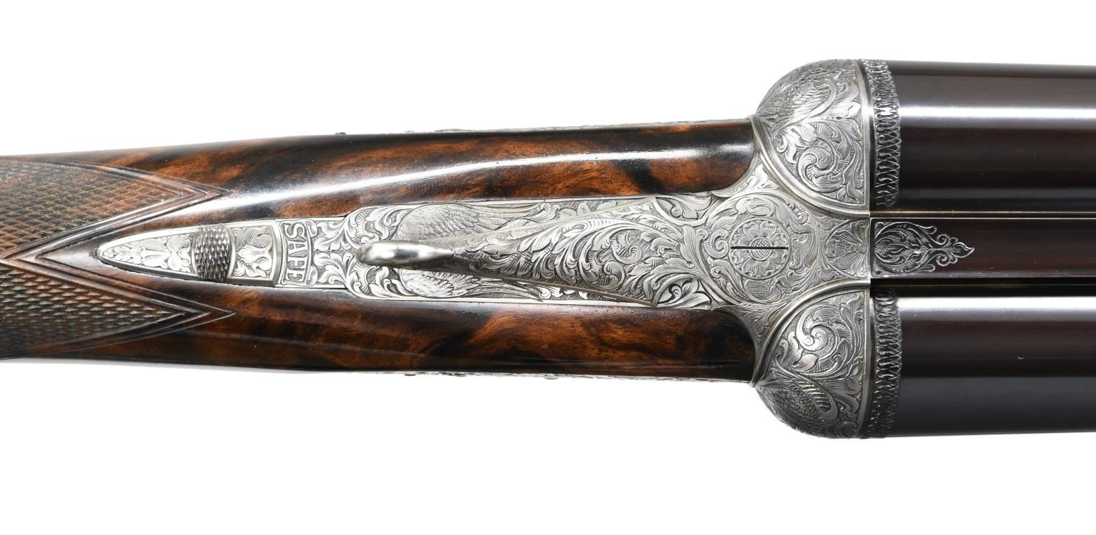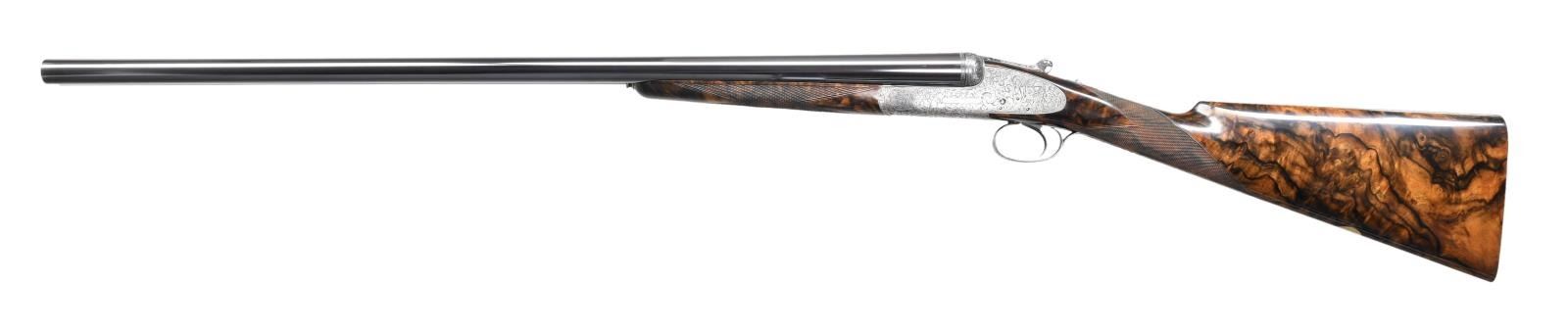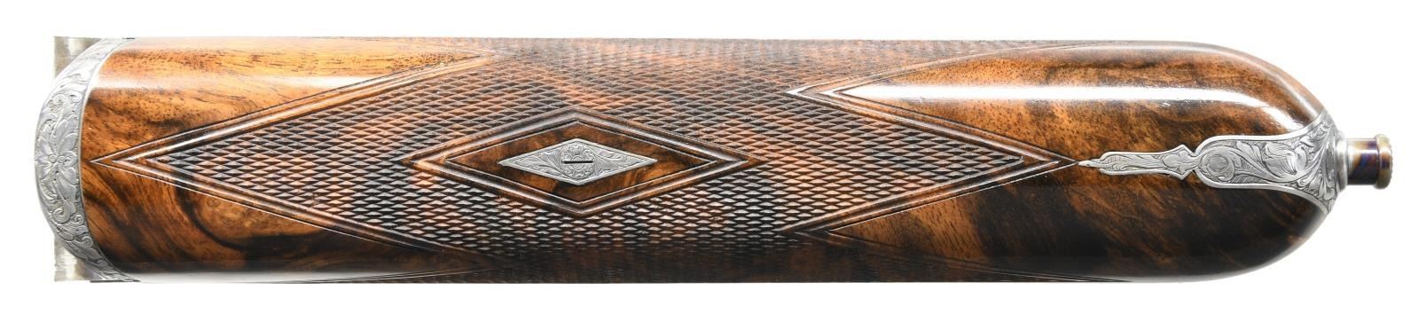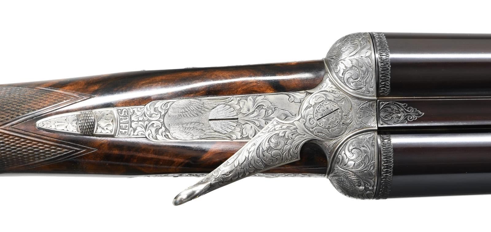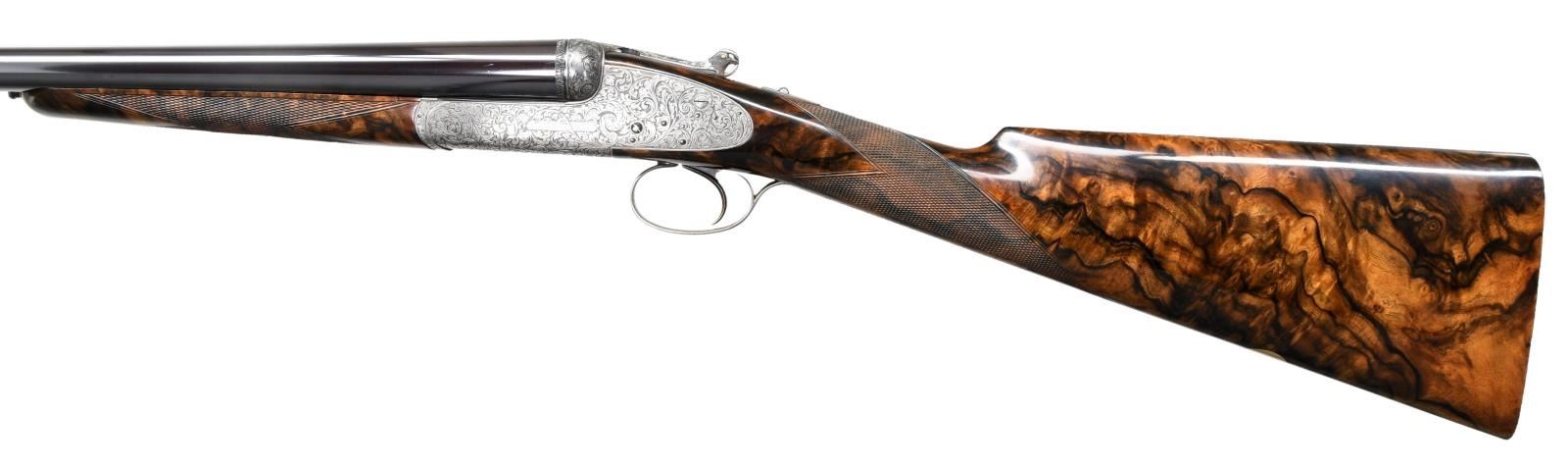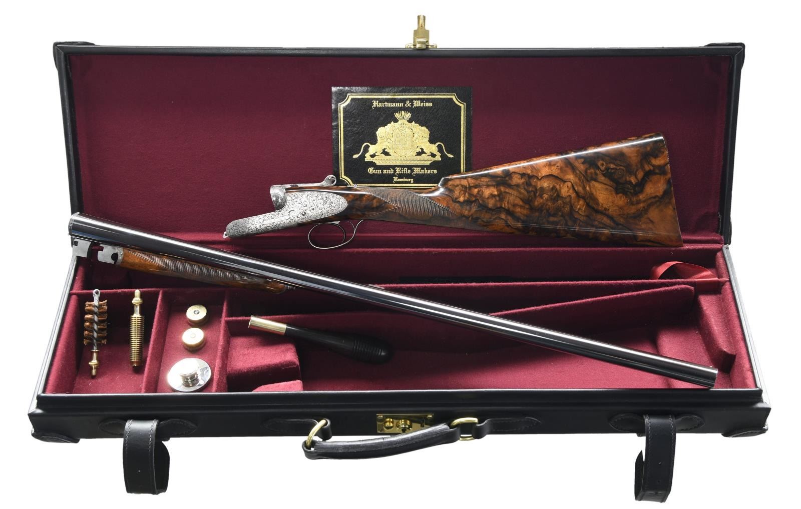 ROUND ACTION SELF-OPENING SIDELOCK EJECTOR SINGLE TRIGGER GAME GUN WITH CASE & ACCESSORIES ENGRAVED WITH CLASSICALLY INSPIRED LARGE SCROLL BY THE RENOWNED KEITH THOMAS. Cal: 12 Ga. 2-3/4”. S#: 2404. The esteemed firm of Hartmann & Weiss is known for its exacting craftsmanship and attention to classic styling, as well as beautiful finishes on their sporting guns and rifles. All are built in house to proven designs which are generally acknowledged to be the best. (Mostly Boss). Mechanically this gun is a re-creation of a 1930’s era round action Boss self–opening sidelock gun incorporating their superb ejector system and highly regarded single trigger. The 28” chopper lump barrels are engraved “Hartmann & Weiss Hamburg” on the narrow slightly swamped game rib. Barrel flats are stamped with June 2013 German nitro proofs for 2-3/4” chambers. Case hardened and coin finished Boss pattern self-opening sidelock round bodied action features automatic safety (“SAFE” engraved), bushed strikers, platinum line tumbler end cocking indicators and Boss style non-selective single trigger. Action and lockplates are filed in Boss’ most desirable “round” fashion without any high edges on wood or metal. Action is engraved by the highly regarded and often noted Keith Thomas who apprenticed at Holland & Holland in the 60’s and went on his own in 1977. Since then he engraves about five to seven bespoke guns per year for some illustrious clients such as Peter Nelson, A.A. Brown and Hartmann & Weiss. His forte is rose and scroll at which he rivals the superb work done by Jack Sumner a century ago. He cut his teeth at H&H engraving large scroll as is found on this gun. This dramatic scroll with acanthus highlights is well shaded and has good depth. It covers essentially 100% of both action and lockplates. Noted accents include griffin heads on fences and a stunning depiction of a Green Man on bottom of action. This central figure has scrolling acanthus radiating from a central grotesque face with inlaid gold eyes. More scroll as breath emanates from its mouth. Another unique accent is the thumb piece of the top lever which is pierced and relief engraved with the head of a raven which also has gold eyes. Hartmann & Weiss is engraved on each lockplate and engraver’s signature is on trigger plate. Single beaded right hand trigger guard is engraved with matching scroll and S# is in relief on a riband on tang. Straight grip buttstock made of an extraordinary piece of wonderfully marbled and burl figured, flesh toned European walnut measures 14-3/4” over checkered wood butt. Checkering is meticulously cut and of point pattern with mullered borders. A vacant gold oval is on toeline. Matching splinter Boss ejector forend has Anson release. MEASUREMENTS BBLS: Bore Diameter: L .727. R .727. Restrictions: L .025(IMOD). R .013 (LIGHT MOD). Wall Thickness: L .031. R .031. Stock: DAH: 2”. DAC: 1-9/16”. CAST: off approx. 1/8”. LOP: 14 ¾”. WEIGHT: 6 lb. 9oz. UNATTACHED ACCESSORIES: gun is housed in its maker’s black leather case, lined in burgundy cloth. A black leather Hartmann & Weiss label is in lid. Case contains a pair of snap caps, round oil bottle and cleaning equipment. CONDITION: very close to “as new”. Purchased by our consignor from Steve Barnett in 2014 as "never fired". It was purchased as an investment and it remained in the case in storage and never fired by the consignor. Proof and both wood and metal retain essentially all of their fine factory finishes with only a minor scattering of handling and assembly marks. Bores are bright and shiny, mechanically crisp. Case is also exceptionally fine with only some minor marks. A very rare opportunity to acquire one of the finest firearms to have ever been built. (24-2139//MGM) MODERN. $75,000-125,000.