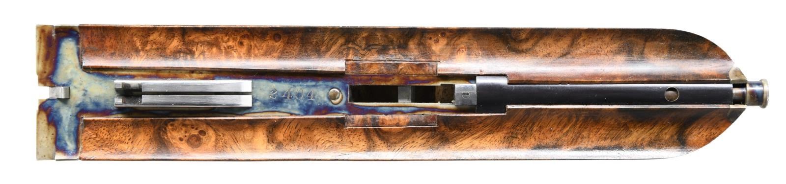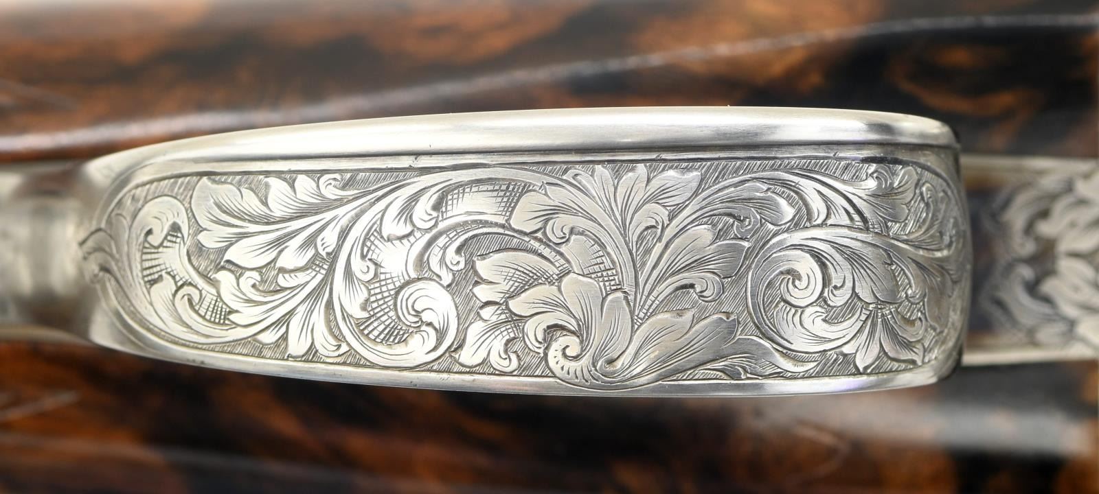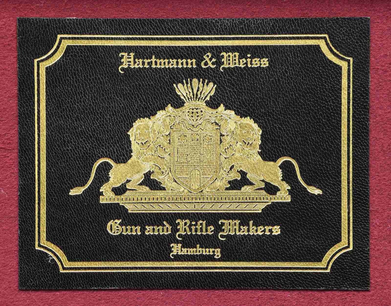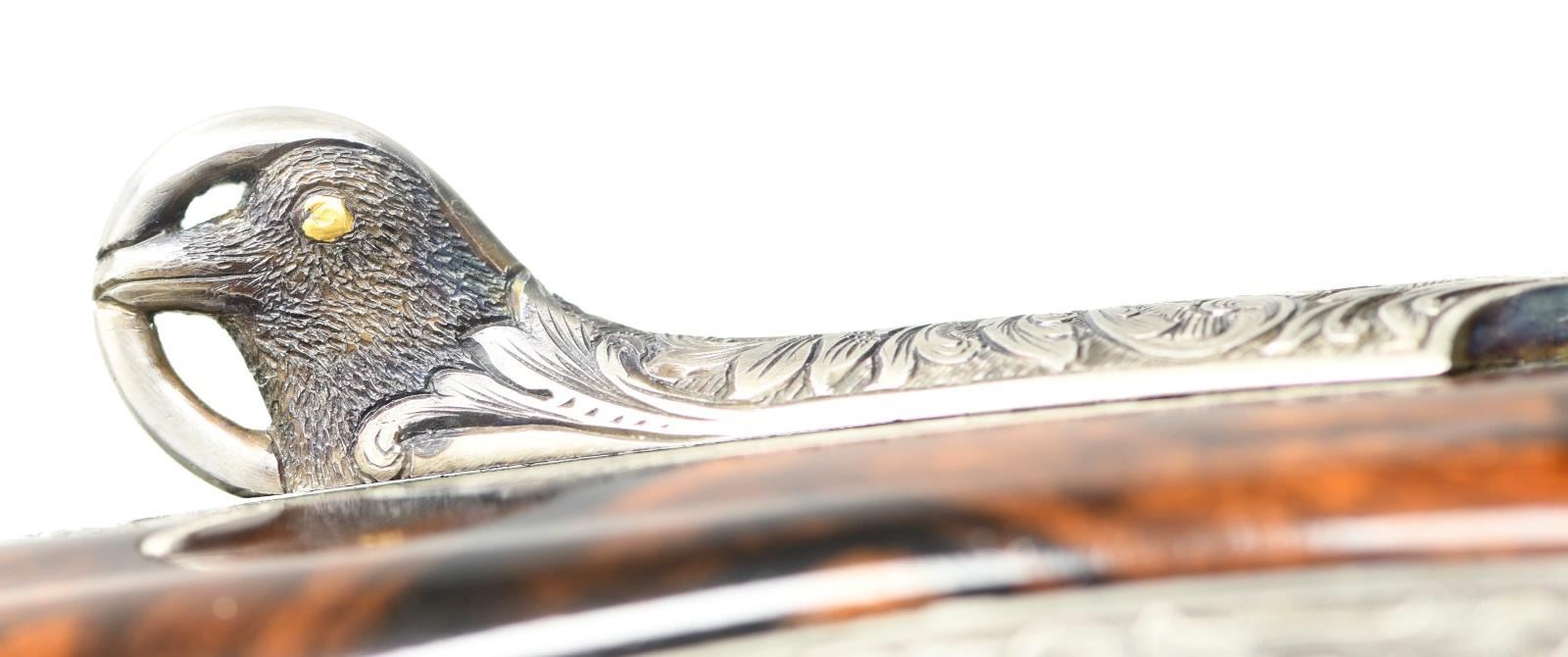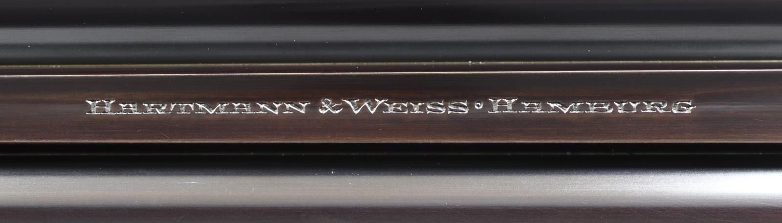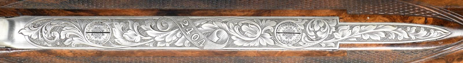 ROUND ACTION SELF-OPENING SIDELOCK EJECTOR SINGLE TRIGGER GAME GUN WITH CASE & ACCESSORIES ENGRAVED WITH CLASSICALLY INSPIRED LARGE SCROLL BY THE RENOWNED KEITH THOMAS. Cal: 12 Ga. 2-3/4”. S#: 2404. The esteemed firm of Hartmann & Weiss is known for its exacting craftsmanship and attention to classic styling, as well as beautiful finishes on their sporting guns and rifles. All are built in house to proven designs which are generally acknowledged to be the best. (Mostly Boss). Mechanically this gun is a re-creation of a 1930’s era round action Boss self–opening sidelock gun incorporating their superb ejector system and highly regarded single trigger. The 28” chopper lump barrels are engraved “Hartmann & Weiss Hamburg” on the narrow slightly swamped game rib. Barrel flats are stamped with June 2013 German nitro proofs for 2-3/4” chambers. Case hardened and coin finished Boss pattern self-opening sidelock round bodied action features automatic safety (“SAFE” engraved), bushed strikers, platinum line tumbler end cocking indicators and Boss style non-selective single trigger. Action and lockplates are filed in Boss’ most desirable “round” fashion without any high edges on wood or metal. Action is engraved by the highly regarded and often noted Keith Thomas who apprenticed at Holland & Holland in the 60’s and went on his own in 1977. Since then he engraves about five to seven bespoke guns per year for some illustrious clients such as Peter Nelson, A.A. Brown and Hartmann & Weiss. His forte is rose and scroll at which he rivals the superb work done by Jack Sumner a century ago. He cut his teeth at H&H engraving large scroll as is found on this gun. This dramatic scroll with acanthus highlights is well shaded and has good depth. It covers essentially 100% of both action and lockplates. Noted accents include griffin heads on fences and a stunning depiction of a Green Man on bottom of action. This central figure has scrolling acanthus radiating from a central grotesque face with inlaid gold eyes. More scroll as breath emanates from its mouth. Another unique accent is the thumb piece of the top lever which is pierced and relief engraved with the head of a raven which also has gold eyes. Hartmann & Weiss is engraved on each lockplate and engraver’s signature is on trigger plate. Single beaded right hand trigger guard is engraved with matching scroll and S# is in relief on a riband on tang. Straight grip buttstock made of an extraordinary piece of wonderfully marbled and burl figured, flesh toned European walnut measures 14-3/4” over checkered wood butt. Checkering is meticulously cut and of point pattern with mullered borders. A vacant gold oval is on toeline. Matching splinter Boss ejector forend has Anson release. MEASUREMENTS BBLS: Bore Diameter: L .727. R .727. Restrictions: L .025(IMOD). R .013 (LIGHT MOD). Wall Thickness: L .031. R .031. Stock: DAH: 2”. DAC: 1-9/16”. CAST: off approx. 1/8”. LOP: 14 ¾”. WEIGHT: 6 lb. 9oz. UNATTACHED ACCESSORIES: gun is housed in its maker’s black leather case, lined in burgundy cloth. A black leather Hartmann & Weiss label is in lid. Case contains a pair of snap caps, round oil bottle and cleaning equipment. CONDITION: very close to “as new”. Purchased by our consignor from Steve Barnett in 2014 as "never fired". It was purchased as an investment and it remained in the case in storage and never fired by the consignor. Proof and both wood and metal retain essentially all of their fine factory finishes with only a minor scattering of handling and assembly marks. Bores are bright and shiny, mechanically crisp. Case is also exceptionally fine with only some minor marks. A very rare opportunity to acquire one of the finest firearms to have ever been built. (24-2139//MGM) MODERN. $75,000-125,000.