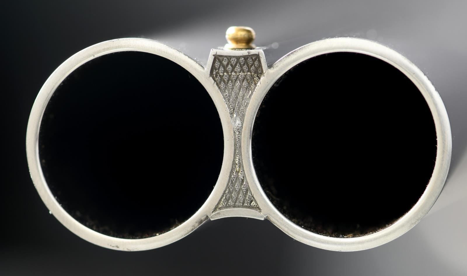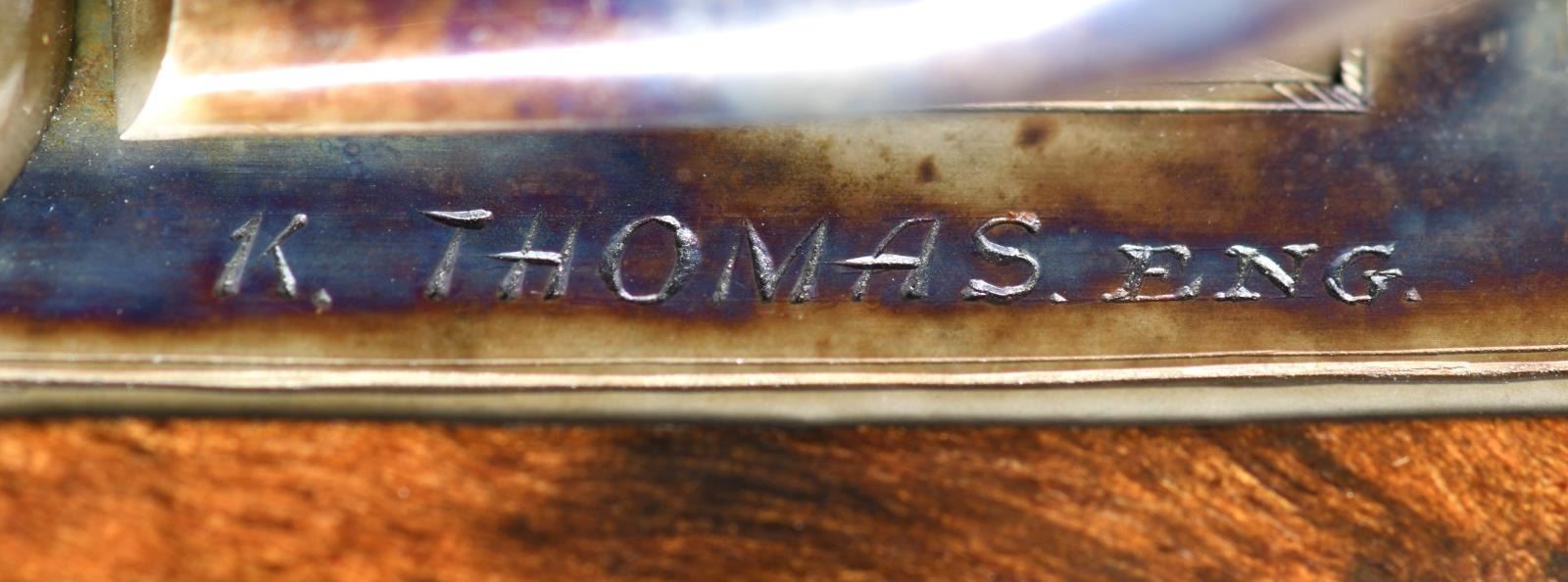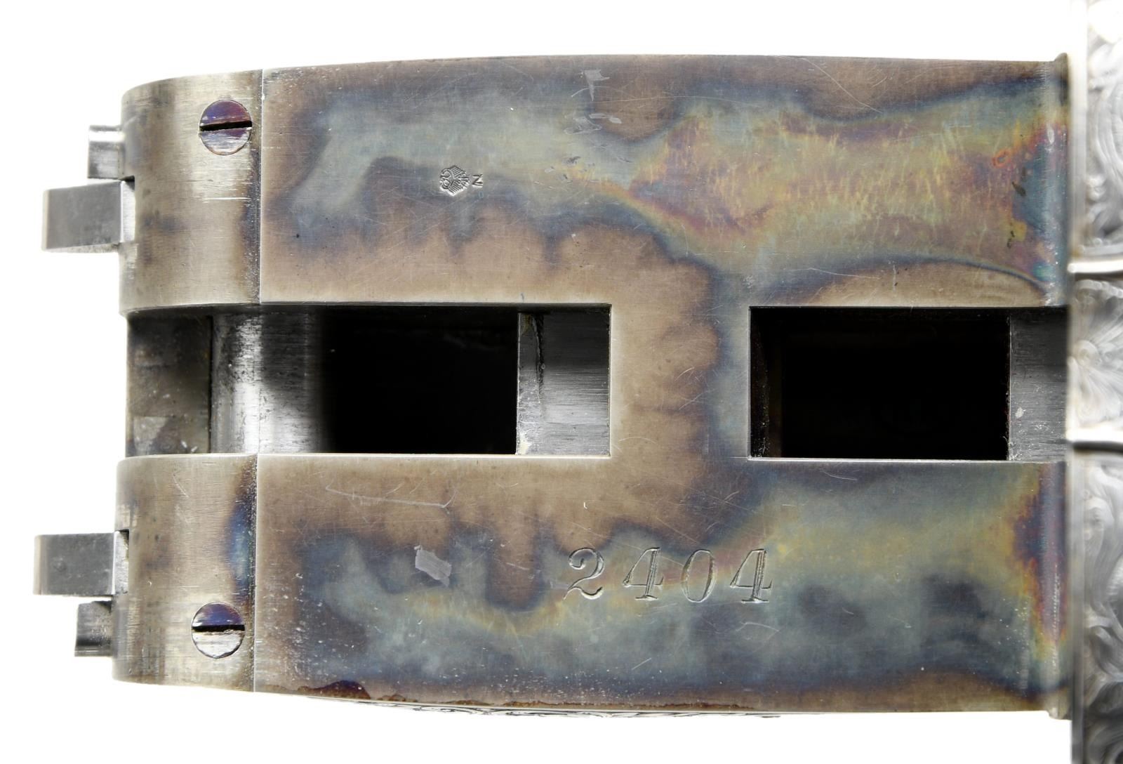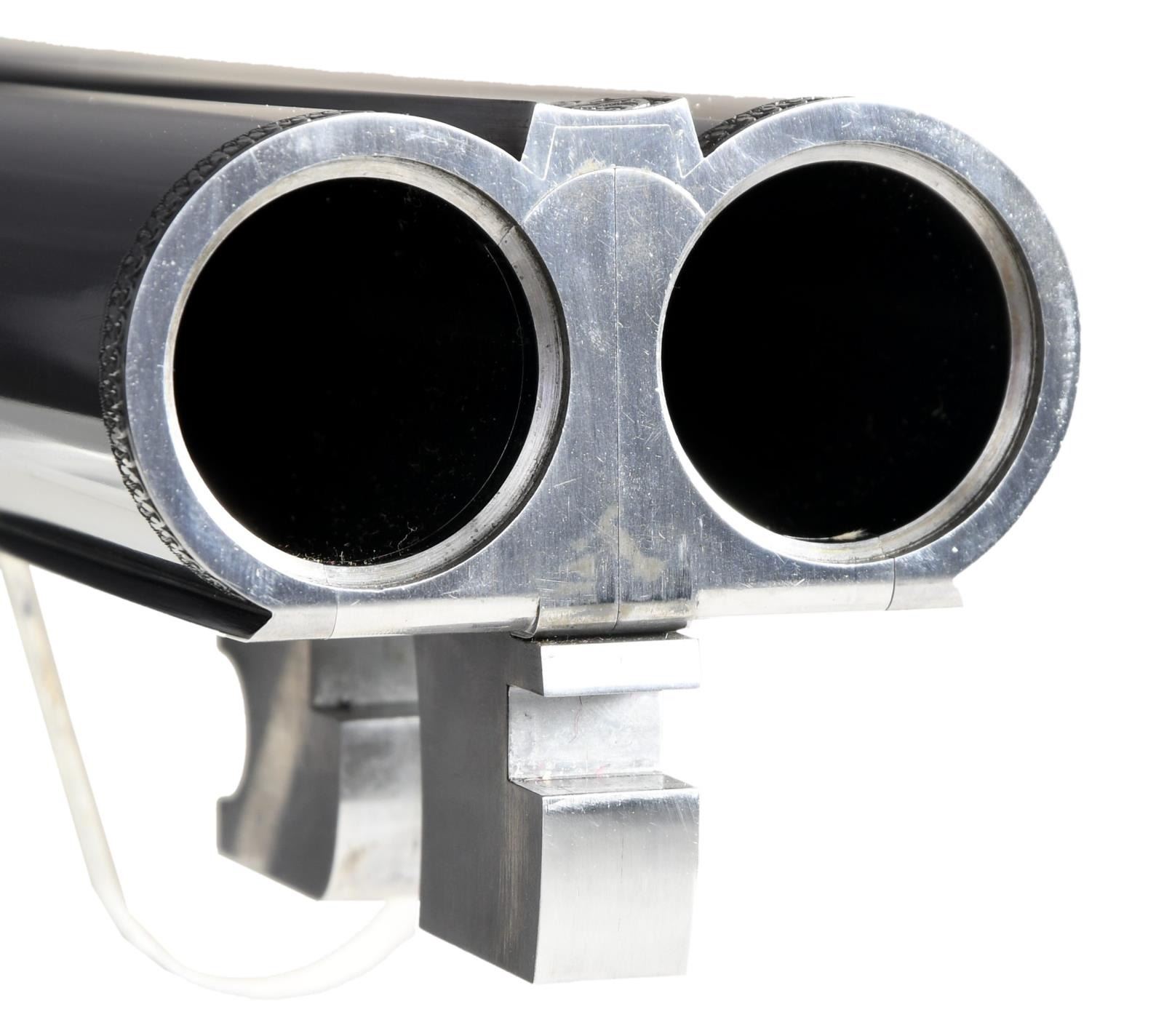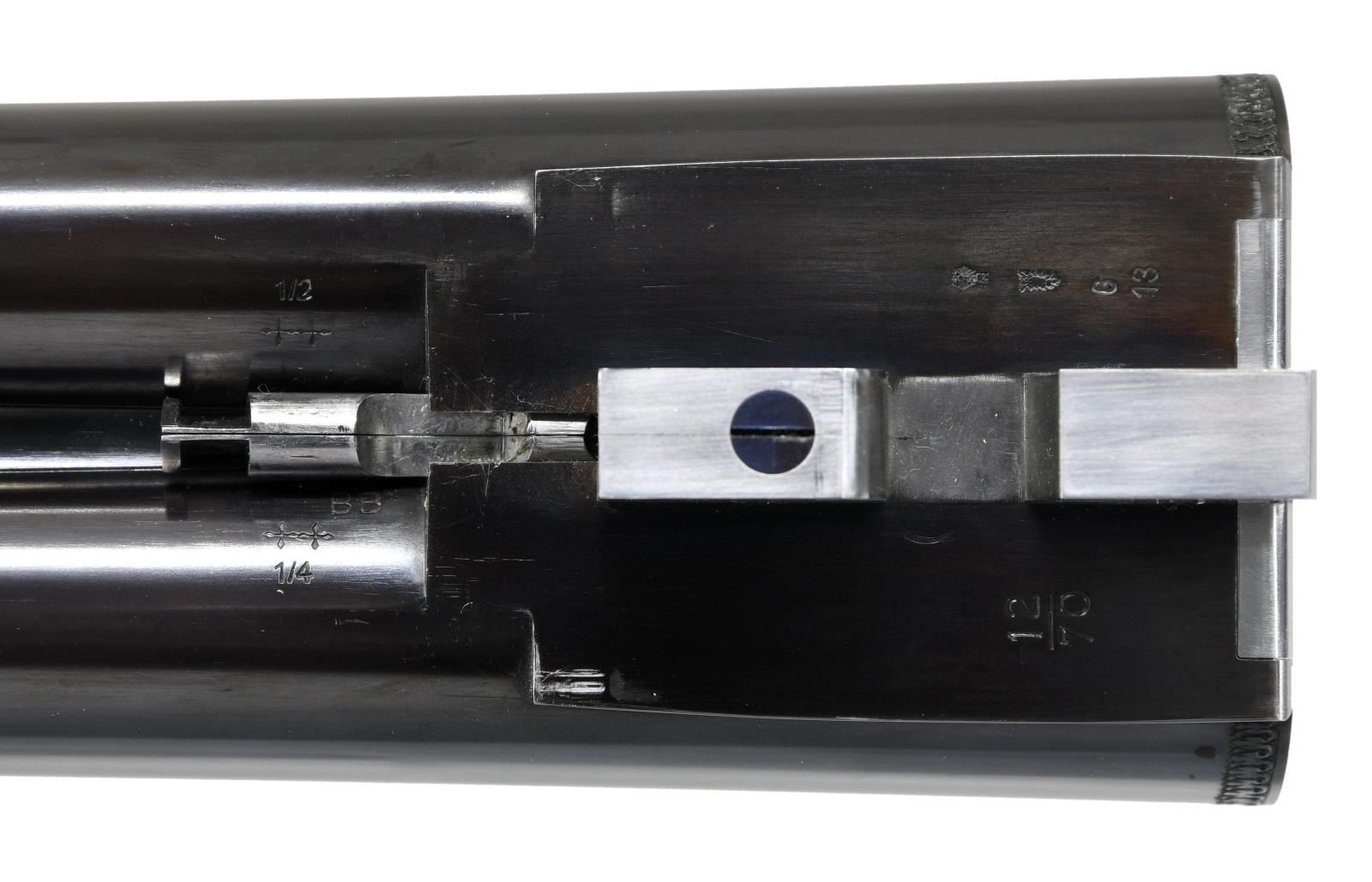 ROUND ACTION SELF-OPENING SIDELOCK EJECTOR SINGLE TRIGGER GAME GUN WITH CASE & ACCESSORIES ENGRAVED WITH CLASSICALLY INSPIRED LARGE SCROLL BY THE RENOWNED KEITH THOMAS. Cal: 12 Ga. 2-3/4”. S#: 2404. The esteemed firm of Hartmann & Weiss is known for its exacting craftsmanship and attention to classic styling, as well as beautiful finishes on their sporting guns and rifles. All are built in house to proven designs which are generally acknowledged to be the best. (Mostly Boss). Mechanically this gun is a re-creation of a 1930’s era round action Boss self–opening sidelock gun incorporating their superb ejector system and highly regarded single trigger. The 28” chopper lump barrels are engraved “Hartmann & Weiss Hamburg” on the narrow slightly swamped game rib. Barrel flats are stamped with June 2013 German nitro proofs for 2-3/4” chambers. Case hardened and coin finished Boss pattern self-opening sidelock round bodied action features automatic safety (“SAFE” engraved), bushed strikers, platinum line tumbler end cocking indicators and Boss style non-selective single trigger. Action and lockplates are filed in Boss’ most desirable “round” fashion without any high edges on wood or metal. Action is engraved by the highly regarded and often noted Keith Thomas who apprenticed at Holland & Holland in the 60’s and went on his own in 1977. Since then he engraves about five to seven bespoke guns per year for some illustrious clients such as Peter Nelson, A.A. Brown and Hartmann & Weiss. His forte is rose and scroll at which he rivals the superb work done by Jack Sumner a century ago. He cut his teeth at H&H engraving large scroll as is found on this gun. This dramatic scroll with acanthus highlights is well shaded and has good depth. It covers essentially 100% of both action and lockplates. Noted accents include griffin heads on fences and a stunning depiction of a Green Man on bottom of action. This central figure has scrolling acanthus radiating from a central grotesque face with inlaid gold eyes. More scroll as breath emanates from its mouth. Another unique accent is the thumb piece of the top lever which is pierced and relief engraved with the head of a raven which also has gold eyes. Hartmann & Weiss is engraved on each lockplate and engraver’s signature is on trigger plate. Single beaded right hand trigger guard is engraved with matching scroll and S# is in relief on a riband on tang. Straight grip buttstock made of an extraordinary piece of wonderfully marbled and burl figured, flesh toned European walnut measures 14-3/4” over checkered wood butt. Checkering is meticulously cut and of point pattern with mullered borders. A vacant gold oval is on toeline. Matching splinter Boss ejector forend has Anson release. MEASUREMENTS BBLS: Bore Diameter: L .727. R .727. Restrictions: L .025(IMOD). R .013 (LIGHT MOD). Wall Thickness: L .031. R .031. Stock: DAH: 2”. DAC: 1-9/16”. CAST: off approx. 1/8”. LOP: 14 ¾”. WEIGHT: 6 lb. 9oz. UNATTACHED ACCESSORIES: gun is housed in its maker’s black leather case, lined in burgundy cloth. A black leather Hartmann & Weiss label is in lid. Case contains a pair of snap caps, round oil bottle and cleaning equipment. CONDITION: very close to “as new”. Purchased by our consignor from Steve Barnett in 2014 as "never fired". It was purchased as an investment and it remained in the case in storage and never fired by the consignor. Proof and both wood and metal retain essentially all of their fine factory finishes with only a minor scattering of handling and assembly marks. Bores are bright and shiny, mechanically crisp. Case is also exceptionally fine with only some minor marks. A very rare opportunity to acquire one of the finest firearms to have ever been built. (24-2139//MGM) MODERN. $75,000-125,000.