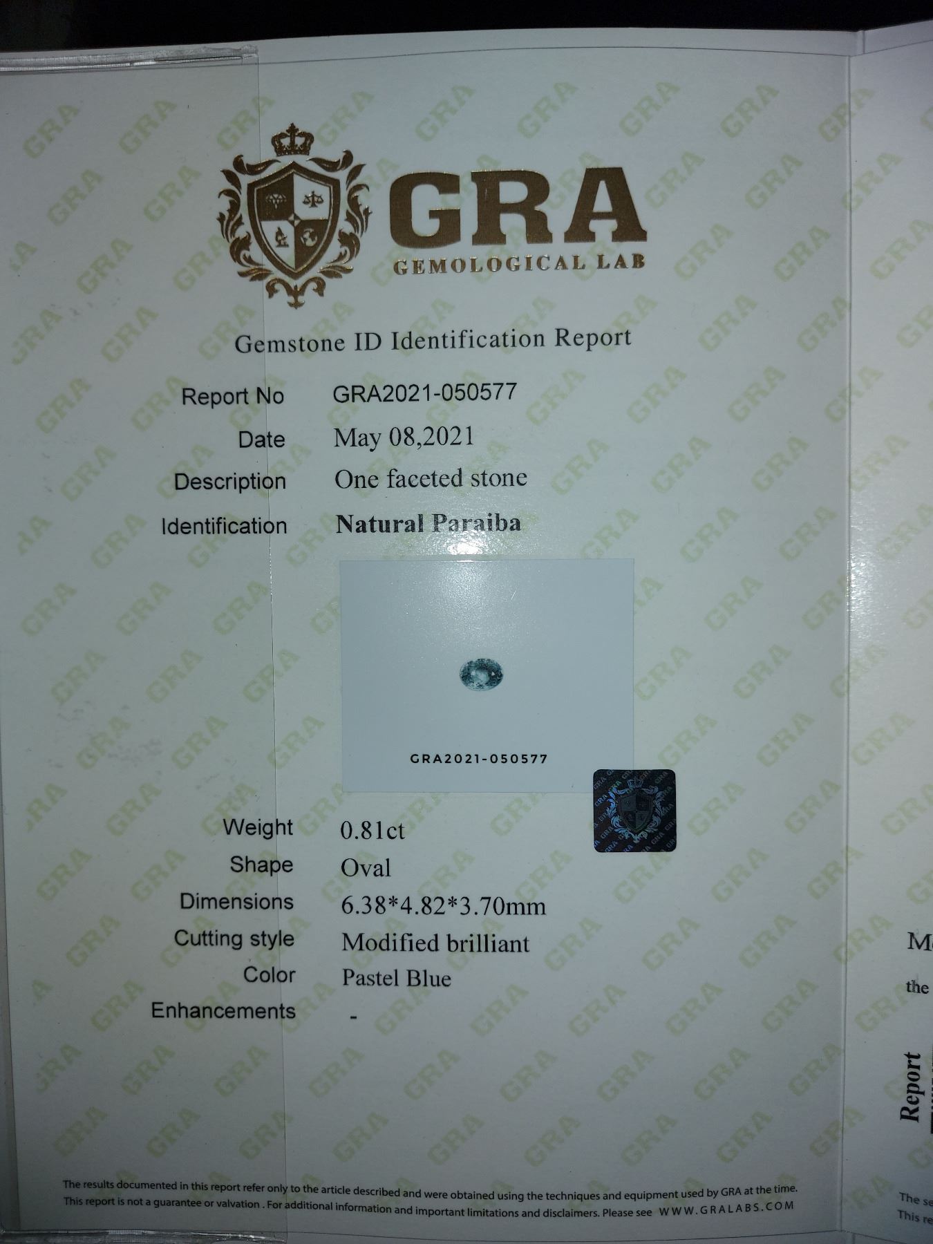 0.81 ct. 6.38 x 4.82 x 3.70 mm Colour: PASTEL BLUE, Shape: Oval- Modified Brilliant Cut , Clarity: VS , Luster: Exceptional, Origin: Brazil , Untreated
