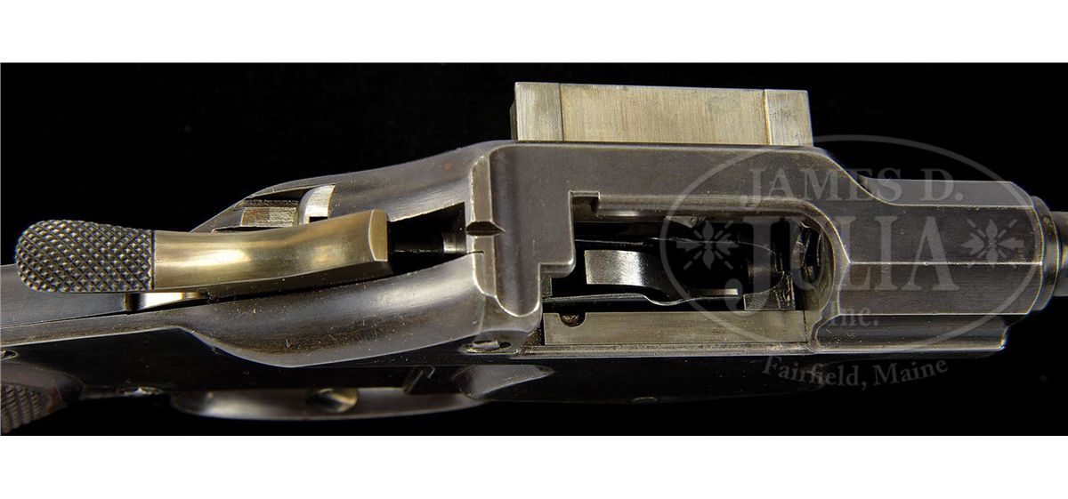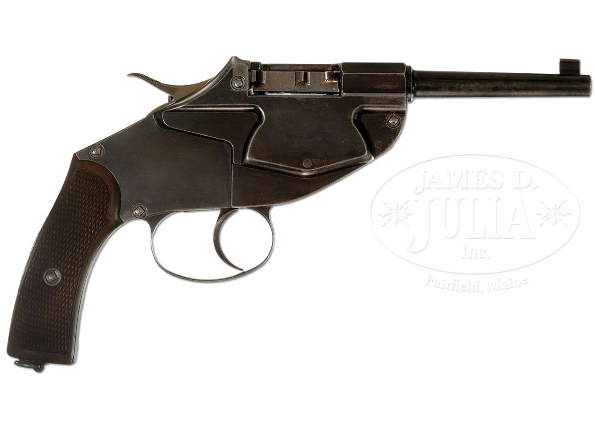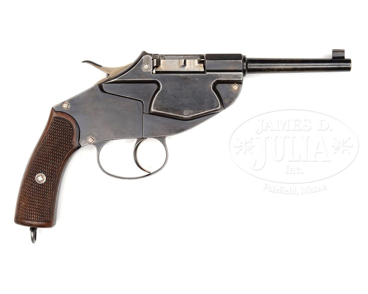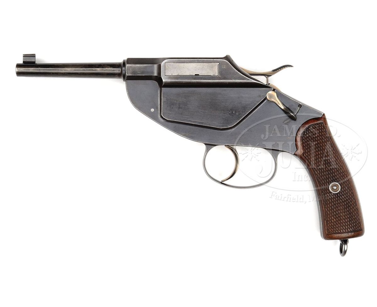 SN 13. Cal. 7.5mm. An extremely unusual repeating pistol whose breech block operates through transverse horizontal movement. The gun is fitted with a 3.5" bbl having a fixed front and a fixed rear sight. Except for the serial number that appears on the left side of the frame, there are no other markings. The bbl and frame are blued. The bolt is in-the-white and hammer, trigger and safety are strawed. Curiously, there are no slotted screws. All fastening is done through square headed bolts, all evident on the right side of the gun. The hammer has a half cock and a full cock and operates either as single action (cock hammer to operate and fire) or double action (cocked, operated and fired by trigger motion alone)repeater. Bringing the hammer to half cock moves the bolt horizontally to the left, exposing the entire chamber, while simultaneously moving the extractor rearward to eject a fired cartridge case. The magazine is fed from above with a stripper clip. Continuing the hammer cock pushes a loading arm forward that feeds the next round into the chamber. Near the end of the hammer movement the bolt returns to the right into the closed position, aligning a freely moving pin in the frame with a concentric firing pin in the bolt. After pulling the trigger to drop the hammer, the trigger springs back to its original position during which time the loading arm retracts and the cycling arm repositions the bolt for the next operation phase. Mounted to the left frame is checkered safety lever that blocks the mechanism when moved up. Pistol has checkered and bordered grips secured with a single square headed bolt. Less than 20 of these pistols were made (in two versions) at the Royal Firearms Factory, Spandau, in 1891/92 for trials by the German Army (GPK)in their search for a replacement of the M1884 Reichsrevolver. Only one other example, of the alternative design, is known to exist in the Werhtechnische Studiensammlung of the German Bundewehr in Koblenz. The designer and constructor in the Factory was Louis Schlegelmilch, then the chief armourer at the Spandau Arsenal. PROVENANCE: Dr. Geoffrey Sturgess Collection, ex Visser collection, illustrated in "The Borchardt and Luger Automatic Pistols" by Sturgess. CONDITION: Approximately 95% bright blue with some fading of the bbl and minor toning. Negligible oxidation. Straw on hammer, safety, trigger and square headed bolts in the same condition. Mirror bore with strong rifling showing minimal use. An exceedingly complex repeater, manual function is like the proverbial Swiss watch. A wonder to operate and a mechanical masterpiece and a near unique example of a German military trials pistol! 4-52456 LMA98