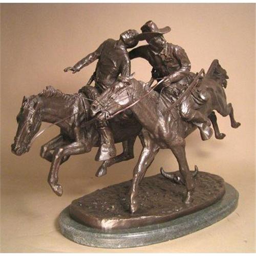 The Wounded Bunkie was the second of Frederic Remington's sculptures and recieved much critical success. The sculpture depicts a wounded trooper who is kept steady by the support of an extended arm from a fellow rider as their horses bolt at full gallop. Remington was praised by critics who hailed his complete mastery of the nature and anatomy of the horse. The action is superb ... the whole group in the most natural manner possible. This artwork is mounted onto a marble base, stands a substantial 21 high by 32 wide, and is signed Frederic Remington in the bronze.