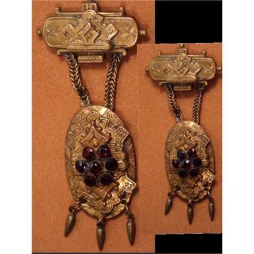 This dates in the early 1900?s and it has hand cut genuine bohemian garnets in it. The brooch is quite long ( 3 ½" ) and is made of heavy brass. This also has the three solid tassels at the bottom. The work on this is really beautiful and other than a light cleaning it is in great gently used condition.