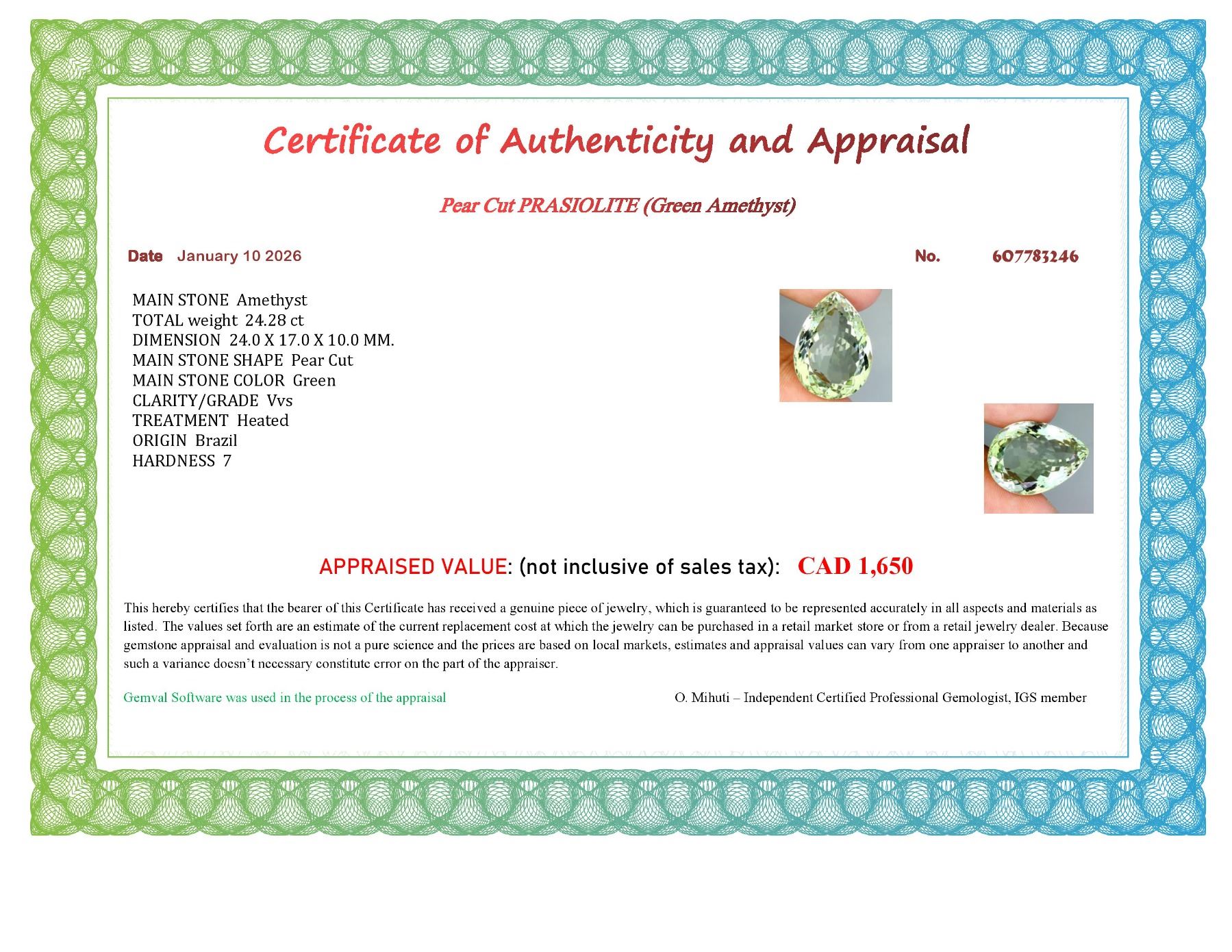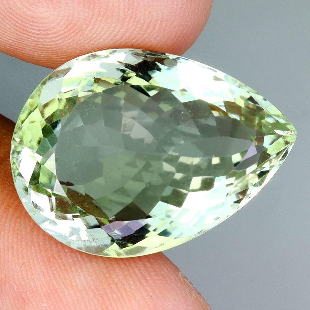 EXTREME CLARITY BIG 24.28 CARATS PEAR CUT NATURAL TOP RICH GREEN AMETHYST (PRASIOLITE) FROM BRAZIL 24X17 mm - APPRAISED REPLACEMENT VALUE CAD 1,650