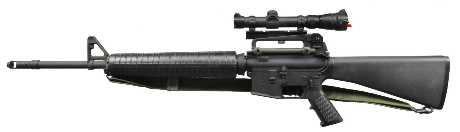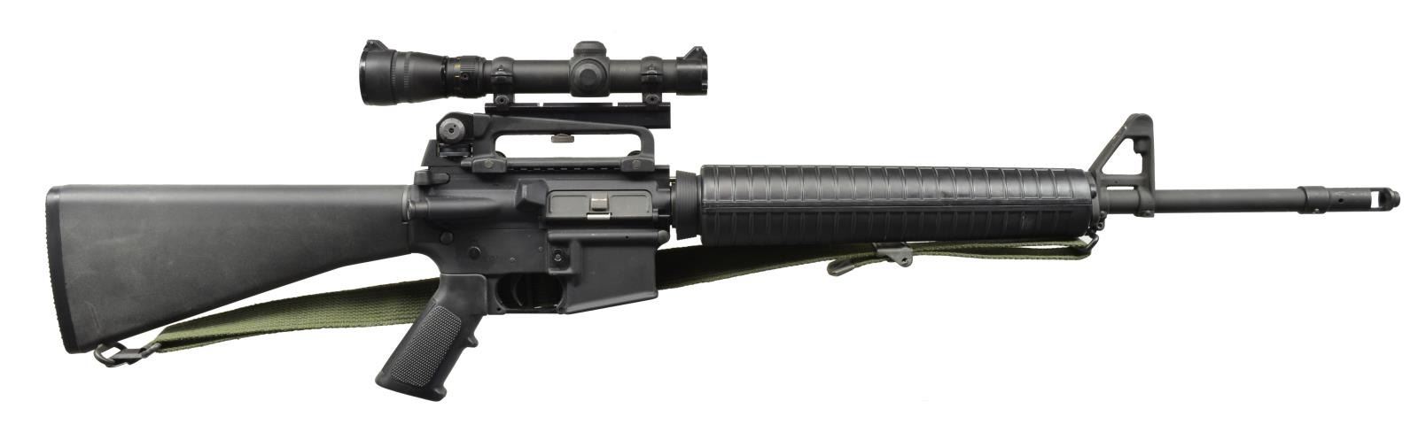 H-BAR. Cal. 223. S# L156026. Bbl. 20". Windham, ME Bushmaster XM15-E2S w/ 20" heavy bbl. Flat top upper receiver w/ brass deflector & rnd. forward assist. Full length gas system & rnd. handguards. Tapered Delta ring. Traditional protected post elevation adj. front sight. Detachable carry handle w/ adj. “E2” rear sight. Scope adapter for carrying handle w/ 1 X-4X Redfield 5-star scope. Aftermarket flash hider/muzzle brake that appears to be pin over threads. No bayonet lug. 10.5" A2 style rear stock w/ trapdoor. Sling swivels front & rear w/ green canvas sling. CONDITION: finish on all exposed metal surfaces complete w/ very few handling marks. Plastic furniture is also unblemished. Glass in scope appears clear. Outwardly it seems this rifle has been utilized very little. Fire control mechanism appears to function correctly when cycled by hand. Shiny bore w/ strong rifling. (20-1851/JZ). MODERN. $600-900.