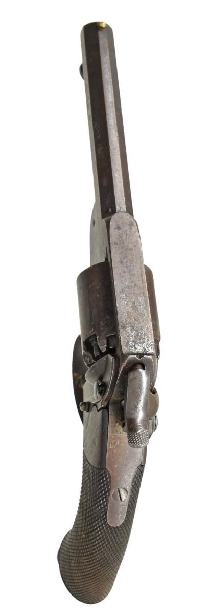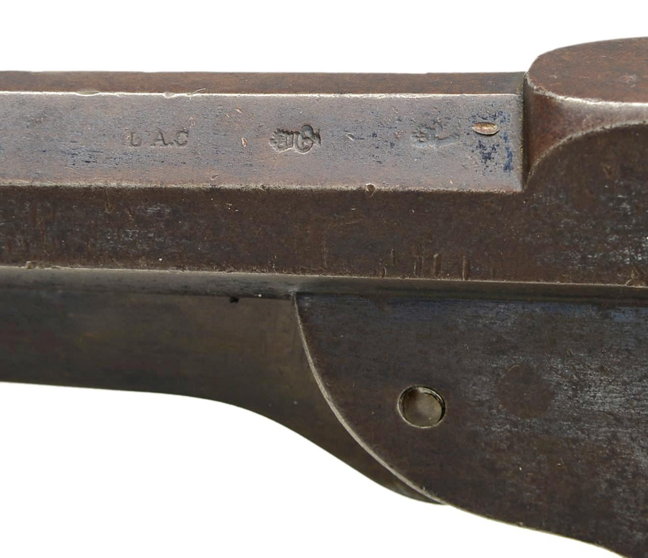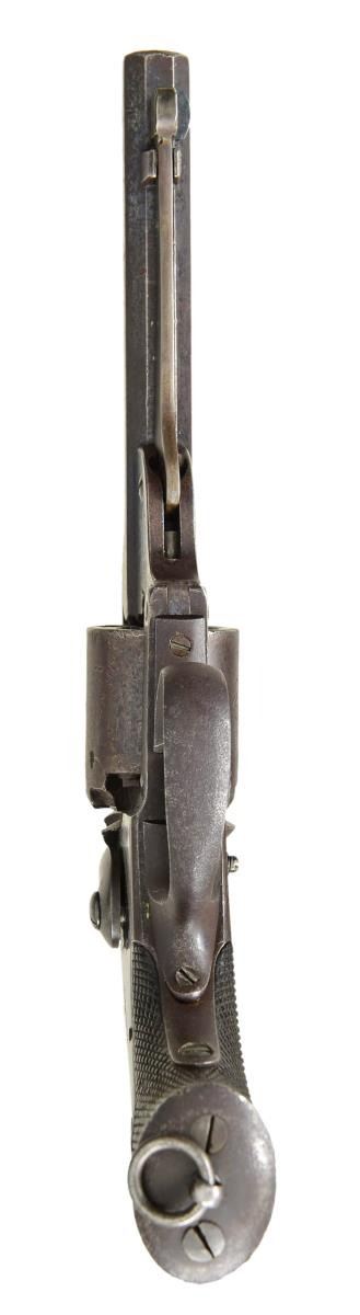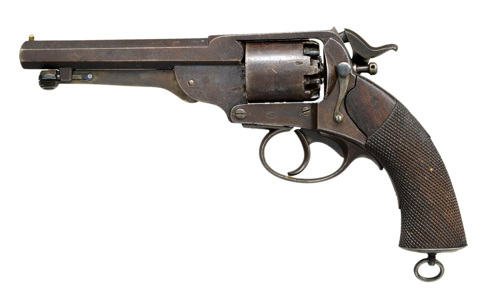 . Cal. 44. Oct. bbl. measures 5 3/4" from cylinder. Nearly all Kerr revolvers saw Confederate service. This is an exceptionally early example having one of the lowest serial numbers known. It has a 5 shot cyl. & is marked on the right side below the cyl., “KERR’S PATENT 1435.”. It is further marked on the right grip strap, “LONDON ARMOURY”. The left side marked, “LONDON ARMOURY” in an oval below the cyl. There are British proofs marks between each nipple on the cyl. The letters “L.A.C”, a proof mark & a crowned “V” are stamped on the left flat of the oct. bbl. The revolver has a 1 piece checkered grip w/ a lanyard ring at the base. CONDITION: revolver retains a substantial amount of original bluing mixed w/ light case colors on the loading arm, hammer & lock. Grips retain strong checkering but little finish. Single action mechanism functions well. Bore is good but a bit dirty. (01-19088 /BF). ANTIQUE. $3,000-5,000.