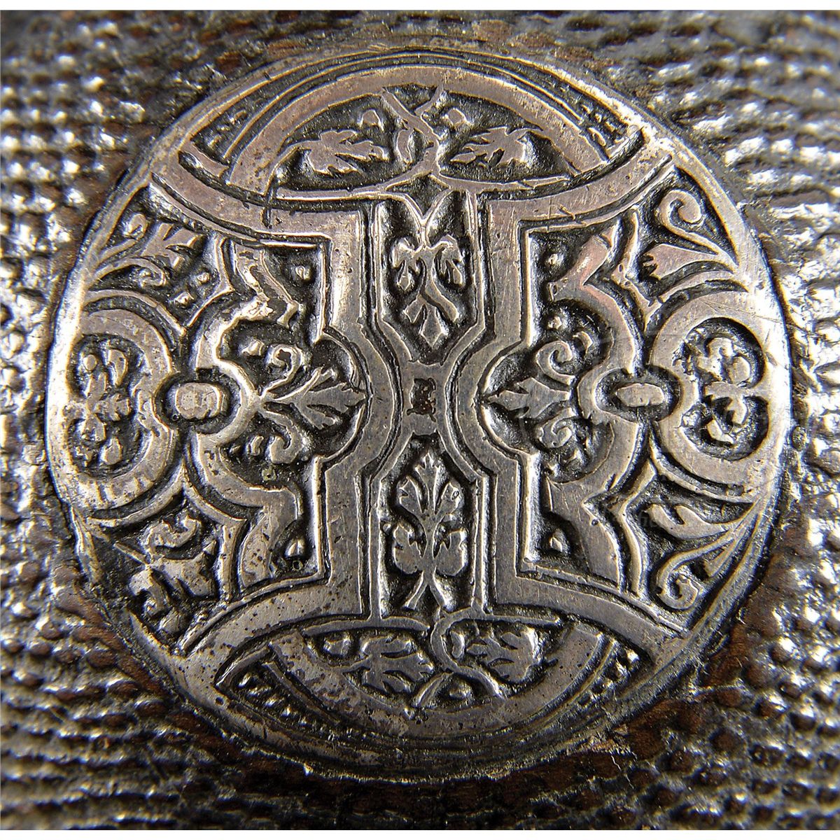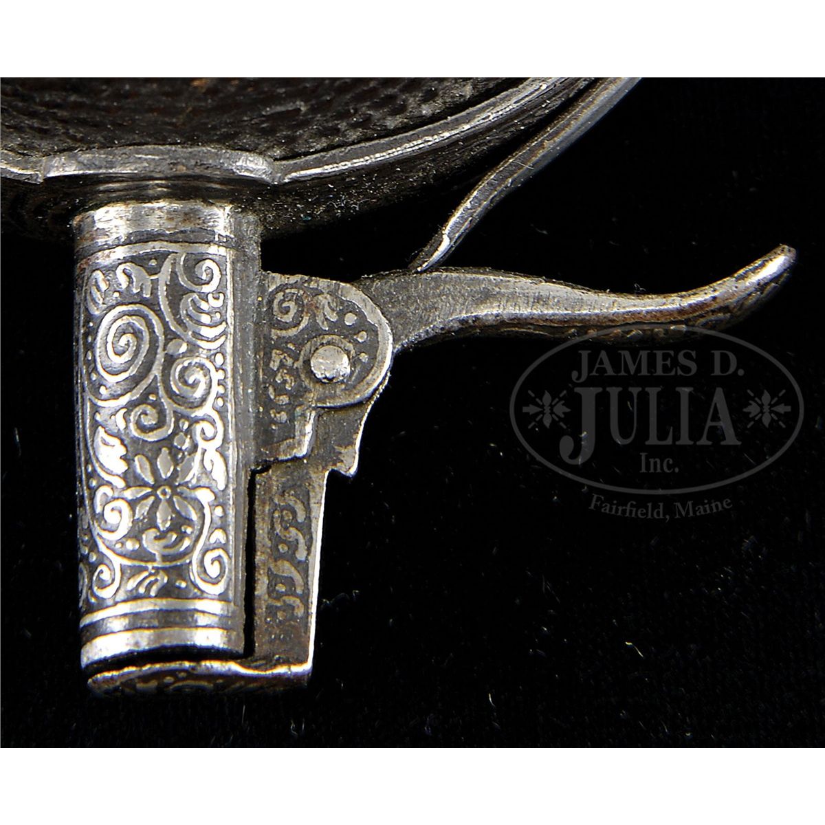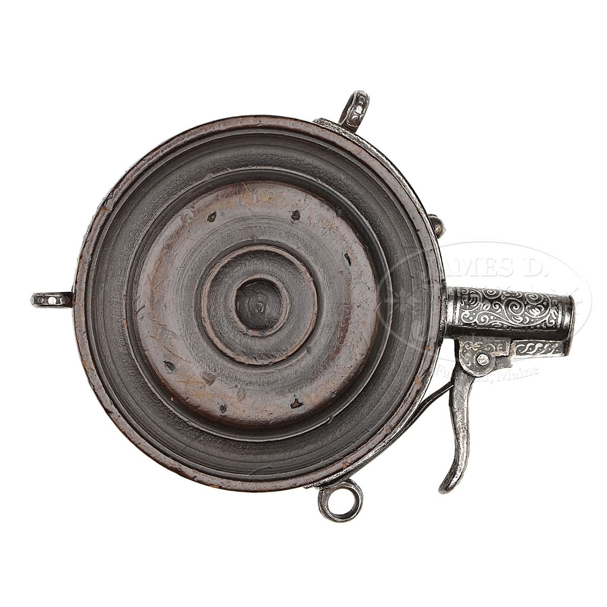 NSN. The iron finely etched on a blackened ground with florals and scrolls. The wooden body stamped to imitate shagreen sharkskin. Wooden body inlaid with a large silver rondel cast and chased with strapwork and foliage. PROVENANCE: Prince Ernst Heinrich of Saxony 1926. Bashford Dean. Stephen V. Grancsay, Brooklyn, NY. Frank E. Bivens, Jr. Mango Way, Los Angeles, CA. Clay P. Bedford. Peter Bedford. Collection of Dr. Douglas Sirkin. Publications: 42 year scrapbook of Varitype Firearms by Theodore Dexter featuring the Frankie Bivens, Jr. collection. "Decorated Firearms" by Wallace B. Gusler and James D. Lavin, pgs. 123 & 124. CONDITION: Virtually as the day it was made with only light staining and no damage or pitting after 400 plus years. 4-49802-2 MZ14