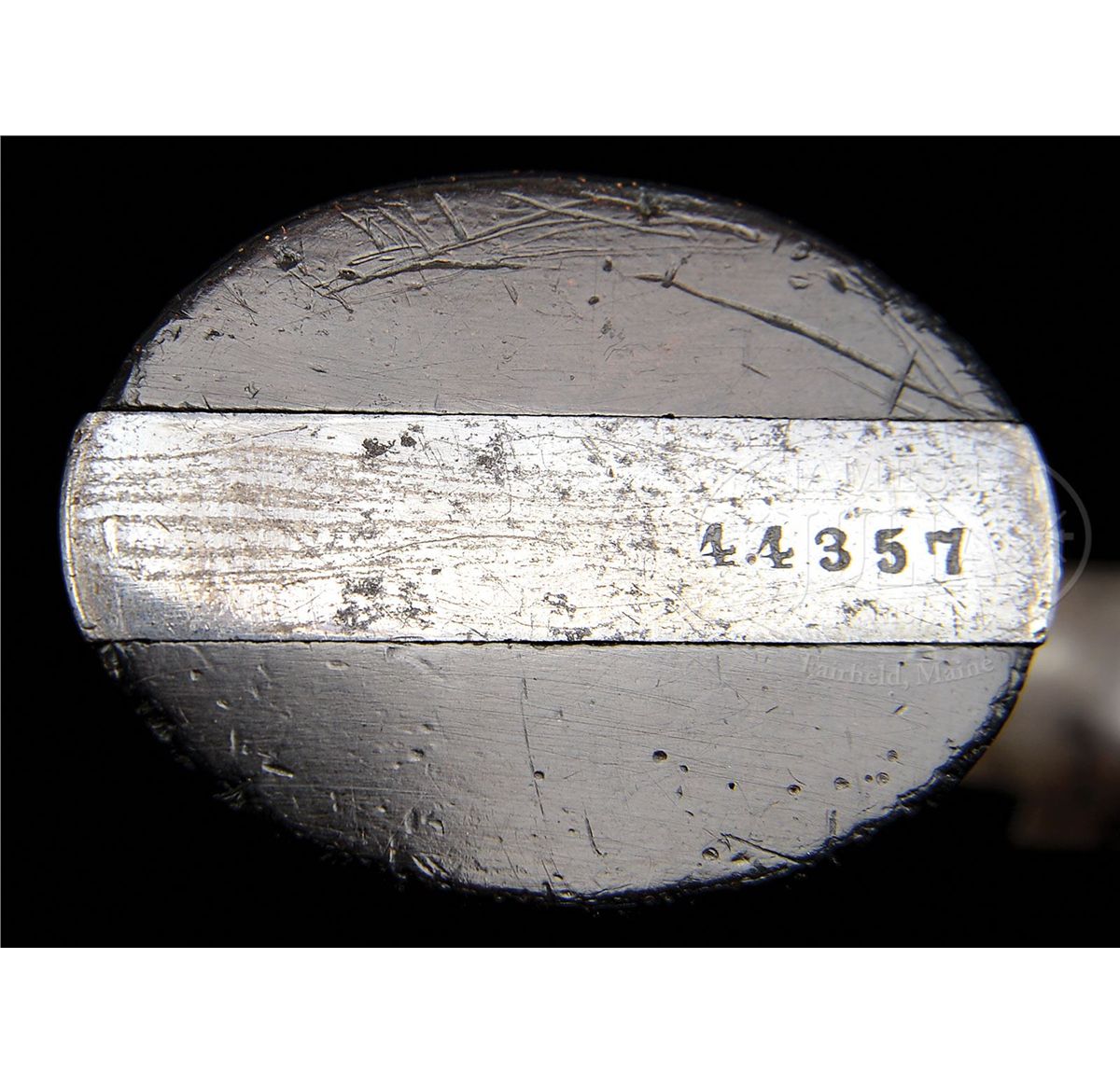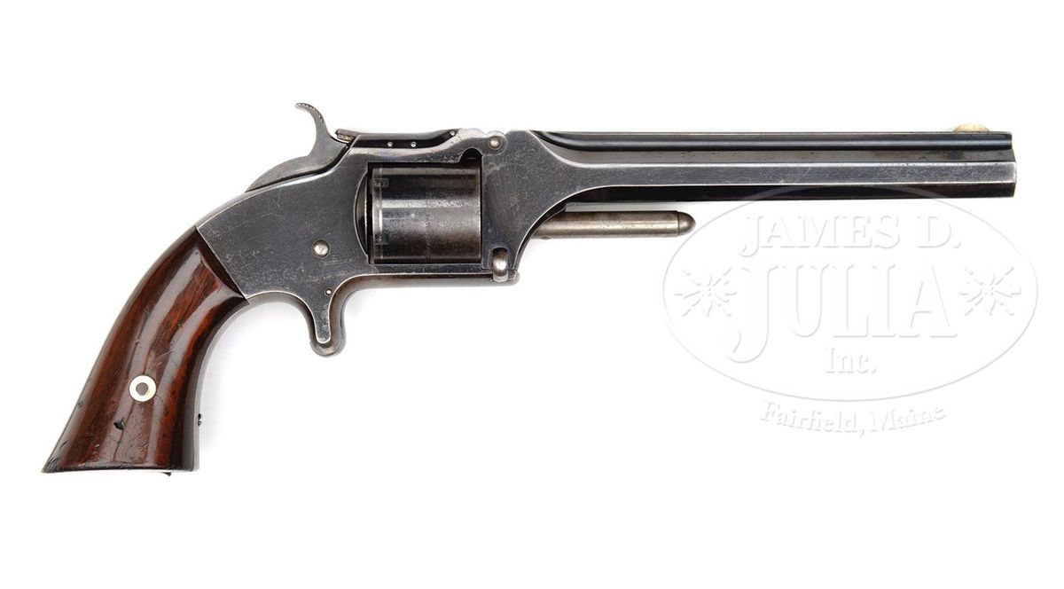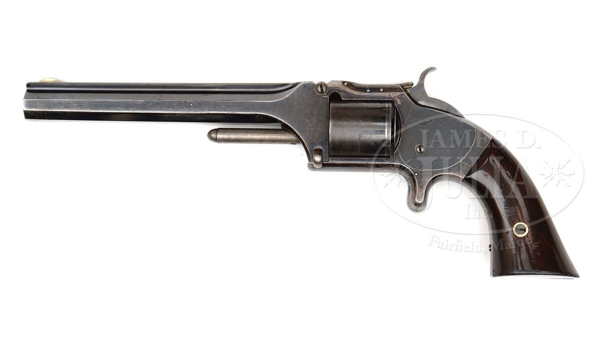 SN 44357. Cal. 32. This is an extremely fine example of the popular Civil War Smith & Wesson army revolver with 6" bbl. Based on serial number this gun was made near Civil War's end in 1865-66. This gun retains almost all of its original finish and is as fine an example as you will encounter. Case colors are evident on the hammer, trigger and ejector rod. The gun has matching assembly numbers, and the SN is stamped on the inside of the grip. PROVENANCE: Marlan Polhemus Collection. CONDITION: Gun retains about 90% of its orig bright blue finish on frame and bbl with minor staining. Cylinder retains about half of its original finish though thinning turning brown/silver. Maker and patent marks on bbl flat and cylinder are crisp and easily read as are serial numbers. Rosewood grips are sound and solid retaining almost all their original varnished finish. Mechanically gun functions well with crisp shiny rifling. 4-48723 JS68