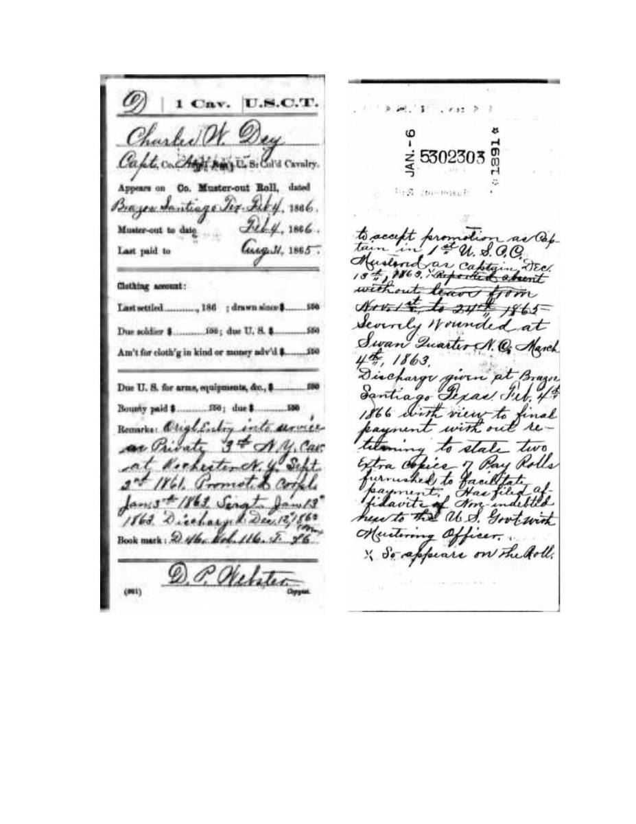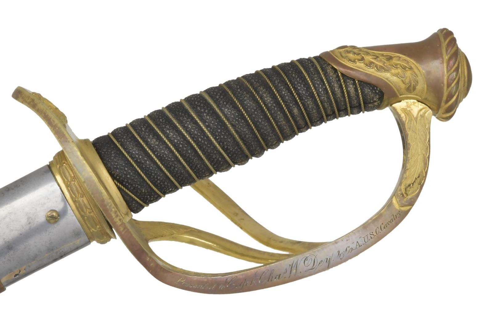 CAVALRY OFFICER’S SABER, CAPT. CHARLES, US COLORED CAVALRY. This beautiful cavalry saber has a 35" nearly mint blade w/ bright frosted panels etched “TIFFANY & CO. N.Y.” on ricasso above Collin’s blade maker stamp. Gold plated hilt has raised relief eagle on quillon, raised relief oakleaf decorated pommel, chased incised design on branches. Knuckle bow is engraved in script “Presented to Capt. Charles W. Dey by Co. “A” U.S.C. Cavalry”. Scabbard has a high relief decorated gilt mounts en suite to hilt design. Charles W. Dey from Medina, NY, entered service September 2, 1861 in the 3rd New York cavalry as a 21 year old private, he was promoted to Cpl. & Sgt., severely wounded March 4, 1863 at Swan Quarter, North Carolina. While recuperating he was commissioned as captain in newly organized Co. A 1st US Colored Cavalry, December 13, 1863 at Camp Hamilton, VA. Unit saw service in the department of Virginia & North Carolina being stationed at Fort Monroe & Williamsburg till May 1864. Now part of Butler’s Army south of the James River, they saw service against Petersburg & Richmond, capture of Bermuda hundred & City Point, Swift Creek, Fort Darling, Drewry’s Bluff, Baylor’s Farm, siege of Petersburg, Deep Bottom, ordered back to Fortress Monroe in August, duty at Newport News & Portsmouth, VA till May 1865. In June, the 1st was sent to Texas for duty in the Rio Grande Valley where they would serve till mustered out February 1866 in Brazos Santiago, TX as was Captain Dey. Regiment lost during service 3 Officers & 48 Enlisted men killed & mortally wounded; & 2 Officers & 177 Enlisted men by disease. UNATTACHED ACCESSORIES: sm. file of Charles Day service records. CONDITION: very fine to excellent overall, blade retains virtually all its original polish & luster on etched patriotic panels, shark skin grip is complete w/ gilded twisted wire w/ wear at high areas. Hilt & scabbard mounts retain much of their original gold wash w/ balance chocolate brown patina. Steel scabbard body is cleaned bright w/ light staining & pinprick pitting. (02-15858/JS). $7,500-9,000.