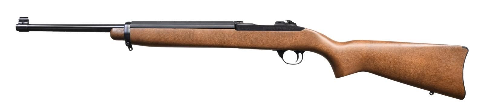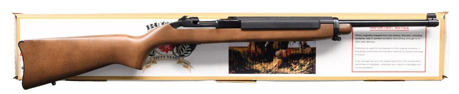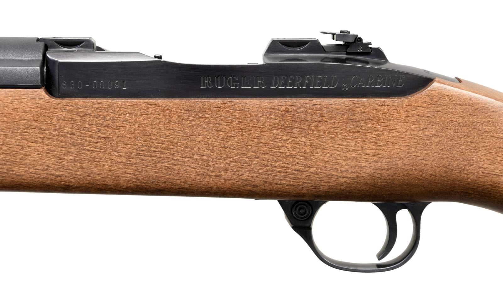 DEERFIELD CARBINE SEMI-AUTOMATIC RIFLE WITH MATCHING FACTORY BOX, FORMER HENRY RODESCHIN COLLECTION. Cal. 44 Mag. S# 630-00091. Bbl. 18 1/2". Model 99/44 Deerfield Carbine semi-automatic rifle mfg. by Ruger in 2000. The left side of the bbl. is marked with the S# "630-00091" ("91" being former Ruger factory employee Henry Rodeschin's personally assigned factory S#), followed by "RUGER DEERFIELD CARBINE", with the cal. designation marked over the top of the receiver, behind the rear sight assembly. Metal components exhibit a blue finish overall. Plain smooth wood pistol grip stock with black polymer Ruger-branded handguard. Brass-beaded blade front sight with flip-up aperture rear sight. MAGS: 1 4-rd. UNATTACHED ACCESSORIES: matching factory box. CONDITION: extremely fine, with metal components retaining virtually all of their original factory blue finish, exhibiting some very light wear on the bolt and on the right side of the receiver from cycling of the action. Brilliant mirror bore, exhibiting sharp and well-defined rifling throughout. Wood stock and polymer handguard are extremely fine overall. Box shows some exterior wear but otherwise remains sturdy and serviceable. An extremely fine and low S# Ruger Model 99/44 Deerfield Carbine that one will find to be an extremely difficult example to upgrade from. PROVENANCE: Amoskeag Auction Company, Auction #136, Lot #1148. (23-6782/MLW). MODERN. $1,500-2,250.