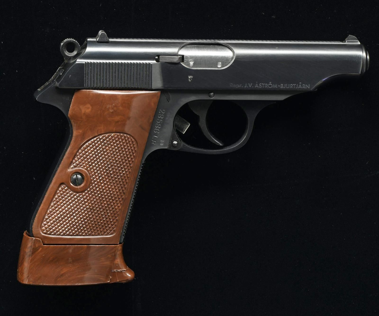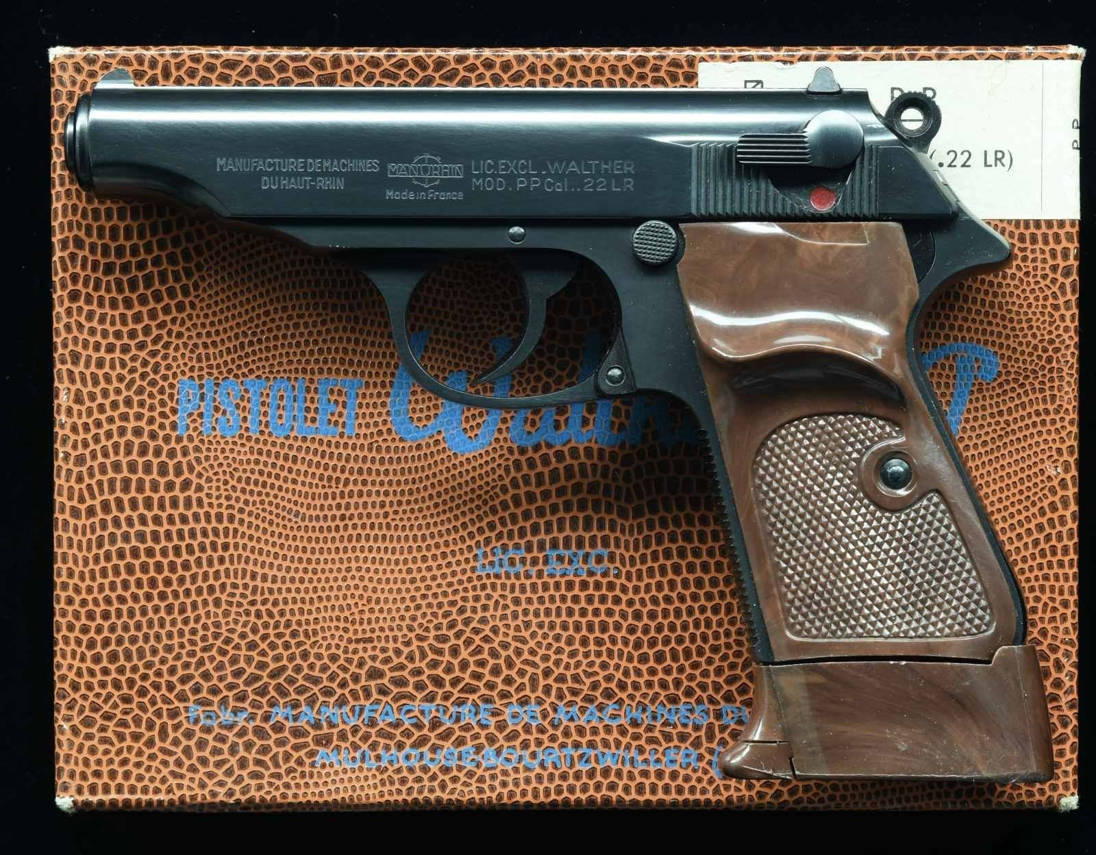 SEMI-AUTOMATIC PISTOL WITH MATCHING FACTORY BOX & PAPER TEST TARGET. Cal. 22 LR. S# 28586LR. Bbl. 3 7/8". Model PP semi-automatic pistol mfg. under license by Manurhin in France. The left side of the slide exhibits Manurhin's mfg. information, followed by "LIC.EXCL. WALTHER/ MOD. PP Cal..22 LR". The right side of the slide is marked "Repr.J.V.ASTROM-BJURTJARN", indicating this this example was at one time imported into Sweden for use by the Swedish police. French proofs are present on the right side of the slide, chamber, and frame. Metal components exhibit a high polish blue finish. Frame is mounted with 2 piece checkered mottled brown plastic thumb rest grips. Mag. is fitted with a matching color full size plastic grip extension. Front grip strap is factory grooved. MAGS: 2 -10rd. UNATTACHED ACCESSORIES: matching factory box containing matching factory paperwork, matching factory paper test target, 1 spare mag., standard left grip panel (without thumbrest), cleaning rod, and original butt mounted lanyard loop lug, which would be correct for a Swedish police issued pistol. CONDITION: excellent, with metal components retaining bountiful amounts of their original factory blue finish overall. Brilliant mirror bore, exhibiting well defined rifling throughout. Grips show some light superficial marks from handling and storage, but are otherwise very good overall. Box is very good overall, with a couple of losses and a couple of taped repairs on the interior of the body. An excellent Swedish marked Manurhin Model PP pistol, that one would find to be a difficult example to upgrade from. PROVENANCE: The Collection of Gun Sport Ltd owned by Jon R. Thomas. (23-4259/MLW). CURIO. $1,000-1,500.