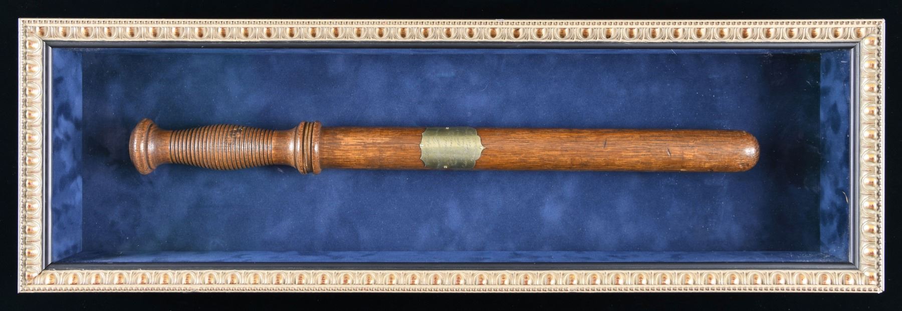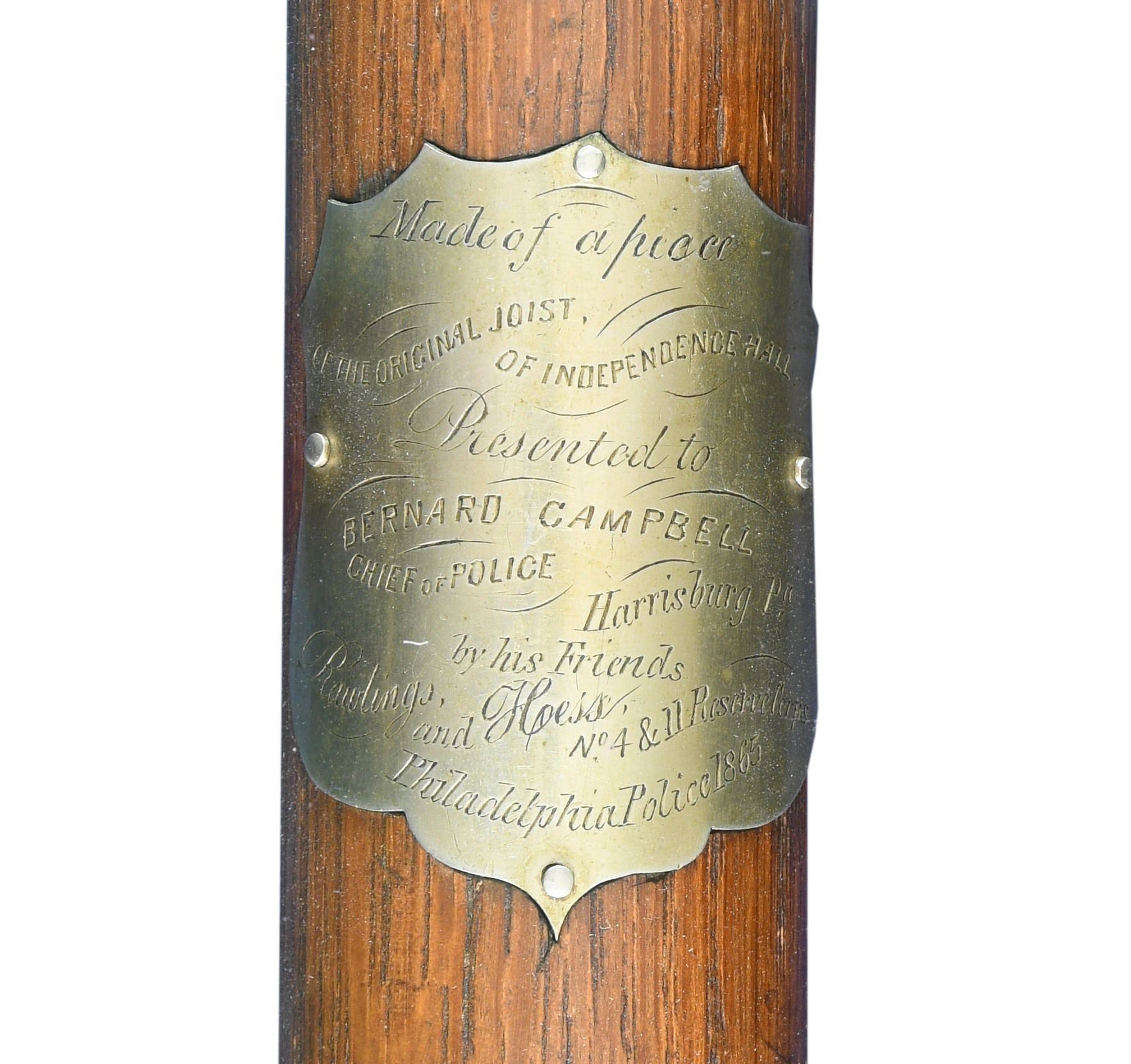 POLICE TRUNCHEON MADE FROM AN ORIGINAL JOIST FROM INDEPENDENCE HALL. This wonderfully historic police truncheon measures 20 1/2" in length and is approximately 1 3/8" in diameter at the barrel. It was expertly turned from wood cut from an original joist of Independence Hall in Philadelphia, Pennsylvania where the Declaration of Independence was signed in 1776 by America's Founding Fathers. The barrel measures 14 1/8" and the grip measures 6 3/8" in length from ferrule to pommel. On the barrel, about 4" down from the grip, is a silver shield measuring approximately 2" x 2" that is engraved "Made of a piece OF THE ORIGINAL JOIST OF INDEPENDENCE HALL Presented to BERNARD CAMPBELL CHIEF OF POLICE Harrisburg Pa by his friends Rawlings, and Hoess, No. 4 & 11 Reserve Corps Philadelphia Police 1865". Many newspaper articles of the period can be found touting the exploits of Bernard Campbell and his capabilities as a detective. One famous incident recalls the recovery of a diamond breast pin valued at $400, during the period, from a gang of pick-pockets in Philadelphia. One can hardly imagine a more historic truncheon being associated with one of America's most famous early policeman as well as being turned from wood of Independence Hall where our nation was born. UNATTACHED ACCESSORIES: a copy of the article relating the recovery of the $400 diamond breast pin. CONDITION: the truncheon remains in superb condition as it is housed in a modern custom display case that measures 26 1/2" x 8 1/2". The engraving on the silver shield remains crisp and clear. (02-23324/BF). $1,800-3,000.