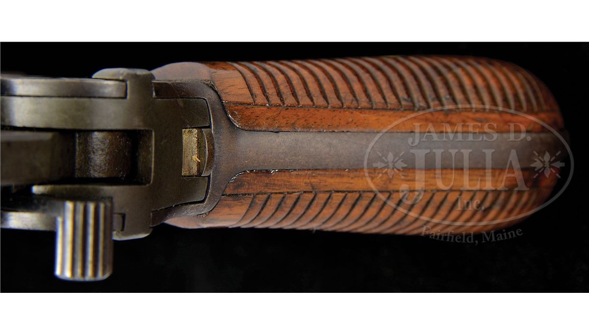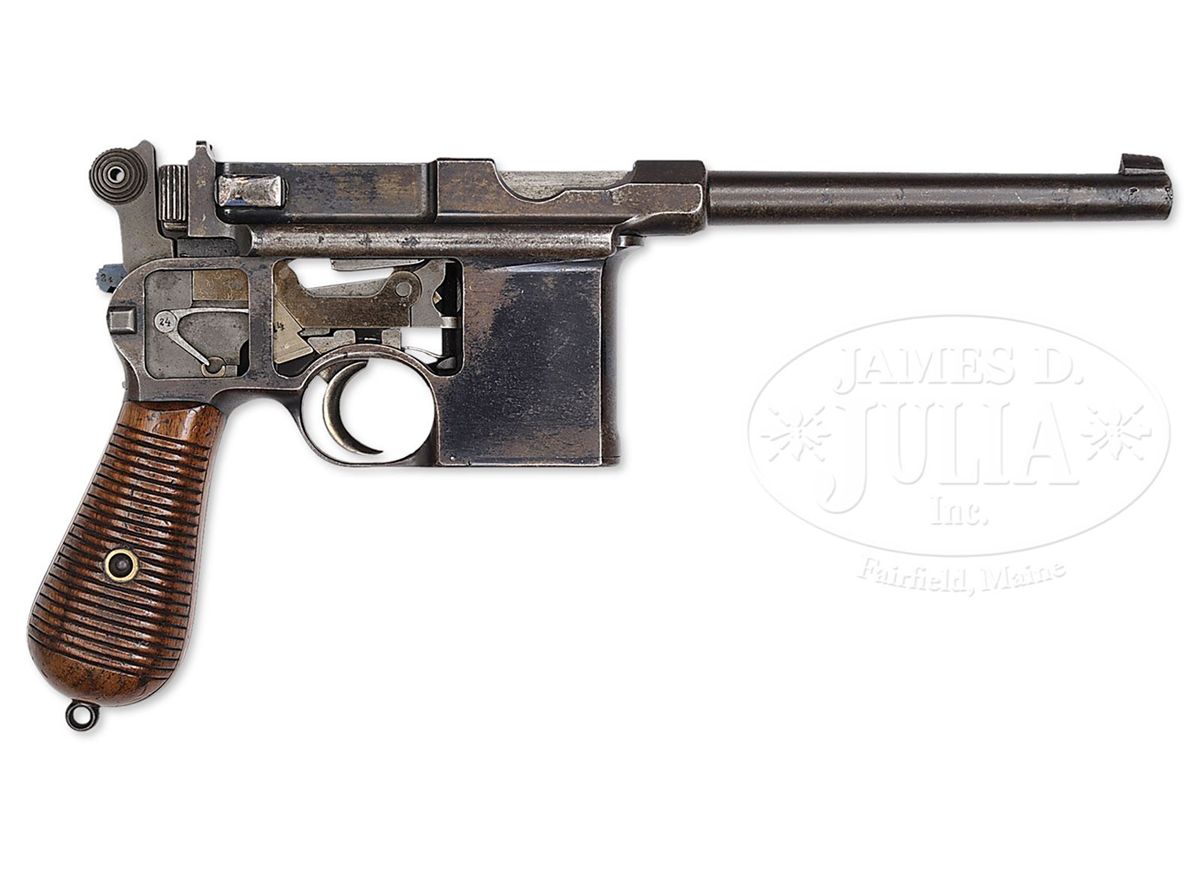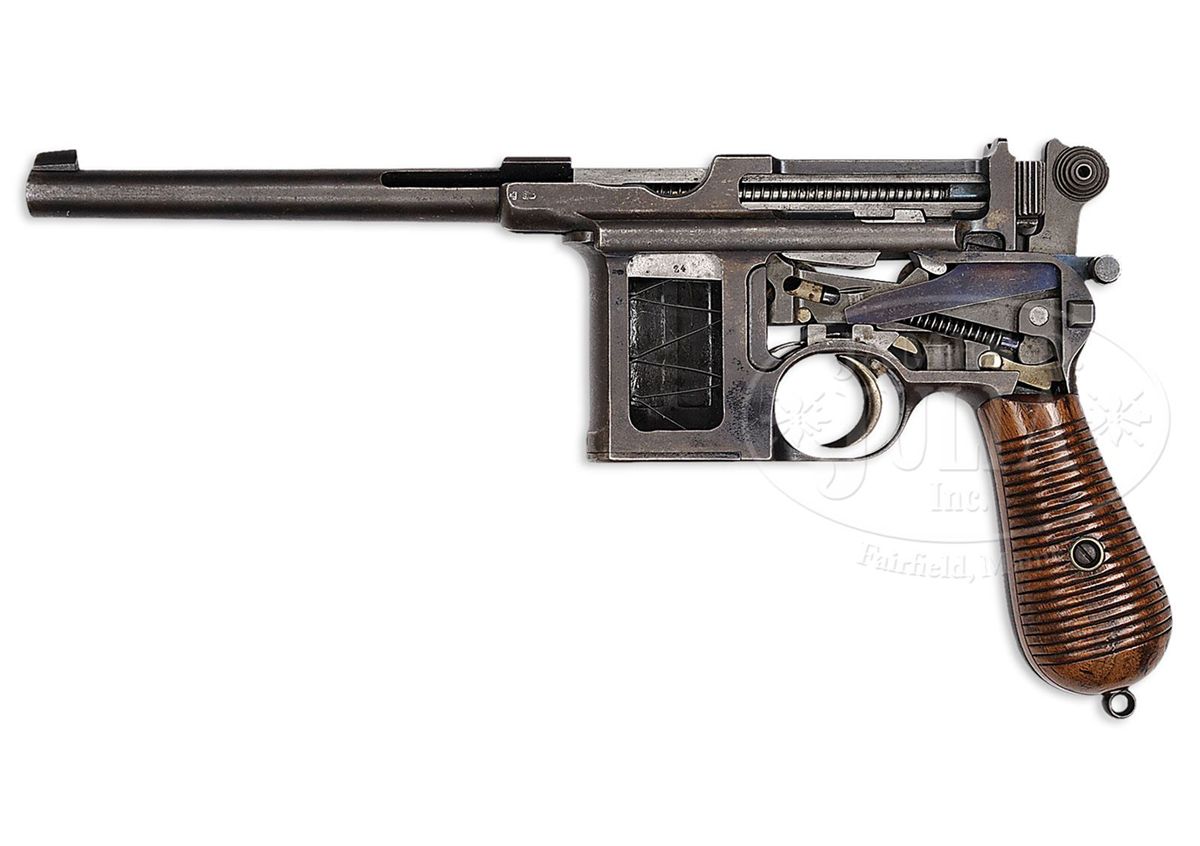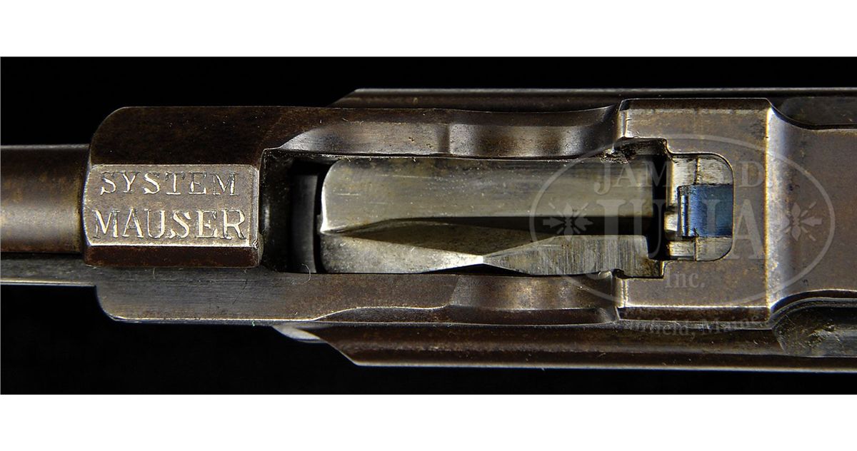 SN 24. Caliber 7.63mm. Mauser made fewer than 200 System Mauser marked guns with a stepped bbl. This well known gun, having been shown in many of Joseph Schroeder's displays, is consecutive to #23 pictured in the Erickson & Pate text. "System Mauser" is hand inscribed in capital letters on top of the chamber. A Crown U appears on the left side of the bbl extension. This example has a 5.5" bbl and a fixed rear sight. As true for the early stepped bbl System Mausers, the rails are solid, the locking block has a single locking lug and the front and back straps are slightly rounded to better contour with the grips. This example has a narrow backstrap that was never cut for a shoulder stock. The grips were apparently taken from a later production Conehammer as they are serrated rather than checkered but internally matched with number H24. PROVENANCE: Joseph J. Schroeder, Jr. Collection. CONDITION: Although much of the surface has transitioned to a mellow patina, the remaining blue is more lustrous than usual, more in keeping with the mirror blue of an early Zig-Zag than the usual C96 rust blue. The safety retains at least 90% of its original fire blue and most of the strawed small parts have over 95% of their original luster. This high condition is shared by the original varnish on the grips. Only a few stepped bbl System Mausers are known to be in private hands and there are even fewer factory cutaways. Only three are known to this reviewer. An exceedingly rare and all original C96 that would highlight the most sophisticated collection. 4-48540 LMA24