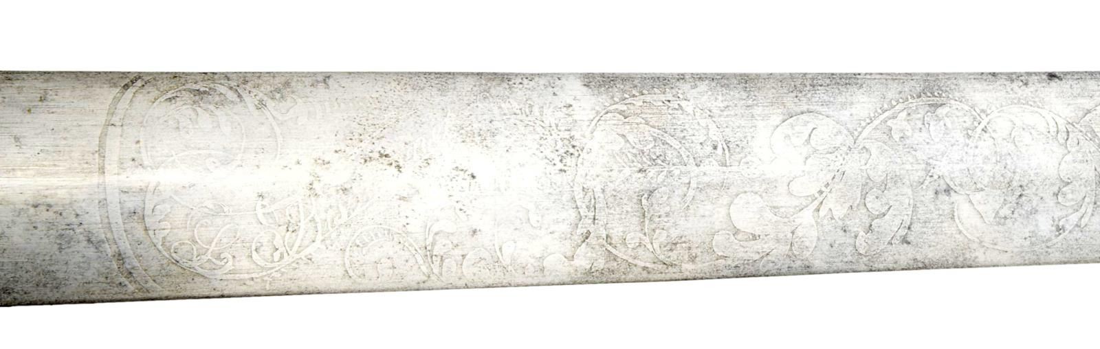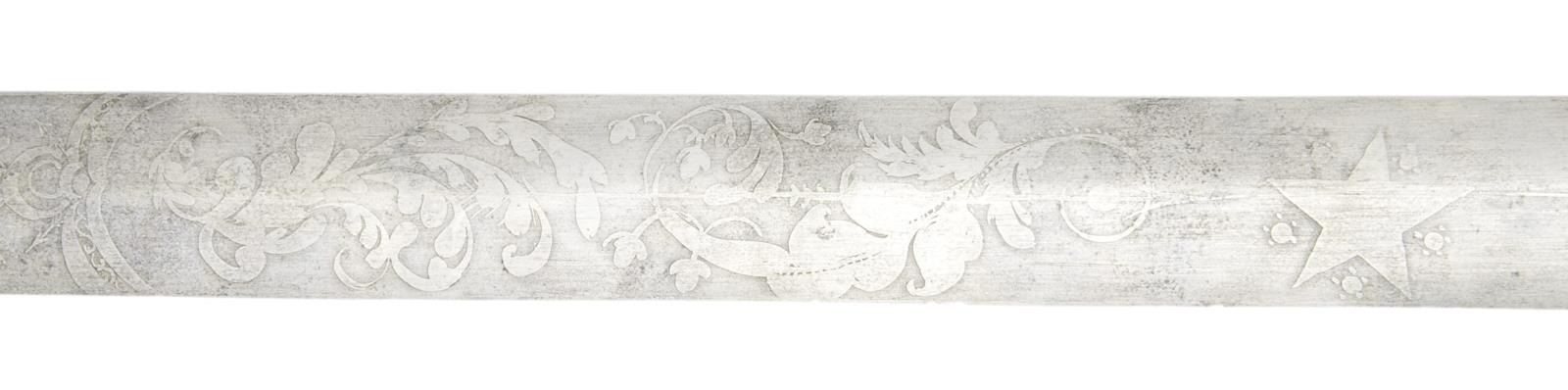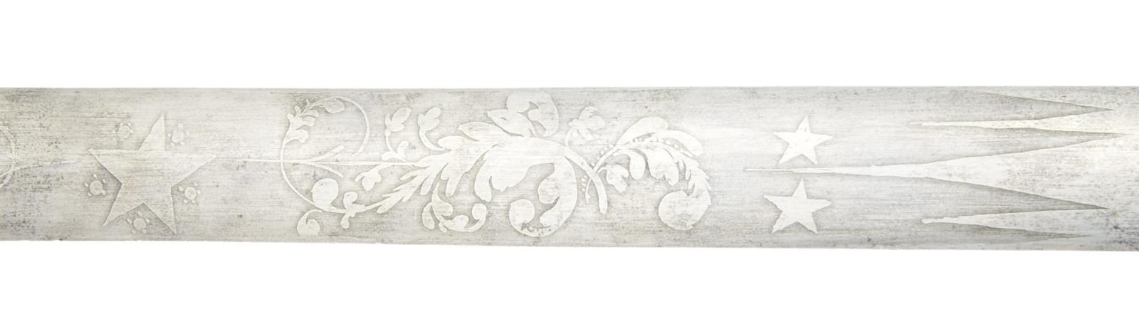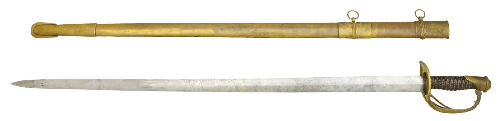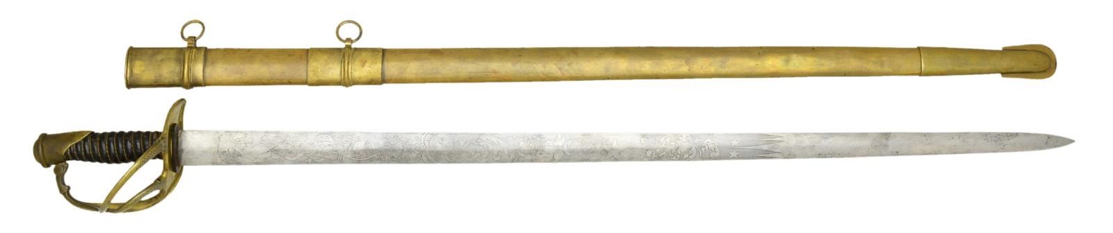 ALA MADE CONFEDERATE CAVALRY OFFICER’S SABER. 36.25" Double-edged straight blade, 1.4" wide, .25" thick at ricasso, finally etched in over 20" panels with Bissonnet’s distinct use of stars and arrows integrated with whimsical foliate scrolls with 5" panel “Patrie . Honneur”. Blade is also signed near ricasso in same elegant script in scroll near ricasso: “L. Bissonnet / maker / Mobile Al”. Hilt is decorated with large relief cast clamshell on top of quillon, each branch has cast relief foliate design. Heavy solid brass scabbard has braised-on 3" throat and middle mount with raised ring bands and braised 6" drag. The only other example known is in collection of Missouri Historical Society at St. Louis carried by Capt. A. G. Moore of the 38th Alabama Volunteers; that sword is identical except for leather veneer on scabbard body. Louis Bissonnet (1823-1889) immigrated to the United States in 1857 through the port of Mobile Alabama. After the war he set up shop as a jeweler and gunsmith in Houston Texas till his death. Very few swords survive bearing his name. Foot officer swords often misidentified as Leech & Rigdon when unsigned, but distinctive etching is his “fingerprint”. CONDITION: very good to fine overall. Complete and original brass hilt and scabbard retain small traces of gold wash in protected areas, otherwise smooth light-medium mustard patina. Blade is overall gray with scattered areas of staining with all etching fully discernible, protective leather washer appears original. Wood grip retains most of its black painted surface with tight twisted brass wire wrap. Scabbard is sound with matching patina with few scattered minor dents and scratches. (02-14940/JS). $40,000-60,000.