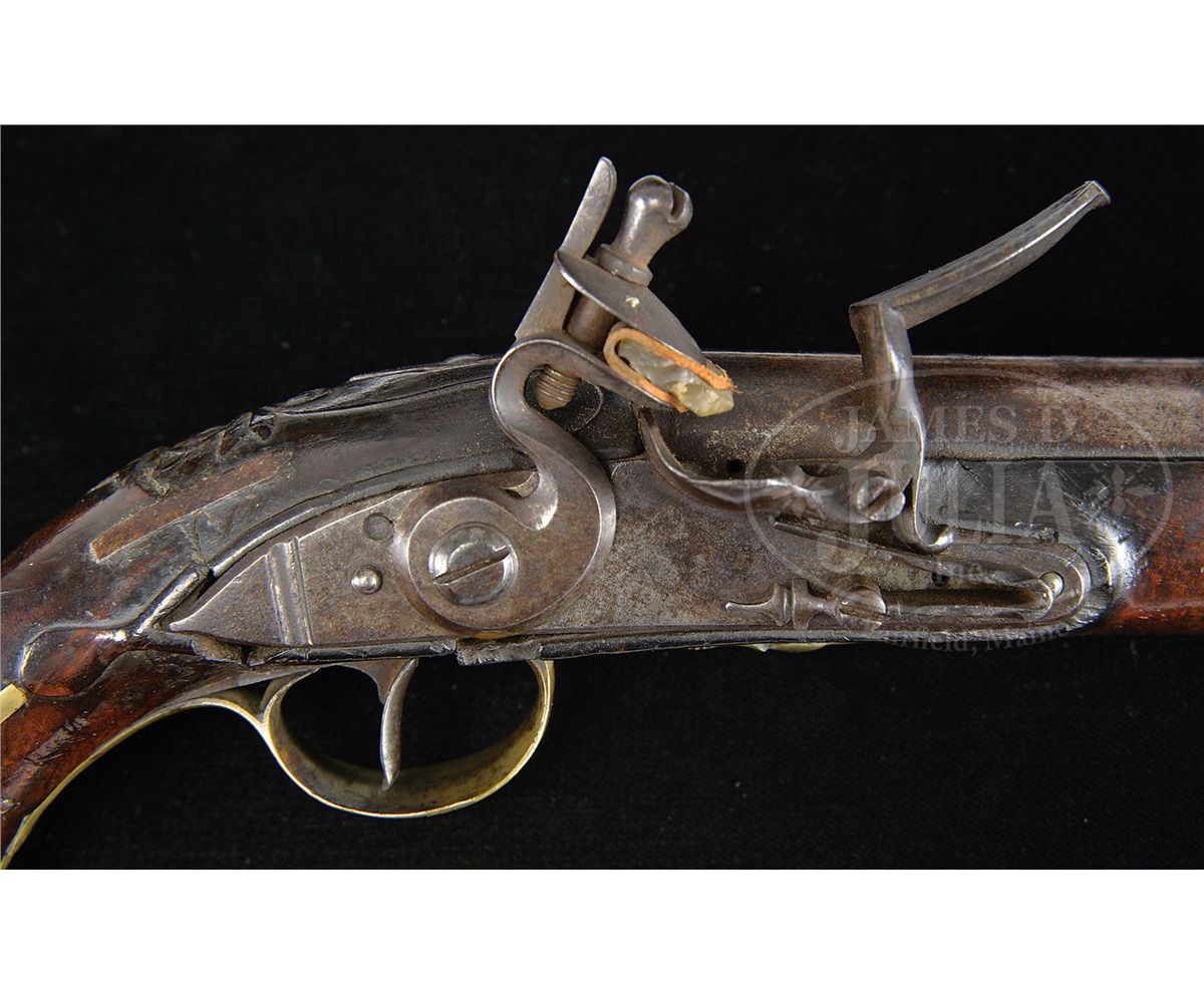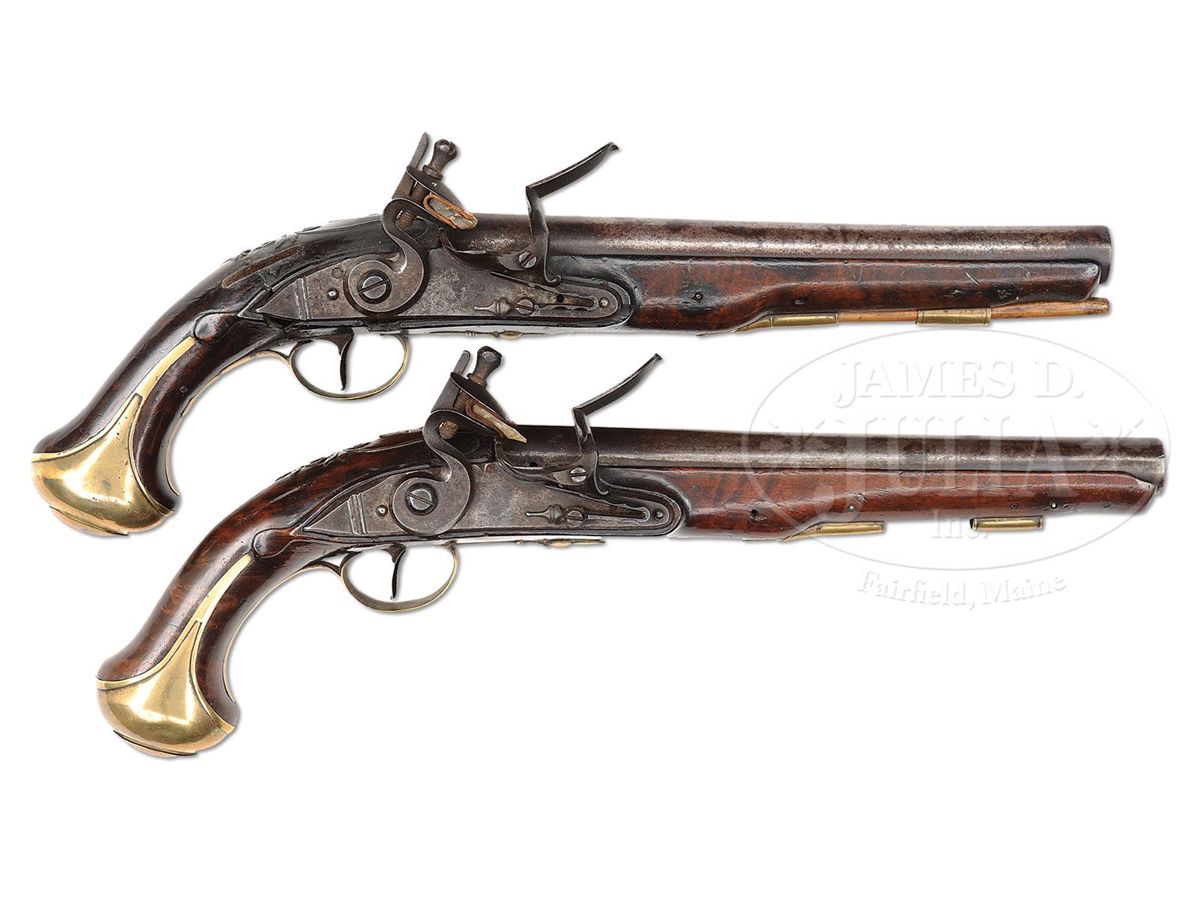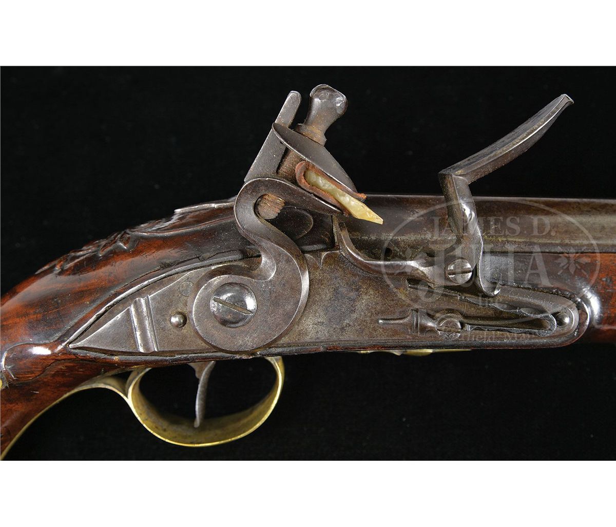 NSN. 9" rnd .67 Cal smooth unmarked bbls. American walnut stocks are nicely relief carved with superb high relief floral and leaf carving typical of the style of Peter Berry to rear of bbl tangs with small beaver tails to rear of lock and sideplate mortices. Wooden stocks have been identified by the United States Department of Agriculture Forest Products Laboratory as American black walnut of the American Revolutionary War period as documented in their letter of June 20, 1966. Brass horned sideplates are typical of Berry's work and are identical to those pictured on the cover of The American Rifleman Magazine in July of 1972 belonging to Revolutionary War soldier Robert Roberts. Brass buttcaps extend nicely up both sides of grips and the trigger guards and ramrod ferrules are correct for American Revolutionary War style. These exceptionally rare and outstanding pistols rank among the most important pairs remaining in today's collections. This pair was obviously made for a man of importance, most likely an officer during the Revolution. They are completely American throughout and fashioned after a sophisticated English style of the period. Made circa 1770-1780. This pair of pistols won the Kentucky Rifle Associations "Best Pistol" Silver Award in 1977. Peter Berry is listed as a gunsmith in the tax records of Heidelberg Township, Dauphin County, in the years 1786-1789. Berry died in 1795. Peter Berry carved beautiful designs of sea scrolls with some flowers in high relief on his rifles similar to the flowers carved in the tang carving on these pistols. This pair of pistols were pictured in the first edition of the Texas Gun Collectors Associations Antique Arms Annual publish in 1971 in an article entitled "Matched Pairs of Flintlock Pistols" by Tom Seymour. This is truly a spectacular pair of early American Pistols! PROVENANCE: Frank Sujansky Collection. CONDITION: These pistols are completely untouched condition throughout displaying outstanding American workmanship by a fine Pennsylvania maker. Metal has nice, even age brown and pistols are mechanically sound. One stock is excellent throughout; the other had been cracked through high on handle at rear of lock during it's period of use and was repaired in period with two very narrow inletted iron strap repairs to make it sound. There is a chip under lock at center which has not been restored or redone so that the pistols can remain in their as found "attic" condition. 4-49446 RG51