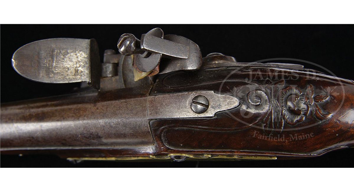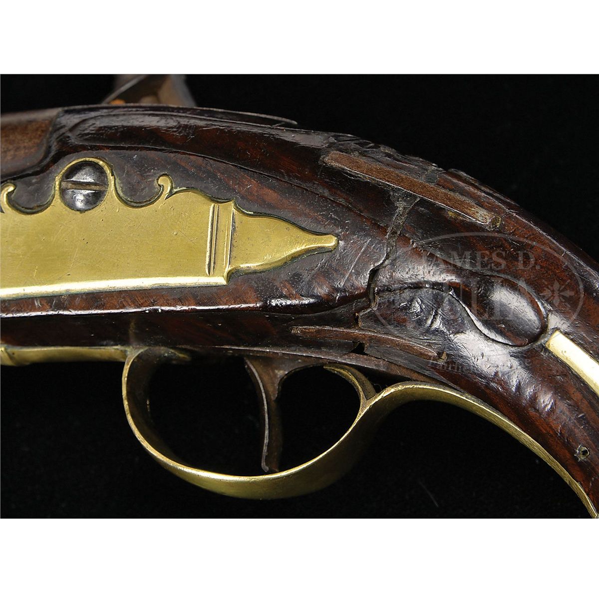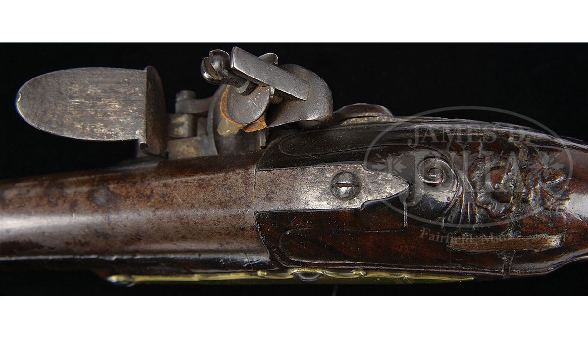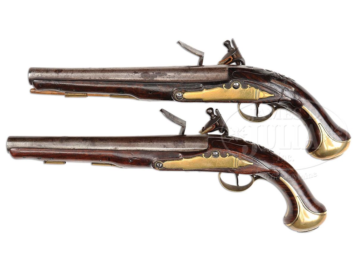 NSN. 9" rnd .67 Cal smooth unmarked bbls. American walnut stocks are nicely relief carved with superb high relief floral and leaf carving typical of the style of Peter Berry to rear of bbl tangs with small beaver tails to rear of lock and sideplate mortices. Wooden stocks have been identified by the United States Department of Agriculture Forest Products Laboratory as American black walnut of the American Revolutionary War period as documented in their letter of June 20, 1966. Brass horned sideplates are typical of Berry's work and are identical to those pictured on the cover of The American Rifleman Magazine in July of 1972 belonging to Revolutionary War soldier Robert Roberts. Brass buttcaps extend nicely up both sides of grips and the trigger guards and ramrod ferrules are correct for American Revolutionary War style. These exceptionally rare and outstanding pistols rank among the most important pairs remaining in today's collections. This pair was obviously made for a man of importance, most likely an officer during the Revolution. They are completely American throughout and fashioned after a sophisticated English style of the period. Made circa 1770-1780. This pair of pistols won the Kentucky Rifle Associations "Best Pistol" Silver Award in 1977. Peter Berry is listed as a gunsmith in the tax records of Heidelberg Township, Dauphin County, in the years 1786-1789. Berry died in 1795. Peter Berry carved beautiful designs of sea scrolls with some flowers in high relief on his rifles similar to the flowers carved in the tang carving on these pistols. This pair of pistols were pictured in the first edition of the Texas Gun Collectors Associations Antique Arms Annual publish in 1971 in an article entitled "Matched Pairs of Flintlock Pistols" by Tom Seymour. This is truly a spectacular pair of early American Pistols! PROVENANCE: Frank Sujansky Collection. CONDITION: These pistols are completely untouched condition throughout displaying outstanding American workmanship by a fine Pennsylvania maker. Metal has nice, even age brown and pistols are mechanically sound. One stock is excellent throughout; the other had been cracked through high on handle at rear of lock during it's period of use and was repaired in period with two very narrow inletted iron strap repairs to make it sound. There is a chip under lock at center which has not been restored or redone so that the pistols can remain in their as found "attic" condition. 4-49446 RG51