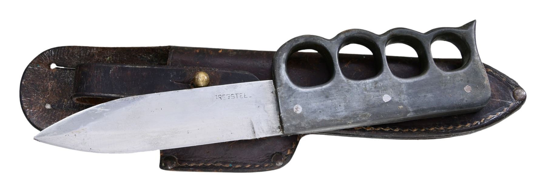 UNIT, OPERATION JAYWICK, GREGSTEEL KNUCKLE KNIFE WITH ORIGINAL SHEATH. Fighting knife mfg. by GREGSTEEL for the Australian Z Special Unit during World War II. The Z Special Unit was formed for clandestine operations behind Japanese lines in South East Asia, and conducted a total of 81 covert operations via insertion by parachuting or submarine. This knife, mfg. for Operation Jaywick is marked with a mostly legible "GREGSTEEL" on the right side of the blade. The spear point pattern blade measures 5 7/16" from the point to the bottom of the ricasso, with an overall length of 10 3/8". Handle is comprised of 2-piece non-ferrous metal grips, which feature a knuckle duster that terminates in a pointed end at the front. UNATTACHED ACCESSORIES: original unmarked brown leather sheath with brass retention strap stud. CONDITION: blade is good, having been cleaned and polished at one time, exhibiting some light pitting, some sharpening marks, as well as a nick to one of the edges. Handle retains a dark gray patina overall. Sheath remains malleable, exhibiting mild wear, some superficial marks from handling and storage, as well as some light age related cracking and crazing overall. A very nice example of an extremely rare Australian Z Special Unit knife, produced for Operation Jaywick. (02-24412/MLW). $1,200-1,800.