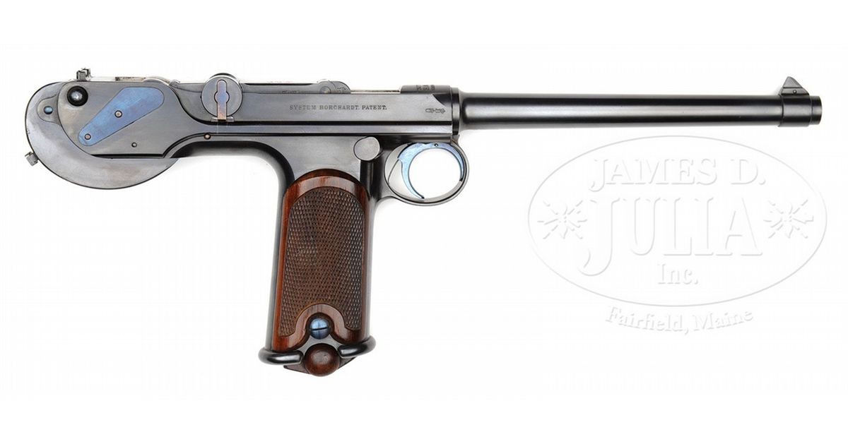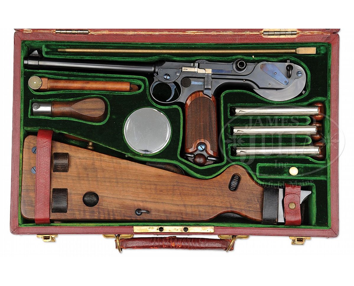 SN 266. Cal. 7.63 MM Borchardt. Spectacular cased Borchardt pistol that was presented to General Porfirio Diaz, President of Mexico. Pistol is a standard early Borchardt by Loewe with 7-1/2" tapered rnd bbl, fixed sights with the Loewe marking over the chamber and patent markings on the toggle link. Bottom of the bbl has "BUG" Proofs with additional Proofs on the right side of the frame, which is also marked "SYSTEM BORCHARDT.PATENT." Pistol has standard appointments with matching numbered, checkered walnut grips and has an orig magazine in the well numbered "447". Accompanied by its orig diamond pattern red leatherette case that has brass corner reinforcements and a cut corner gilded plate in the lid, 4" x 1-3/4", engraved in period script "Exmo Senor / Don Porfirio Diaz / Presidente de la Republica Mexioana". Front of the case has a latch at each end with a matching leather wrapped carrying handle whose brackets and all other exterior furniture are gilded. Interior is bright green velvet lined and French fitted in the bottom for the pistol, a matching numbered shoulder stock with attached black leather holster, a matching numbered attachable cheekpiece, three orig matching numbered magazines, a wooden dummy magazine/cleaning hold-open with concealed brass cleaning rod and oiler, the orig wooden handle for screw driver blades, two screw driver blades, two orig punches, and a nickeled 2-pc parts box that appears to have contained lubricant. Covered compartment in the right front contains the screwdriver blades and punches. All together a truly spectacular presentation set. Parts of this pistol are pictured on pp. 116 & 519 of Volume 1 of The Borchardt and Luger Automatic Pistols, Gortz & Sturgess. P. 116 illustrates the chamber markings of this pistol and also illustrates the Berlin Crown/BUG Proof mark locations. The caption states that this is one of a small group of Borchardt pistols with Proof marks on the underside of the bbl and right side. P. 1428 of Volume 3 of the referenced publication illustrates the entire case set, open to show contents, the top with presentation plaque and the front of the case. The authors indicate that the diamond grained red Moroccan leather covered case is an extremely rare factory deluxe presentation case and that the fittings are all regular 93 case items that have been gilded. The authors speculate that this set may have been a presentation by the manufacturer as an inducement for adoption of their products or that it may have been a presentation to President Diaz from Kaiser Wilhelm II or possibly by the German government. President Diaz was apparently very friendly with the Kaiser and initially sought asylum with the Kaiser's family when he was deposed in 1911 following the 1910 Mexican Revolution. The authors state that there is one other example like this known that had associations with the Vickers Company of England. Jose de la Cruz Porfirio Diaz Mori was born Sept. 15, 1830 in Oaxaca, Mexico, trained for the priesthood at age 15, and in 1850 studied law. Prior to that, however, in 1846 Mr. Diaz participated in the Mexican-American War of 1846. In 1855 he joined a band of guerrillas fighting Santa Anna who was attempting a resurgence to power. His star began its medioric rise in 1862 when he became a Brigade General fighting the French. Between 1863-1867 he was offered various positions of power under Emperor Maximilian, which he refused. In 1868, when President Juarez came to power, he resigned his commission and returned home. But again in 1871 he led a revolt against Juarez, but was defeated and again returned home after accepting amnesty. In 1874 he was elected to Congress but again led a revolt in 1875, and in 1876 he led a failed attempt to unseat President Tejada, which failed. In November, 1876, he returned to Mexico from the U.S. and again faced the government forces whom he defeated, and in May, 1877 was elected President of Mexico, a title which he held off and on for over 30 more years. By 1908 Mexico's government had become corrupt and oppressive and in 1910 Francisco Madero led a revolt which overthrew President Diaz causing him to flee to Spain in May, 1911. He died July 2, 1915, in exile in Paris and is buried there. In 1938 his 430-pc collection of arms was donated to the Military College of Canada, in Kingston, Ontario. PROVENANCE: Collection of Dr. Geoffrey Sturgess. CONDITION: Extremely fine plus, pristine new and unfired. Overall retains about 99% crisp orig factory blue with bright fire blue on all the appropriate parts. Grips are crisp with a few crushed diamonds on the right side, otherwise shows no additional flaws and retains virtually all of its crisp orig varnish. Case has some slight losses of leather covering on the lid with a few light handling and storage nicks and scratches and retains virtually all of its remaining orig red finish. Mounts on the case retain most of their orig gilding. Interior is equally pristine as are the accessories. Holster is intact with crackled surface and some minor finish losses around the toe but interior is as new showing no sign the pistol has ever been inserted. 4-52097 JR408