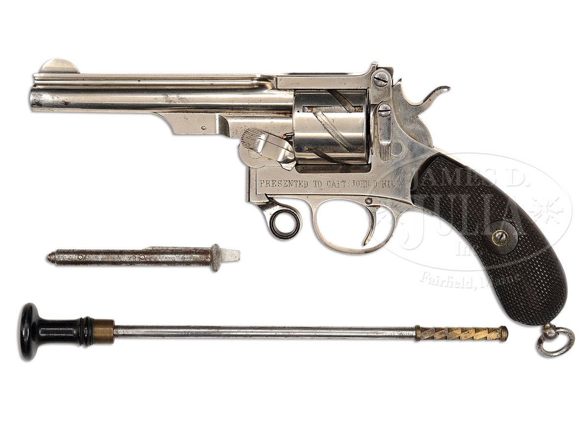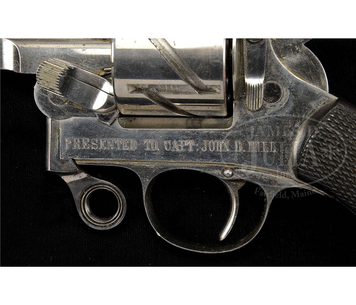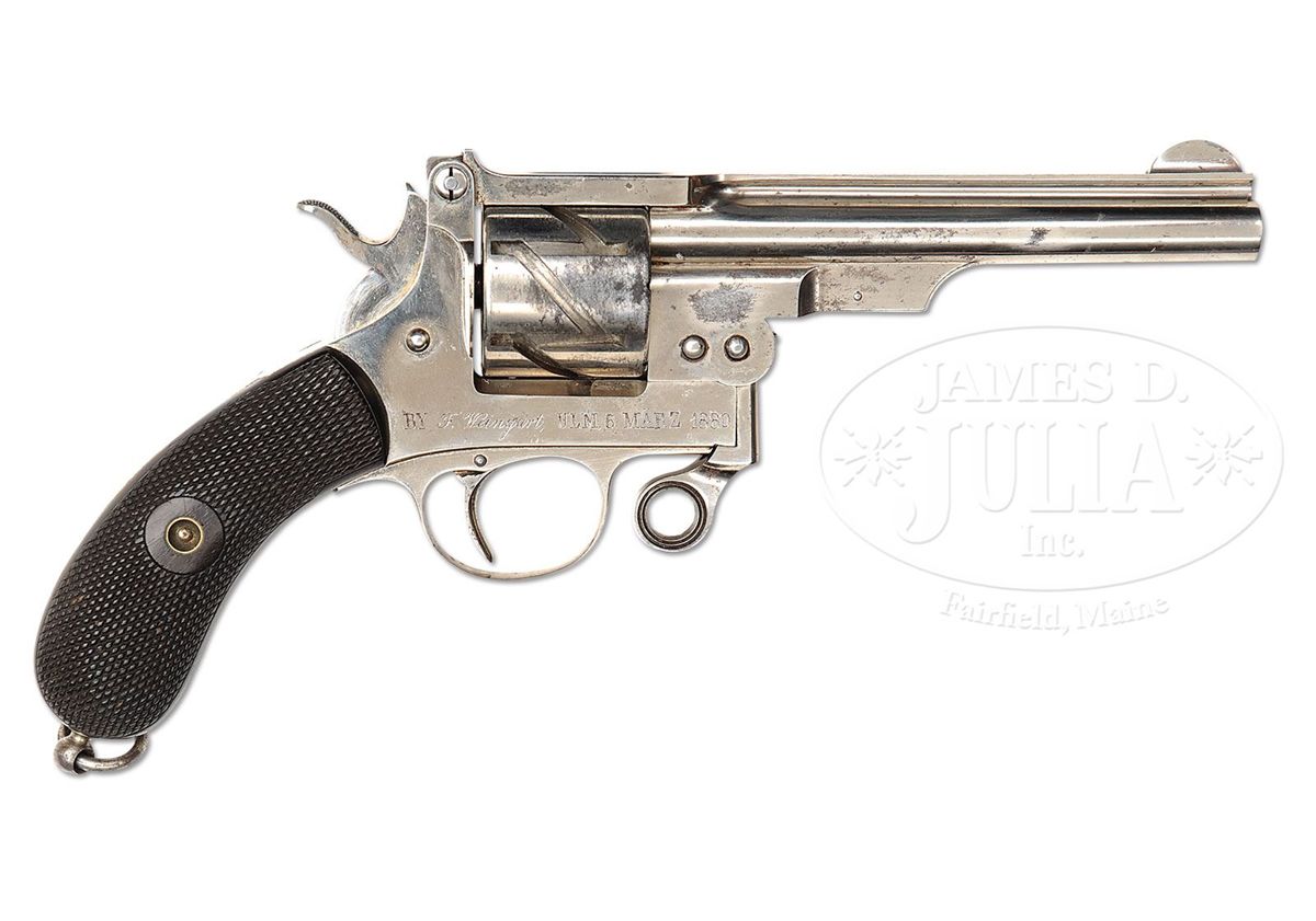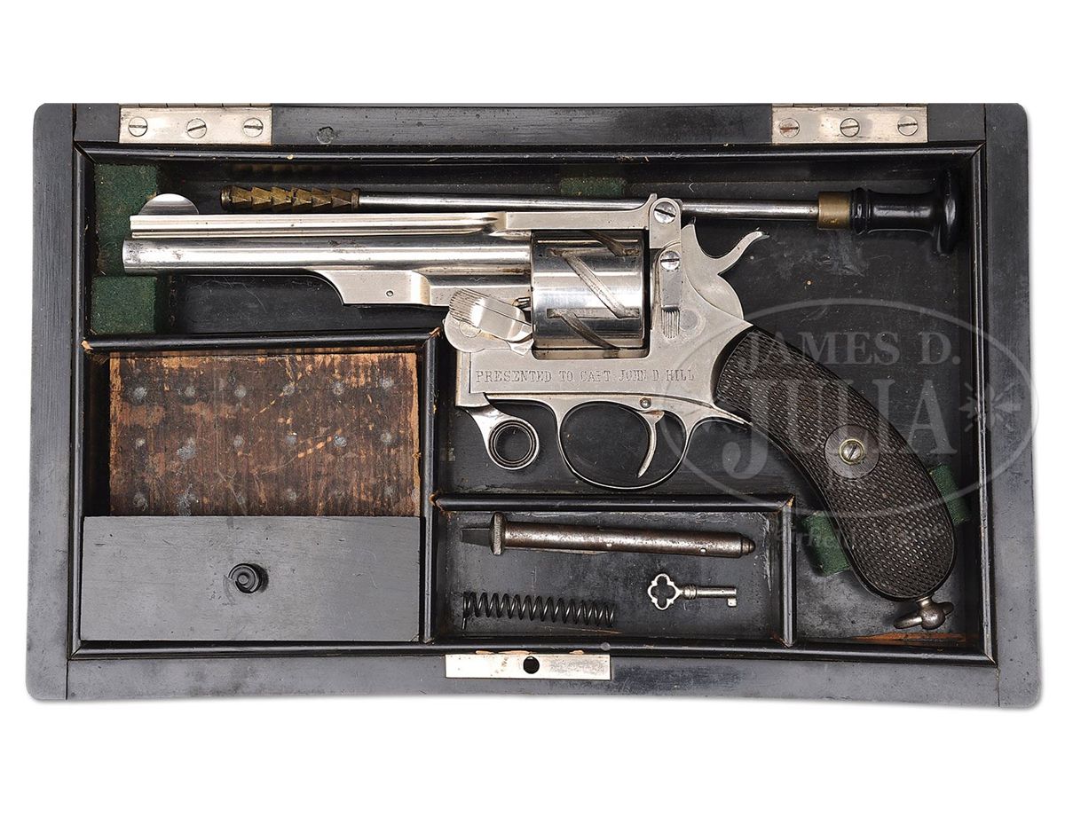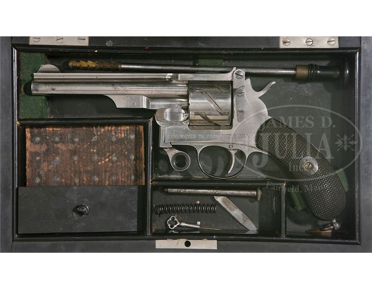 SN 1798. Cal. 10.6 Rimmed. Nickel finish with 5-5/16" keyhole shape bbl that has integral front sight and fixed rear sight in the top strap. Grip frame is bag shaped and mounted with full checkered wood grips matching numbered to this revolver. Left side of frame behind the recoil shield has a small thumb lever which is the keeper for the hammer pin. Left side of frame is engraved "PRESENTED TO CAPT: JOHN D. HILL" and the right side "BY F. Weingart, ULM, 6. MARZ 1880". Cylinder is very unusual with Z-shaped grooves around outer diameter which are, in fact, rotating grooves for the cylinder. Cylinder rests on a pin which is in a groove and when the hammer is cocked it advances the cylinder to the next chamber for firing. Left front side of the bbl lug has a small thumb latch which is a cylinder lock that fits into a notch in the extended front rim of the cylinder and if not latched the bbl cannot be opened. Few of these revolvers have shown up in the U.S. because of their European calibers which are not generally available in the U.S. Accompanied by its orig black painted birch presentation case, compartmented in the bottom for the revolver on green felt rests, an ebony handled steel & brass cleaning rod, a open compartment in the front left which at one time contained 30 orig cartridges and a covered compartment which contains an unusual combination tool with folding screwdriver blade and functioning key. Accompanied by the original US lawyer's estate document dated 3/19/1927 identifying the revolver as part of the estate of Frederica S. Hill. PROVENANCE: Collection of Dr. Geoffrey Sturgess. CONDITION: Very fine. Overall retains about 93-95% strong orig nickel with a few cleaned spots of light rust. Grips are fine showing light diamond point wear. Mechanics are crisp, bright shiny bore. 4-52178 JR391