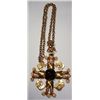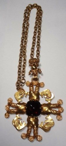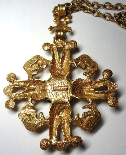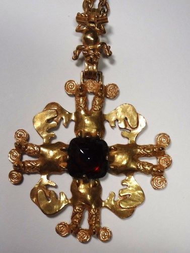 Famous Designer Larry Vrba worked for Castlecliff from 1970-1972 so that is how old this stunning pendant is. It is huge, just like many of the others Larry Vrba designed. Blood red stone in the center, Chain is 26" long. Pendant is 5" long. Very interesting piece! Est Value $395.00 to $495.00
