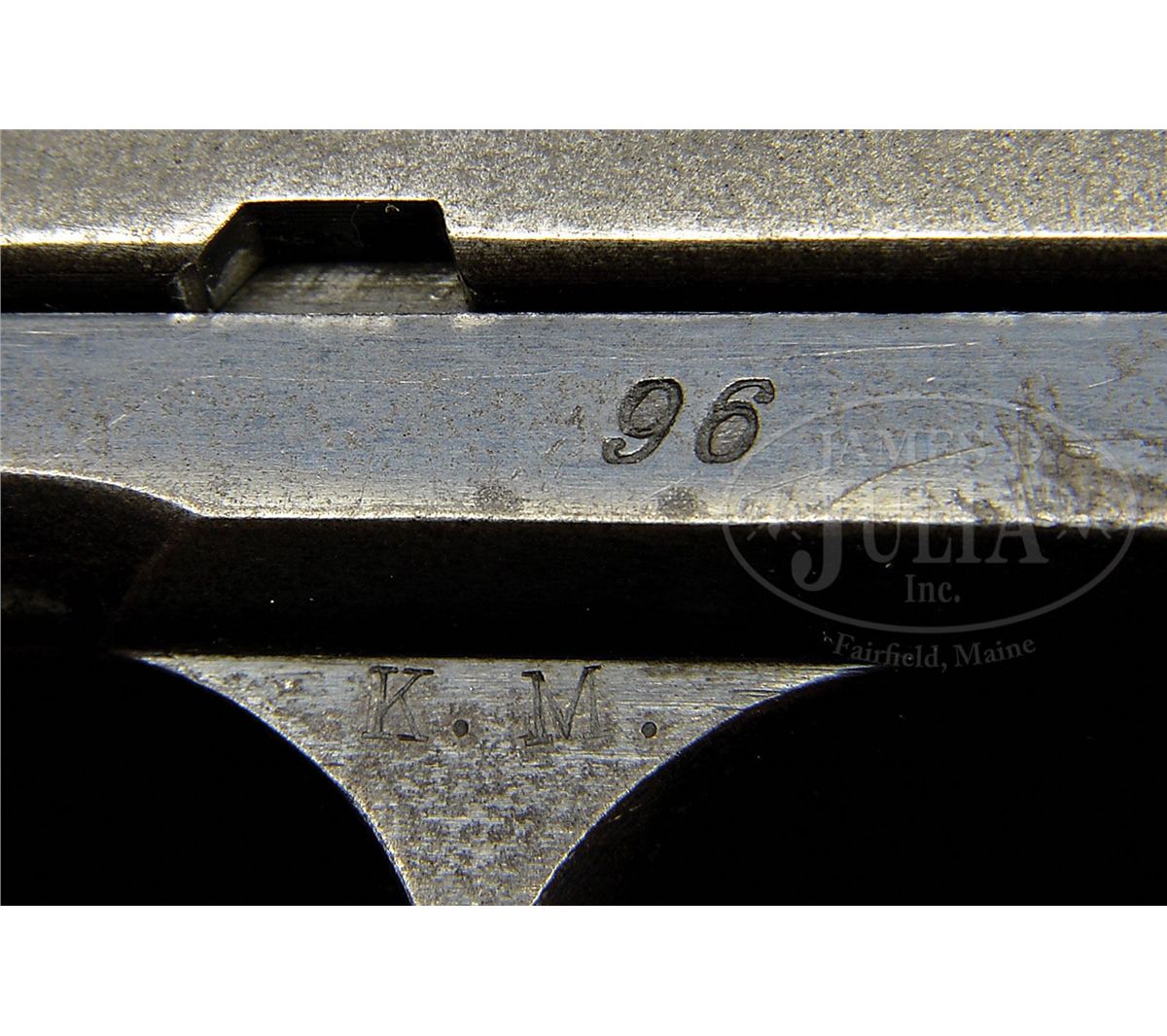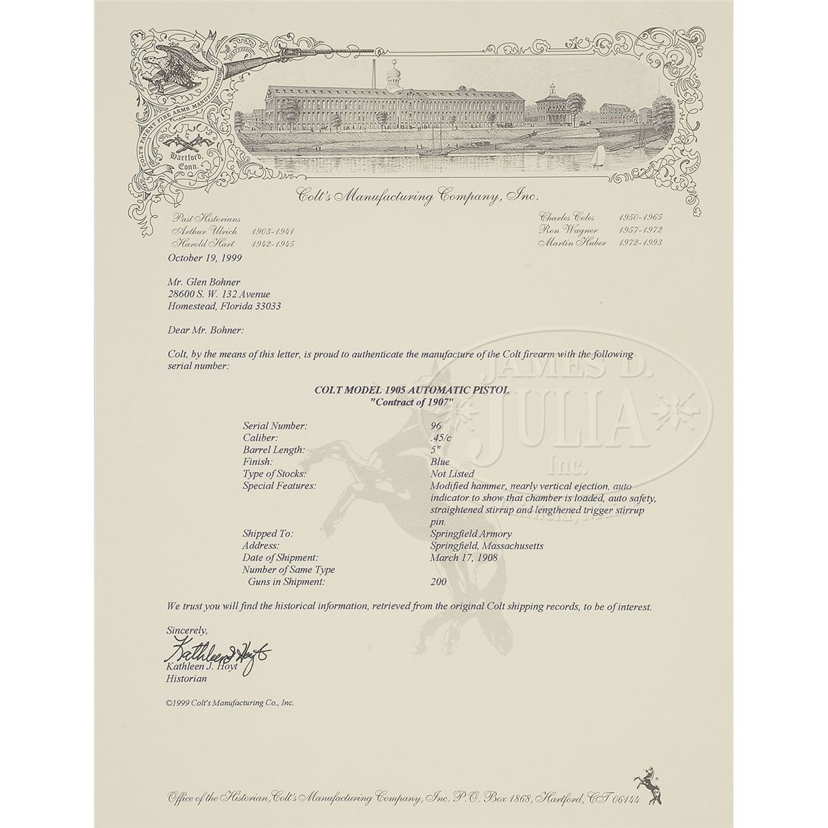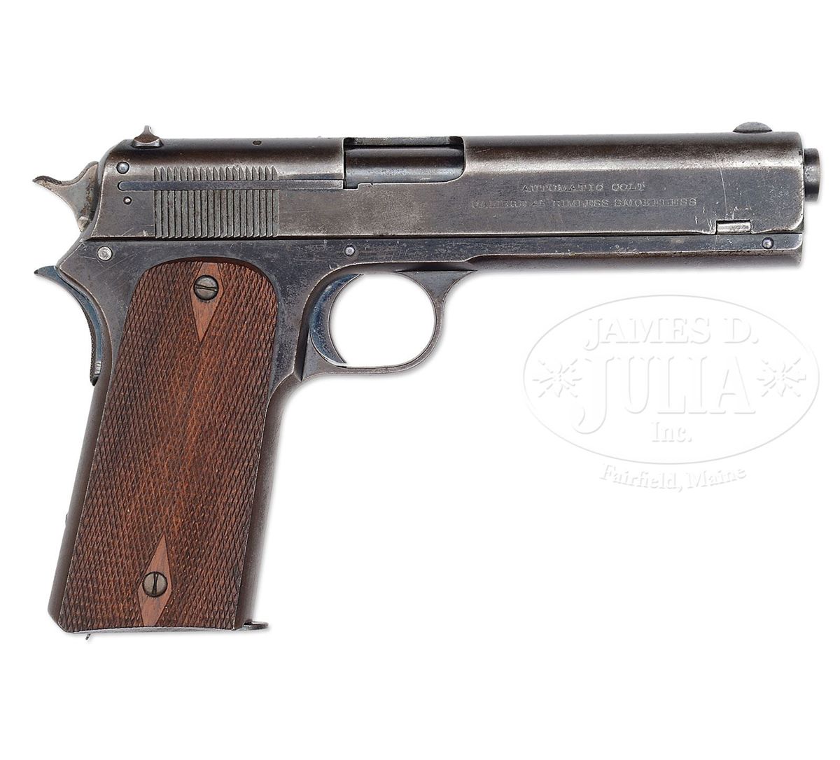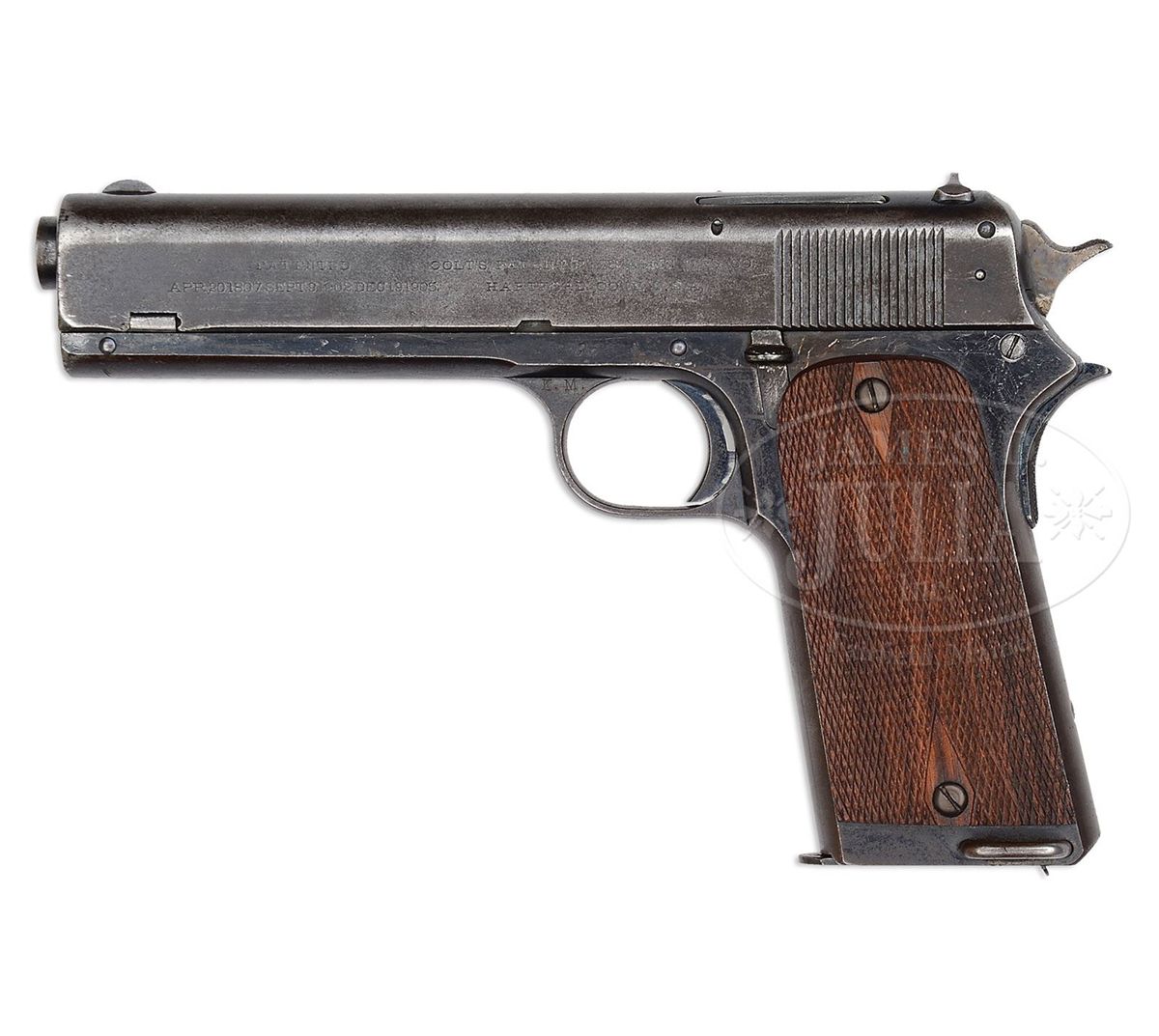 SN 96. Cal. 45 ACP. Blue finish with 5" bbl, fixed sights and standard 1905 markings on the slide. Frame has a slide stop on the left side and checkered grip safety with a lanyard loop in the left heel. Grip safety is of the later type with extended spur. It is mounted with diamond checkered walnut grips that are modern replacements. Left front web of the trigger guard is stamped with the inspector initials "K.M." (Major Kenneth Morton). According to The Book of Colt Firearms, Wilson, there were 200 of these pistols delivered to the government on the 1907 contract. Delivery of these pistols was in March 1908 after which they were issued to the 2nd, 4th and 10th Cavalry Regiments later that year. The pistols were deemed accurate but had numerous problems with failed parts including firing pins, sears, failures to feed or eject and occasionally pressing hard on the grip safety caused the pistol to fire. Colt eventually recalled all the pistols for further modification where they changed the hammers and added a longer spur to the grip safety, enlarged the ejection ports, installed heat treated sears and different loaded chamber indicators. By this time John Browning and Colt had learned substantial lessons from the test trials which they then incorporated into in the Models 1909 & 1910, which eventually led to the development of Model 1911 and, as the saying goes, the rest is history. The design of the 1911, for which this pistol was one of the predecessors and prototype, is still in production today, over 100 years later. Few Models 1907 survive today and of those completely orig specimens are rarely encountered. Accompanied by a Colt factory letter which identifies this pistol in Cal. 45 with 5" bbl, blue finish, type of stock not listed with special features "modified hammer, nearly vertical ejection, auto indicator to show that chamber is loaded, auto safety, straightened stirrup and lengthened trigger stirrup pin, shipped to Springfield Armory in March 1908 in a shipment of 200 guns. Also accompanied by a period mail order flap holster with rolled decorations and a brass closure stud. Additionally accompanied by one orig all blue magazine. Further accompanied by a sales receipt from a gun shop in Macon, Georgia where they had produced grips for this pistol. CONDITION: Fine. Slide retains dark blue around the sights with the balance thin blue mixed with plummy patina. Frame retains about 60% orig blue, strong in sheltered areas, turned brown on the front and backstraps. Hammer retains strong case colors. Grips are sound with sharp checkering. Magazine retains about 85% thinning orig blue. Mechanics are fine. Strong bright bore with scattered fine pitting. Holster shows some dryness and flaking with moderate to heavy soil. 4-47763 JR99