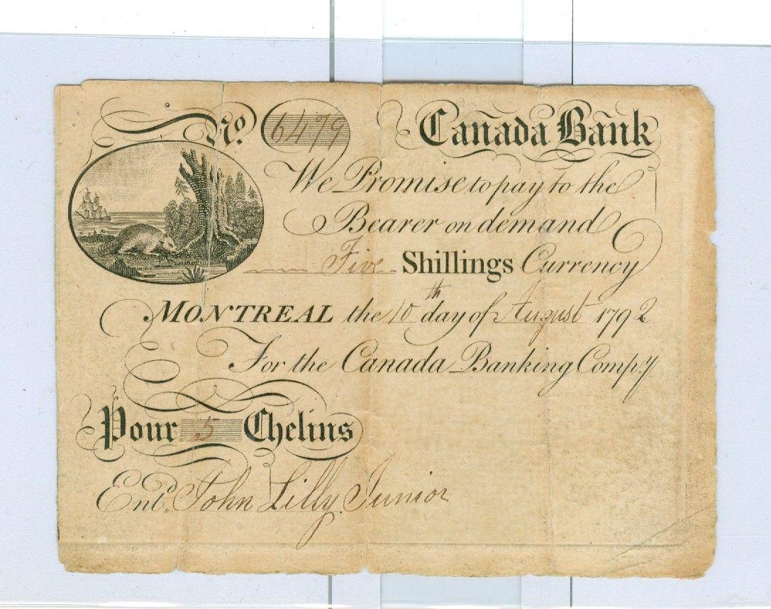 EXTREMELY RARE FUR TRADE CHARTERED NOTE! The canadian bank 1792 5 shillings #6479 CH-60-10-04 CCCS VF20. Canada Bank watermark, signed by John Lily junior. Only 5 examples known issued, three of them are in Museums and the other example was sold in 2008 CNA TCNC sale for $17250. This is the only example available to the public. A great opportunity to acquire a very rare 'FUR TRADE' note. Please note that the CCCS Holder shows comment of being repaired.